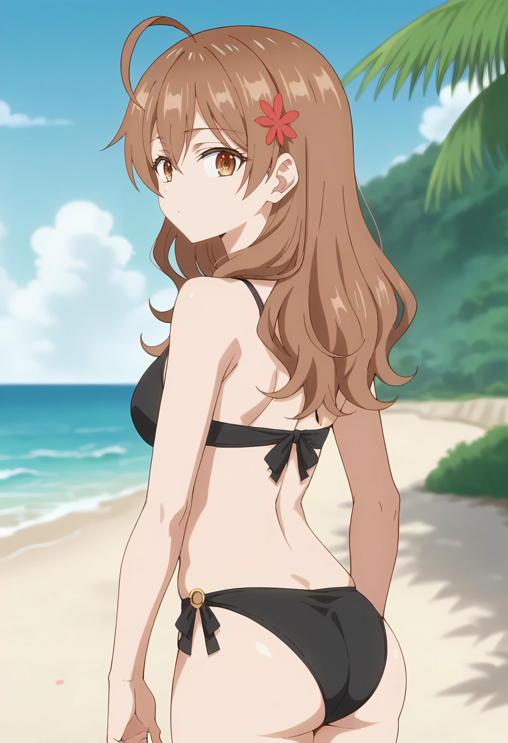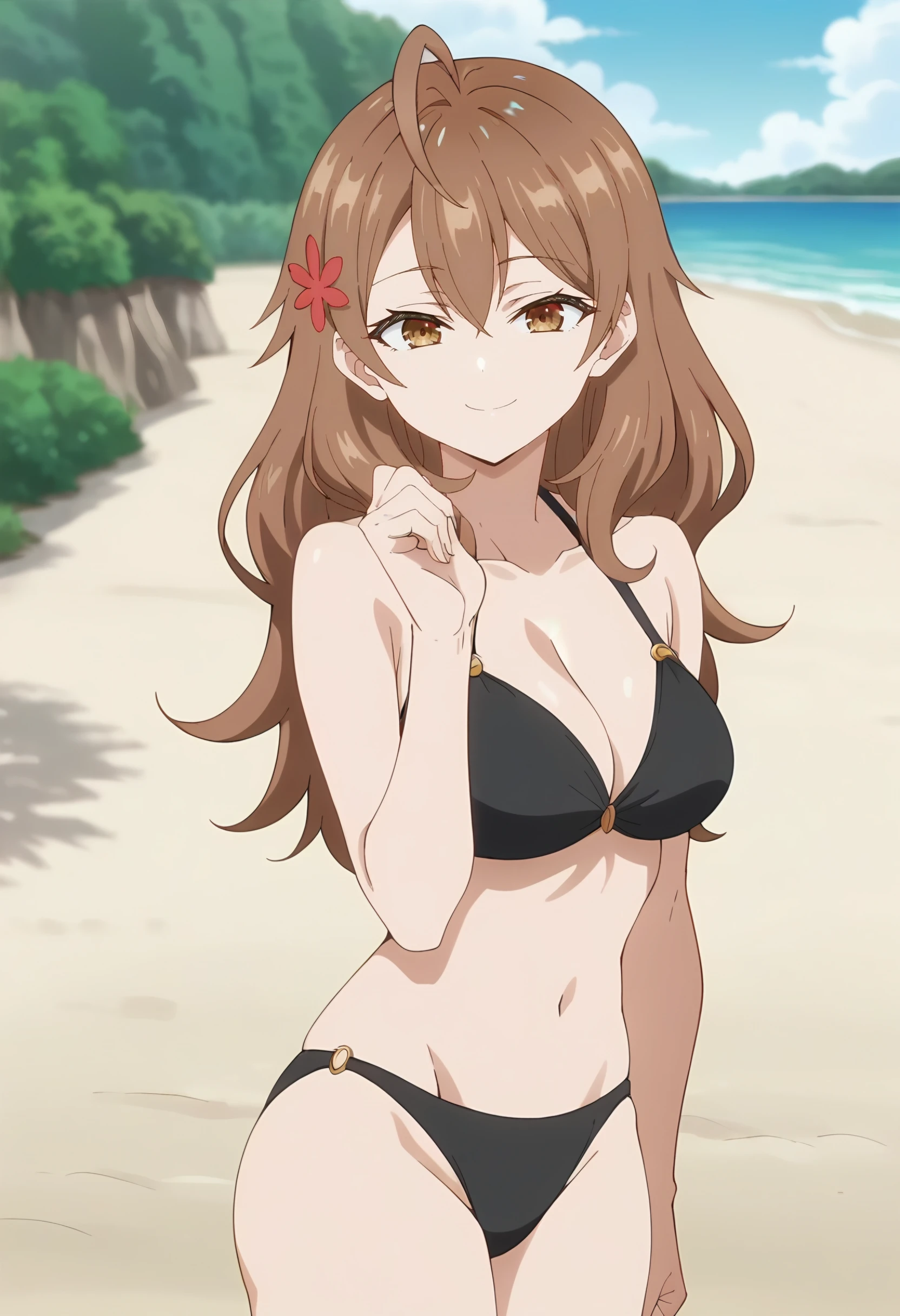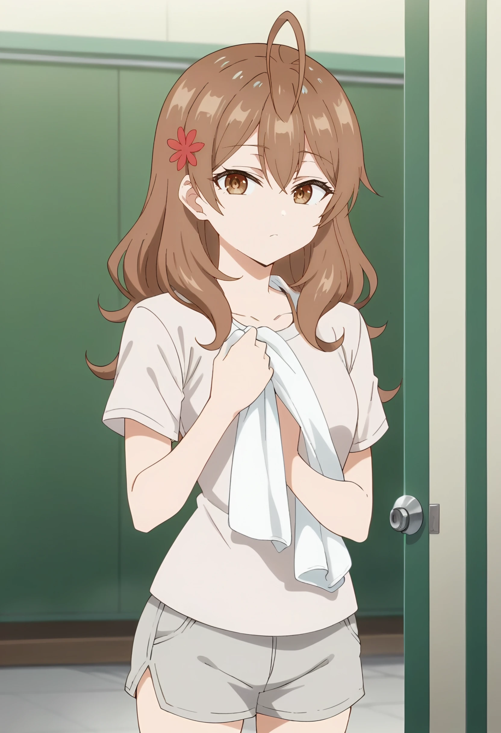 Maria Mikhailovna, 1girl, solo, brown hair, ahoge, brown eyes, long hair, hair between eyes, hair ornament,hair flower,