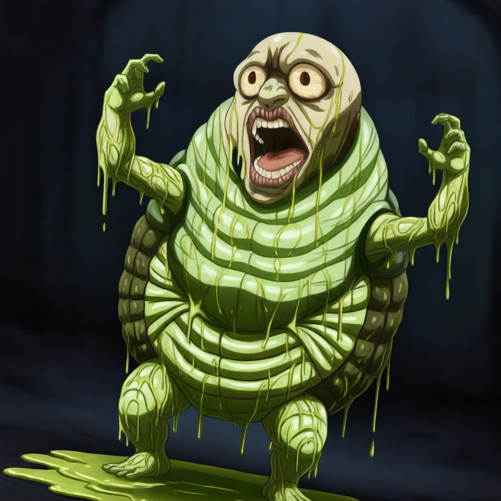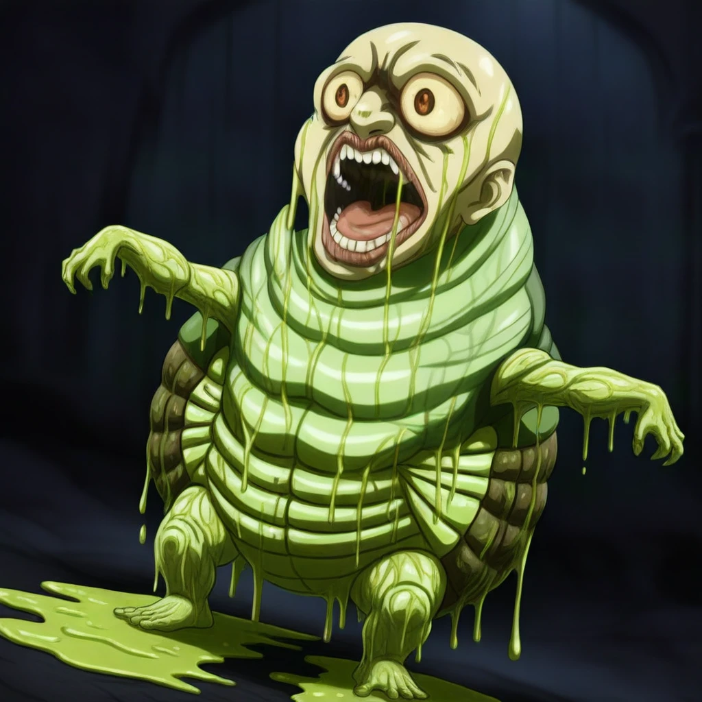 babbling slime humanoid monster, pale green segmented larva-like body, organic smooth anatomy, covered in viscous green slime, dripping mucus, glossy wet surface, bald head, bulging bloodshot eyes with small dark pupils, wide open screaming mouth, large fleshy lips with vertically striated grooves, uneven teeth, slime and drool dripping from mouth,
