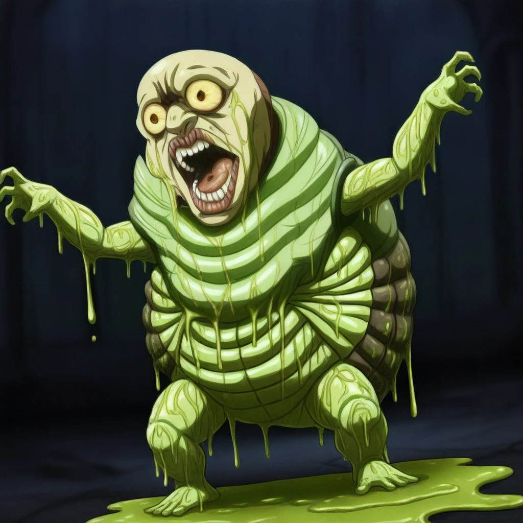 Larva3,monster, babbling slime humanoid monster, pale green segmented larva-like body, organic smooth anatomy, covered in viscous green slime, dripping mucus, glossy wet surface, bald head, bulging bloodshot eyes with small dark pupils, wide open screaming mouth, large fleshy lips with vertically striated grooves, uneven teeth, slime and drool dripping from mouth,