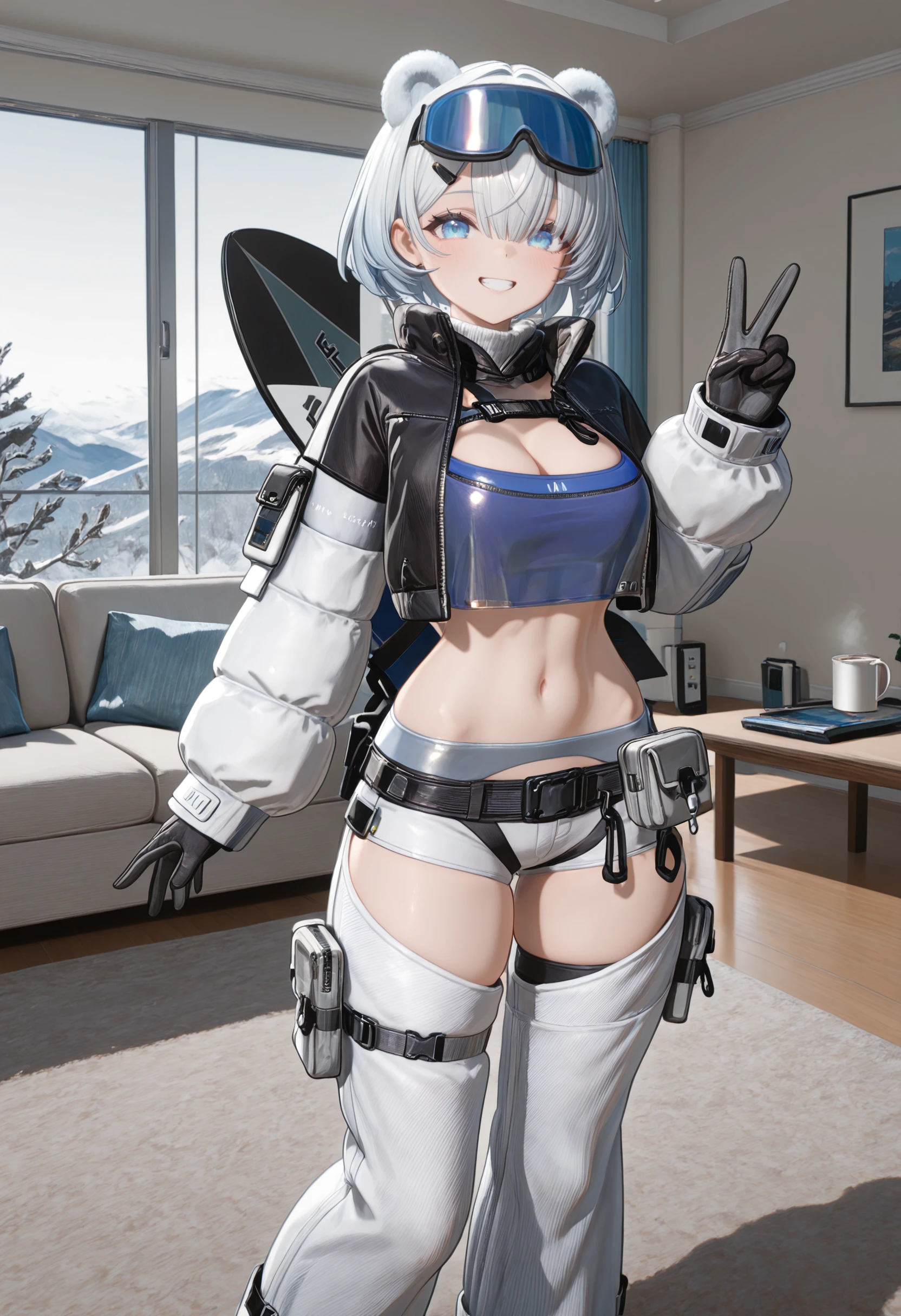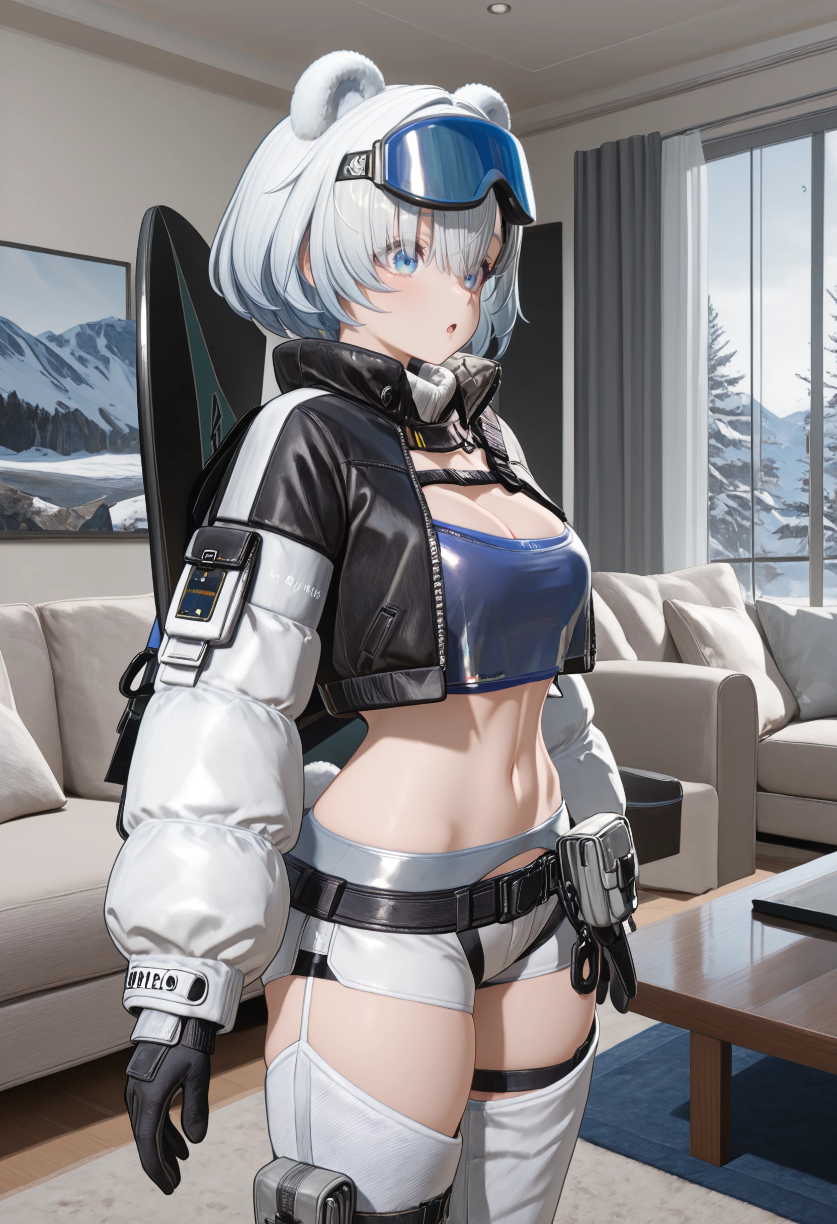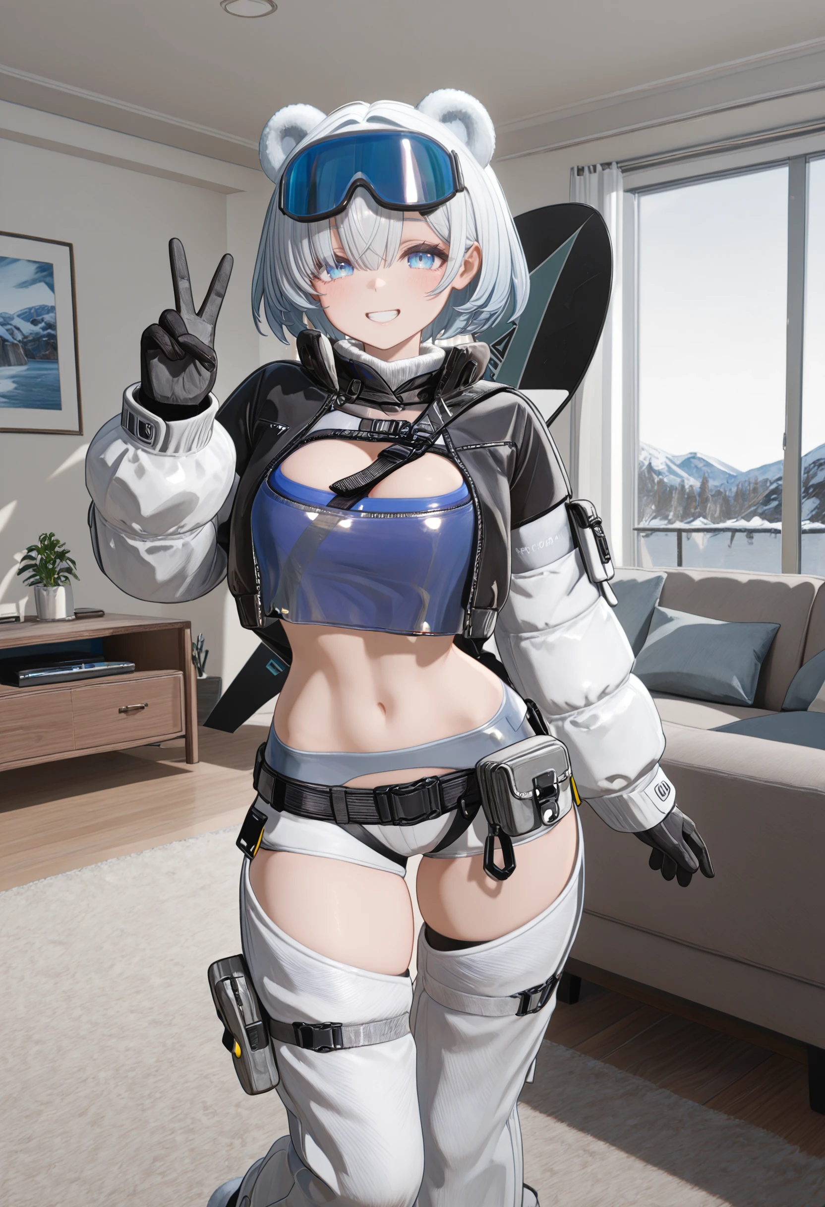 endfield style, 1girl, Snowshine, solo, polar bear ears, white hair, bangs, sideburns, short hair, blue snow glasses, glasses up, blue eyes,