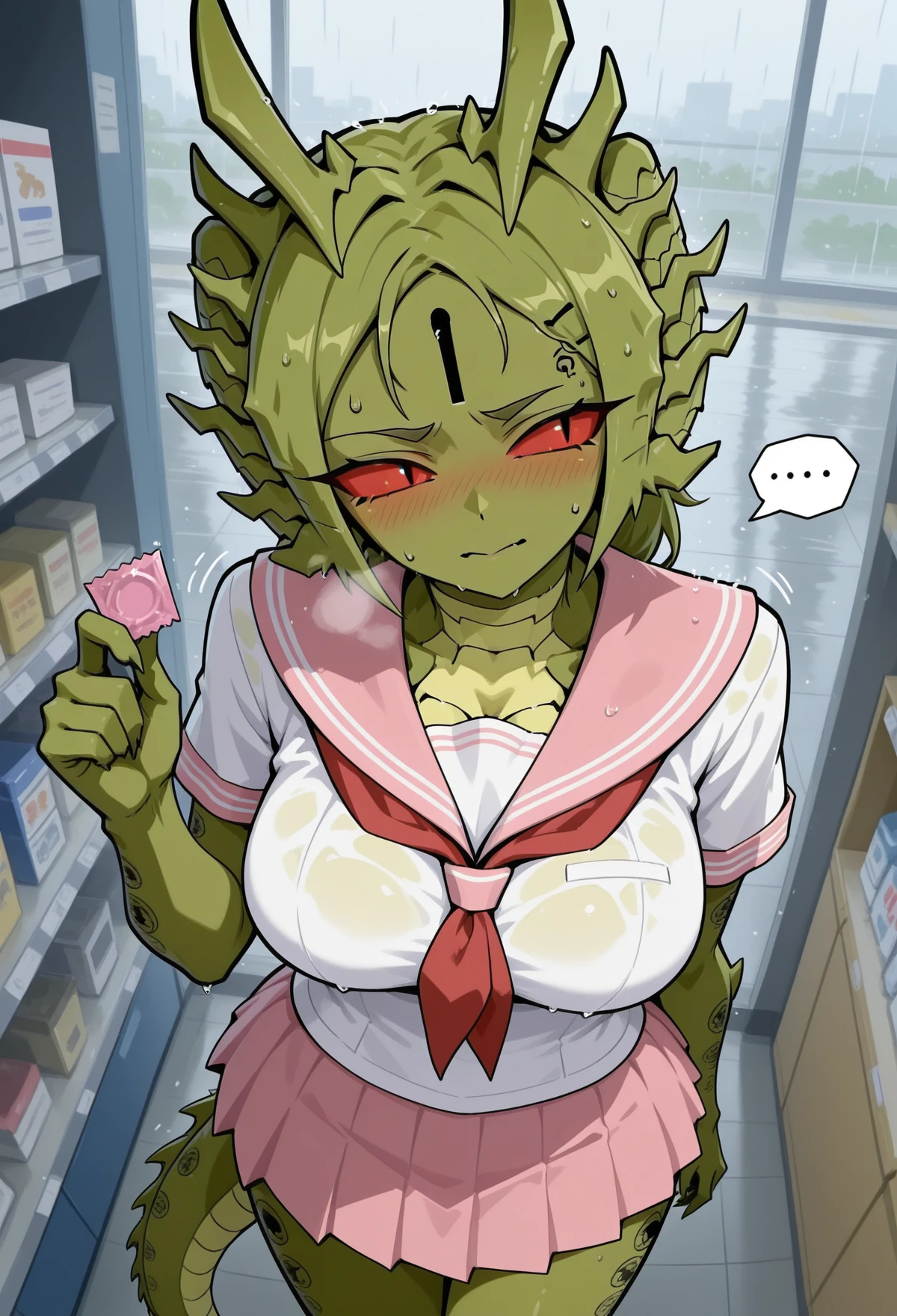 1girl, green skin, tail, breasts, colored skin, red eyes, large breasts, scales, monster girl, green hair, blush, horns, teeth, long tongue, forked tongue, open mouth, dragon girl, claws, slit pupils, red sclera, keyhole, keyhole on forehead, chinese zodiac body tattoo, body tattoo, glowing eyes,sharp nails,