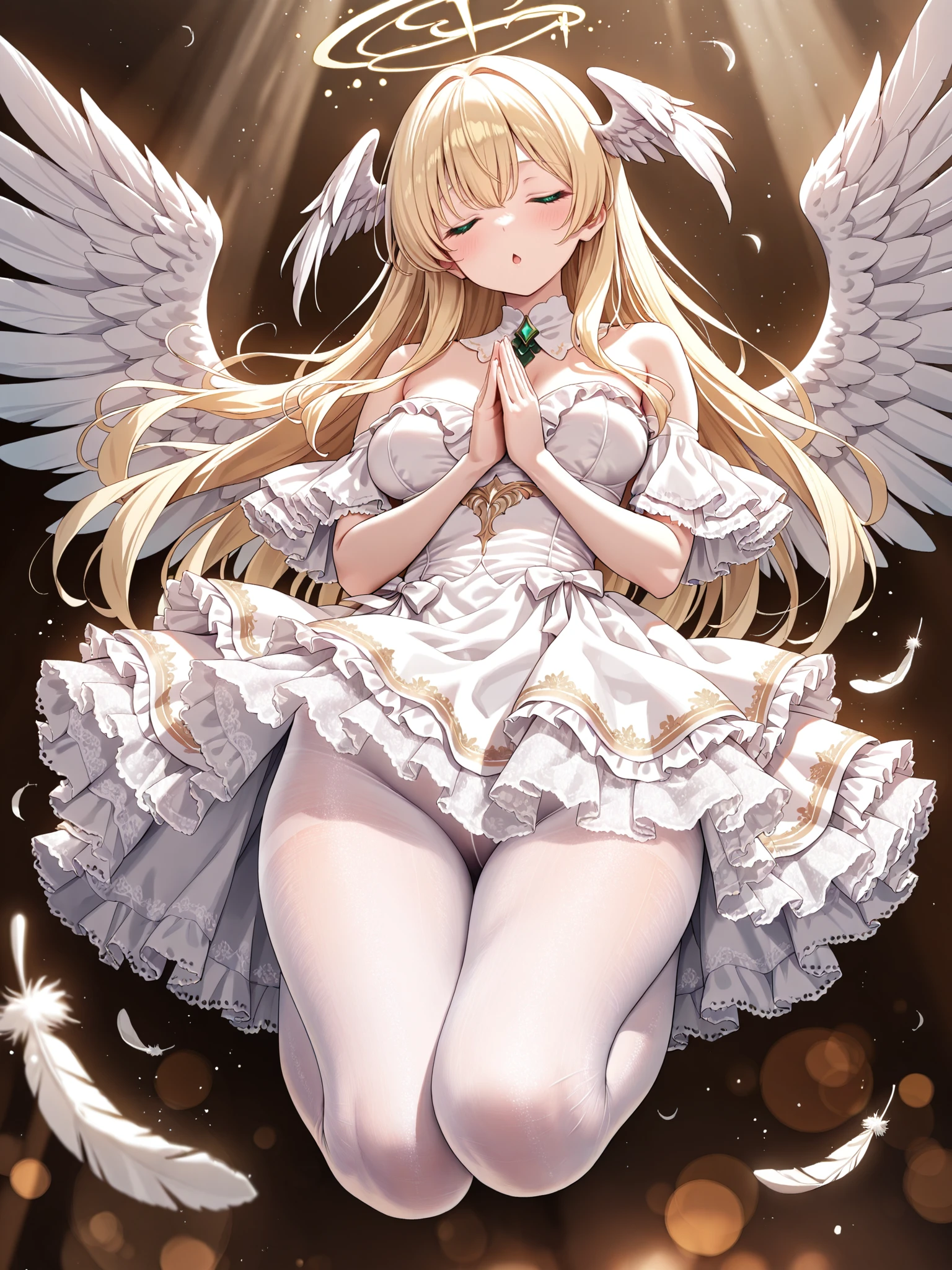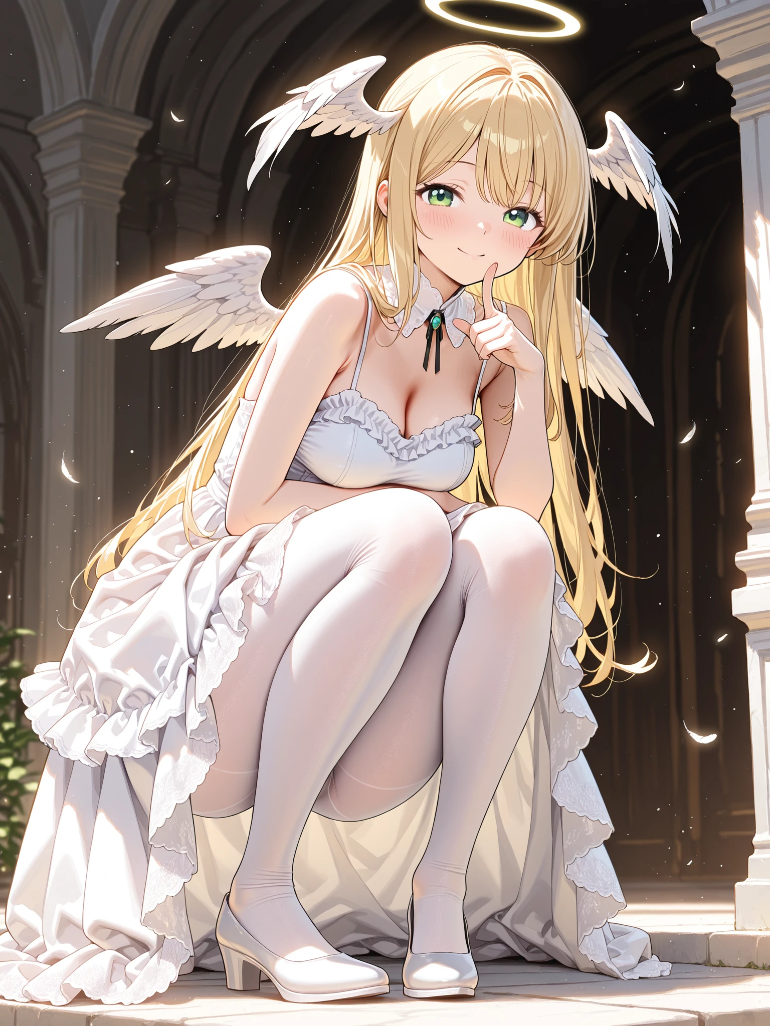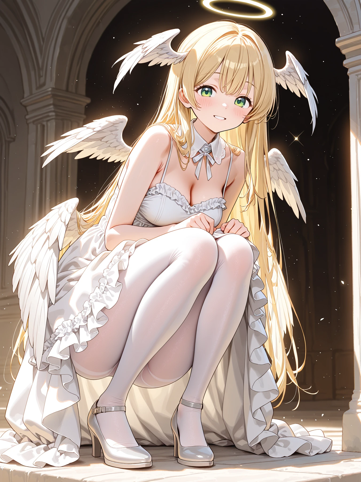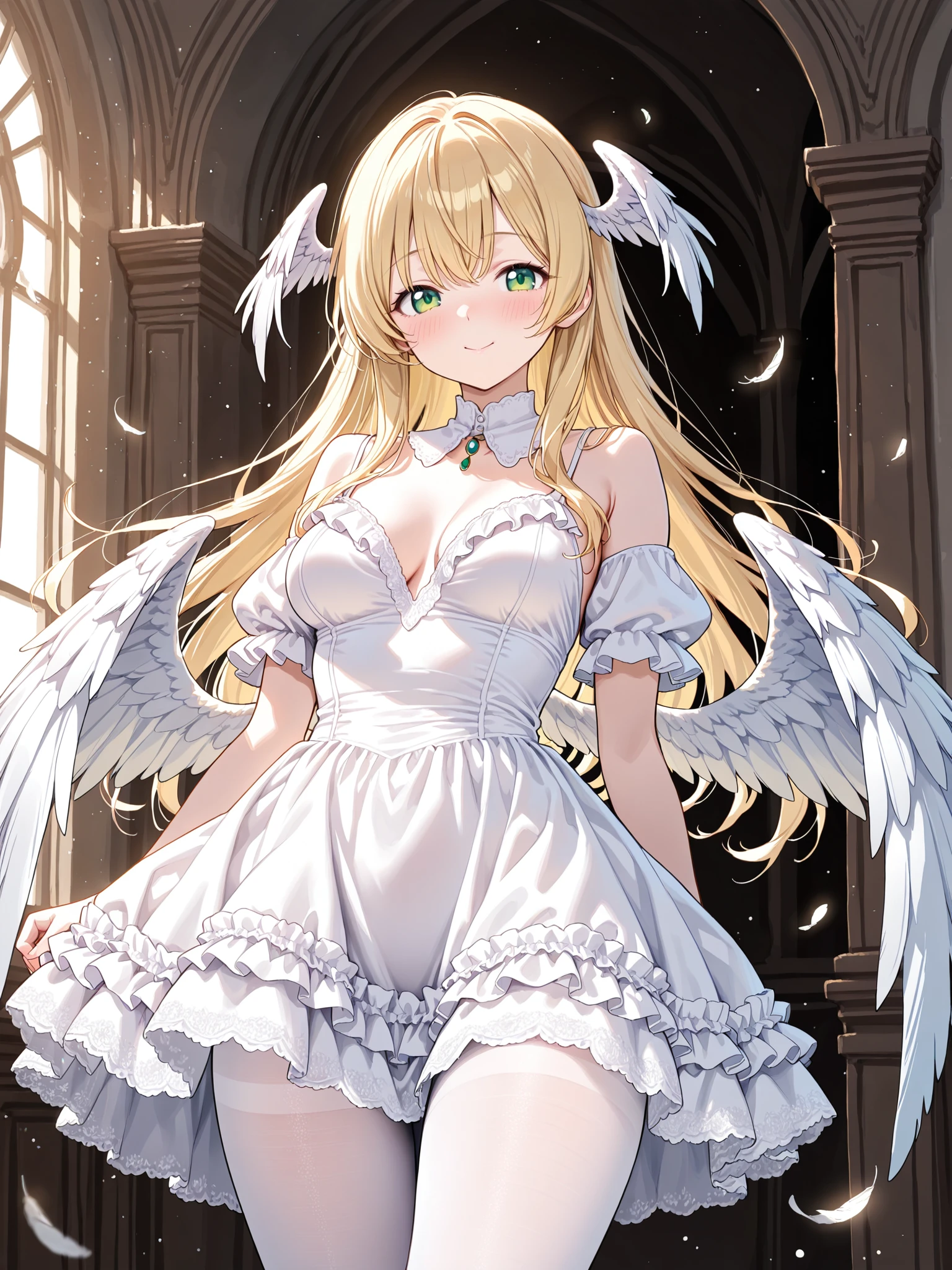 1girl,solo,angel,green eyes,blonde hair,long hair,detached collar,white dress,blush,head wings,angel wings,long shiny white wings