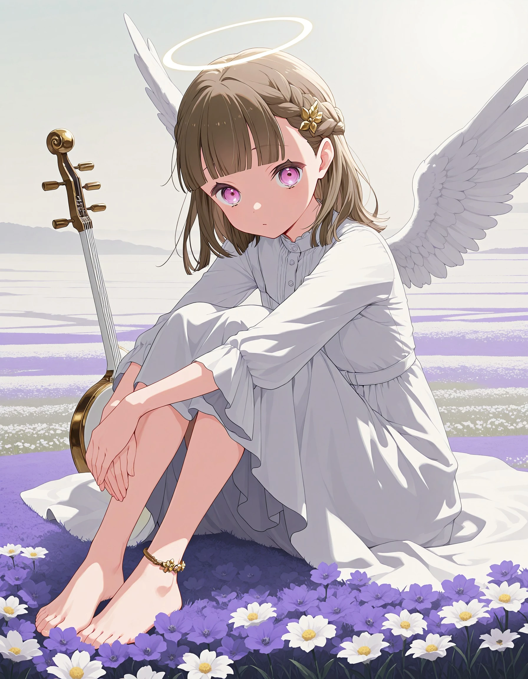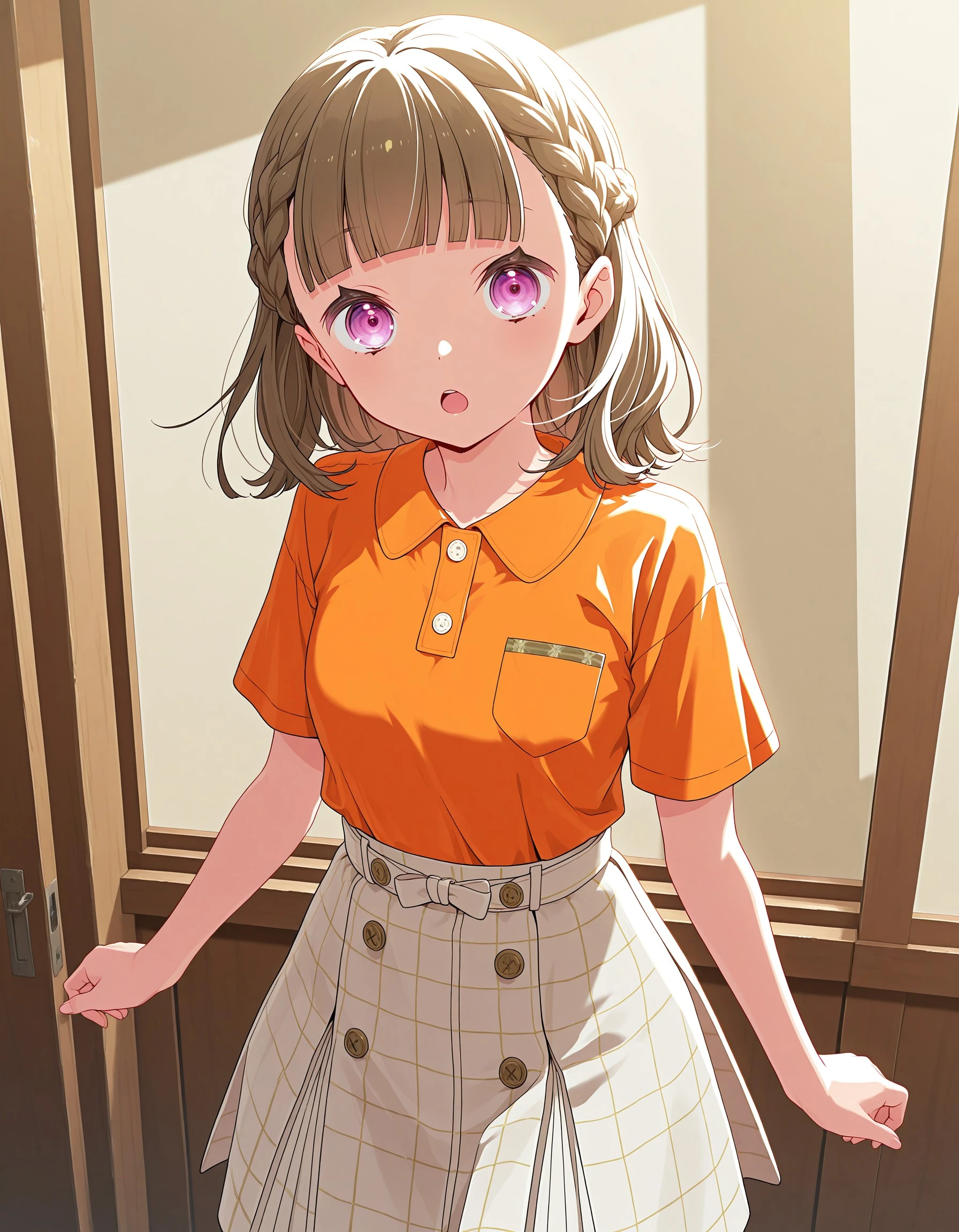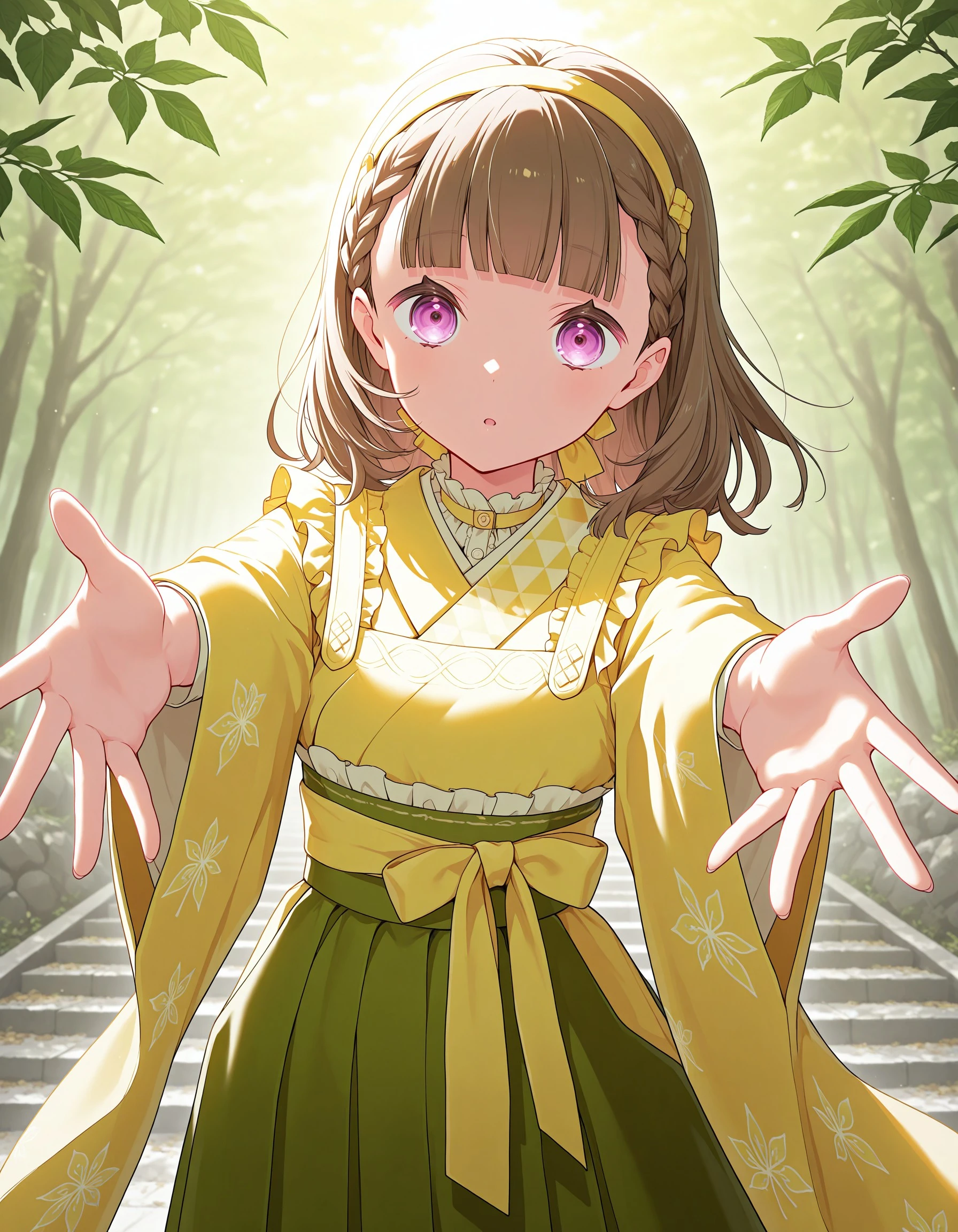 1girl, solo, kosuzu, brown hair, bangs, purple eyes, medium hair, braid, blunt bangs