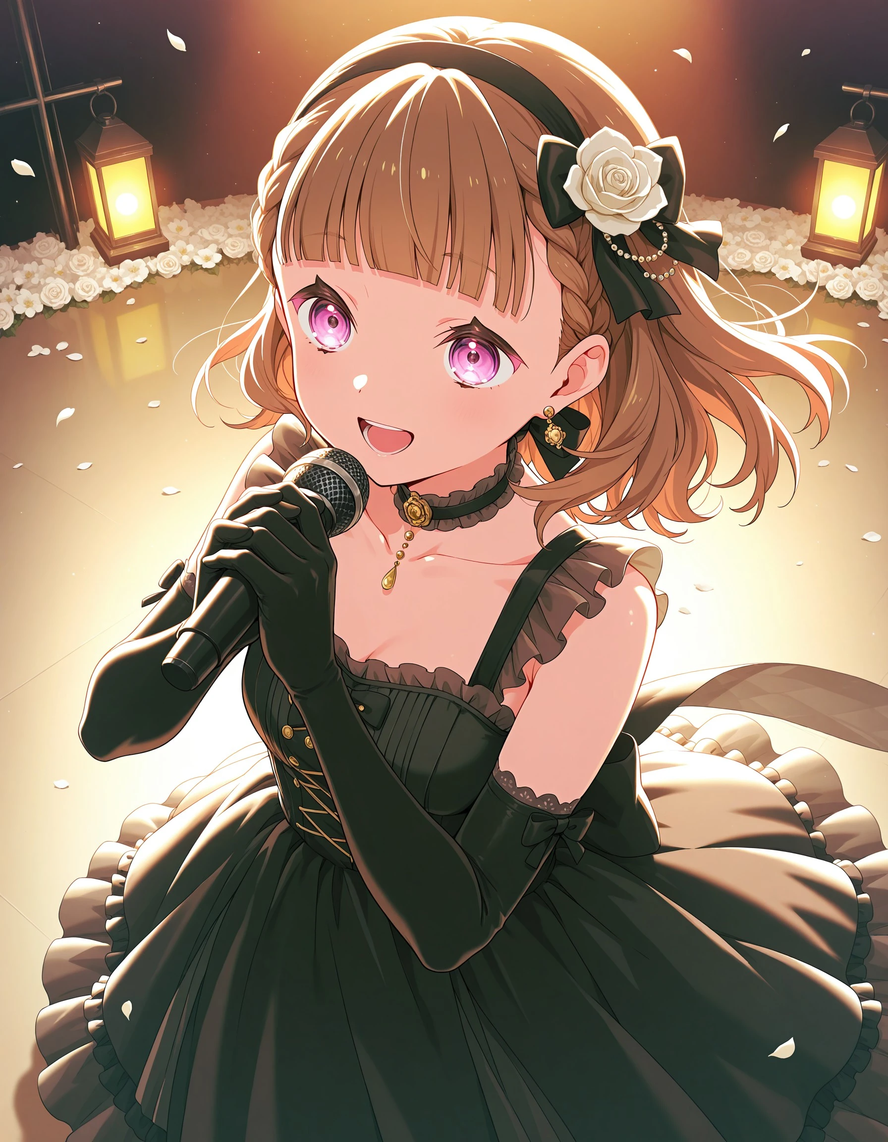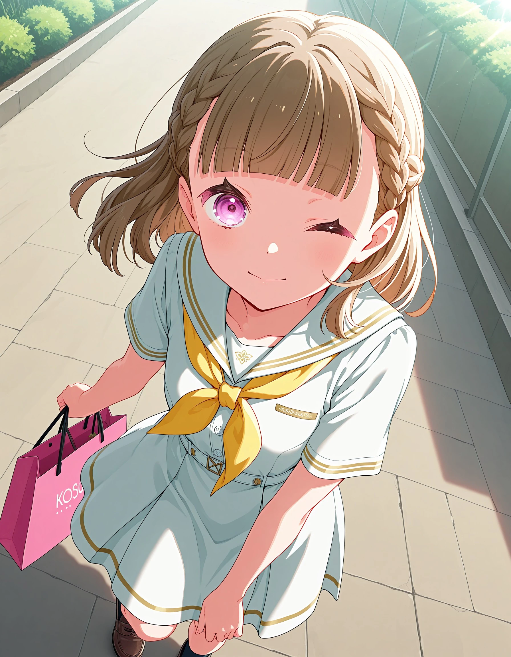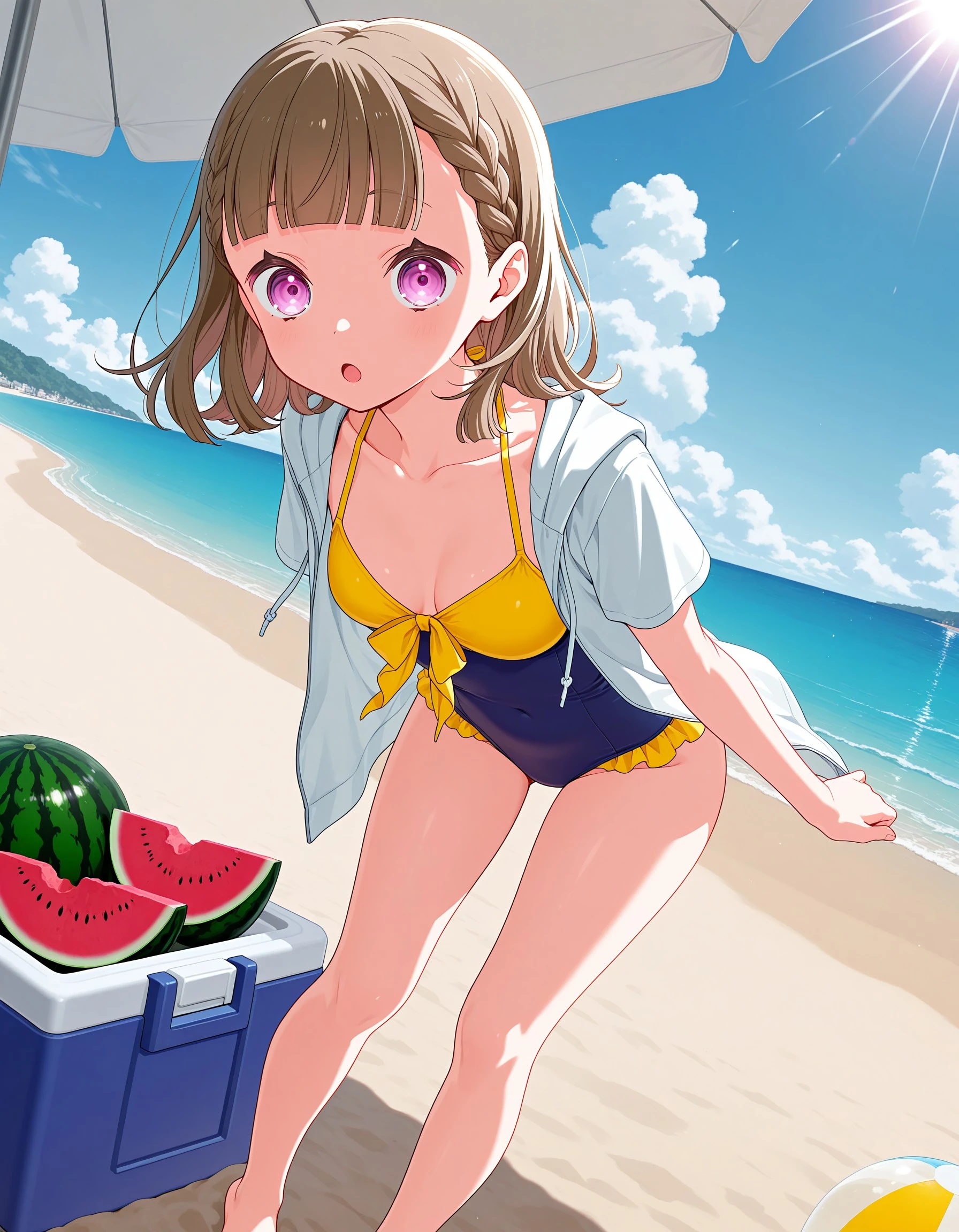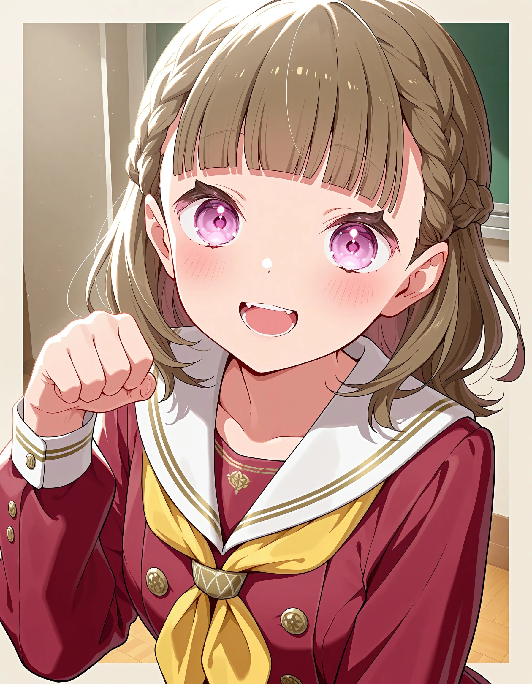 1girl, solo, kosuzu, brown hair, bangs, purple eyes, medium hair, braid, blunt bangs