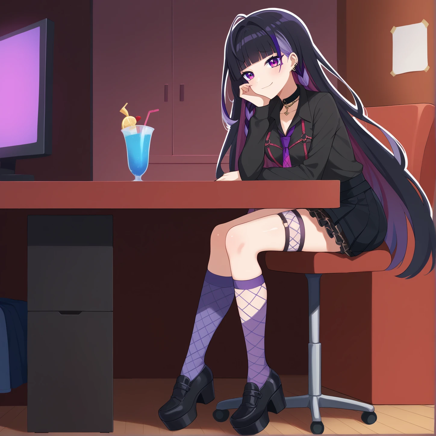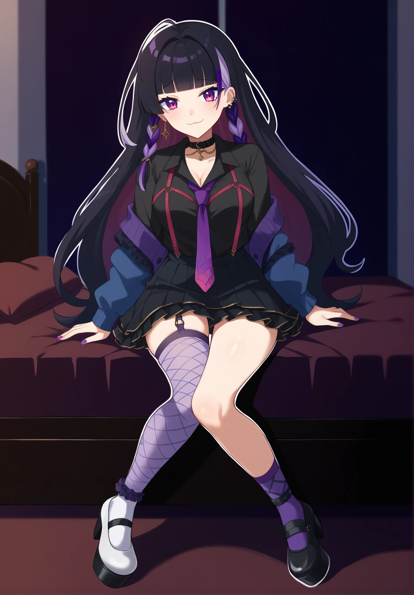 PonyXL model of the vtuber Meloco Kyoran from nijisanji en (again arguably nijsanji JP) tags- meloco, 1girl, long hair, bangs, skirt, shirt, black hair, thighhighs, long sleeves, jewelry, very long hair, purple eyes, purple hair, heart, multicolored hair, earrings, necktie, shoes, choker, socks, blunt bangs, black skirt, black footwear, black shirt, single thighhigh, fishnets, asymmetrical legwear, mismatched legwear, platform footwear, purple necktie