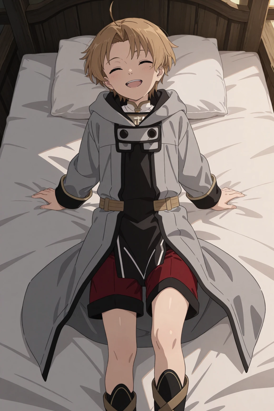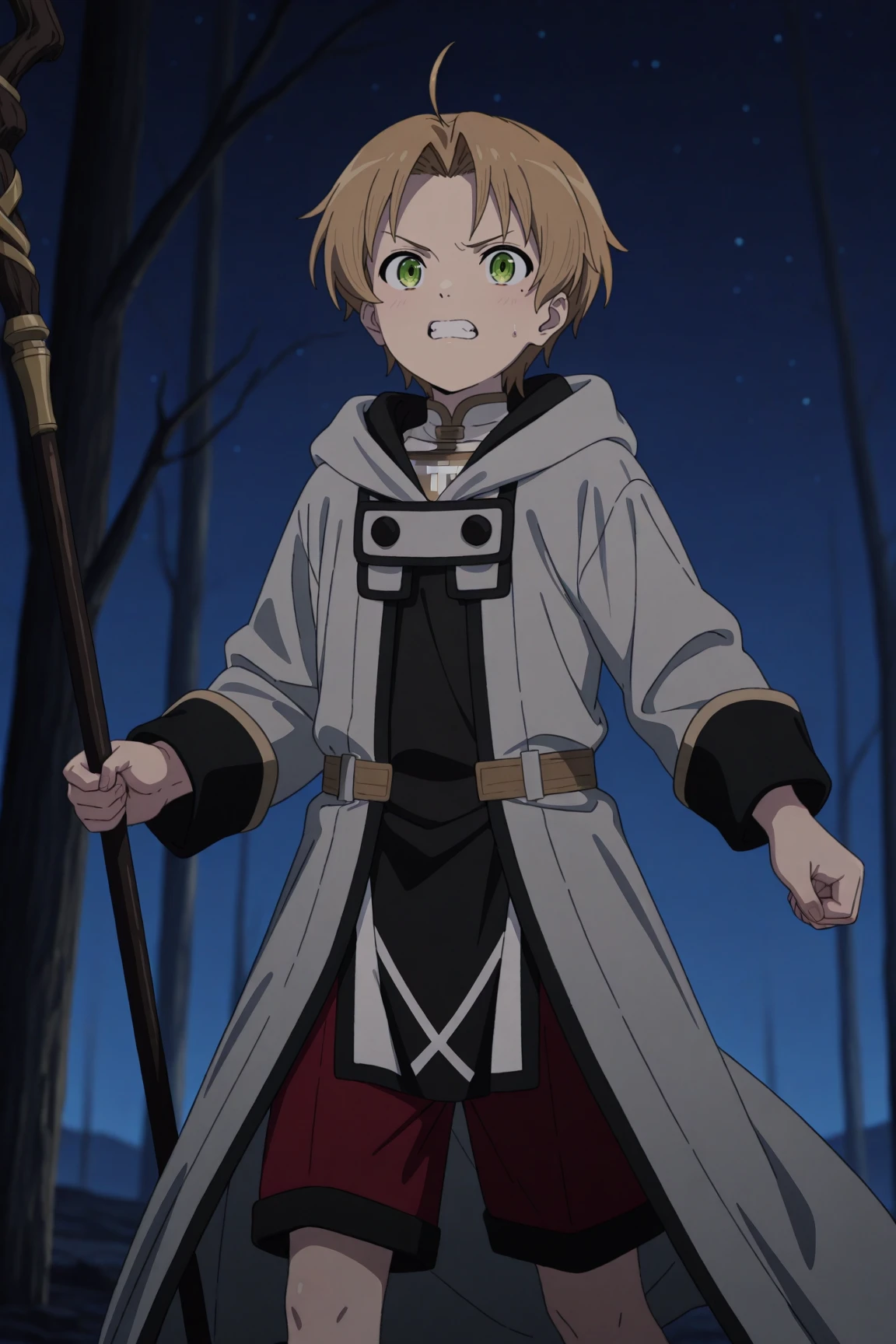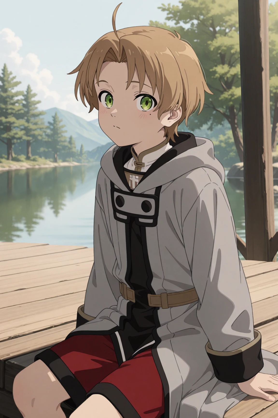 grey hooded robe, white shirt, red shorts, belt pouch, black boots