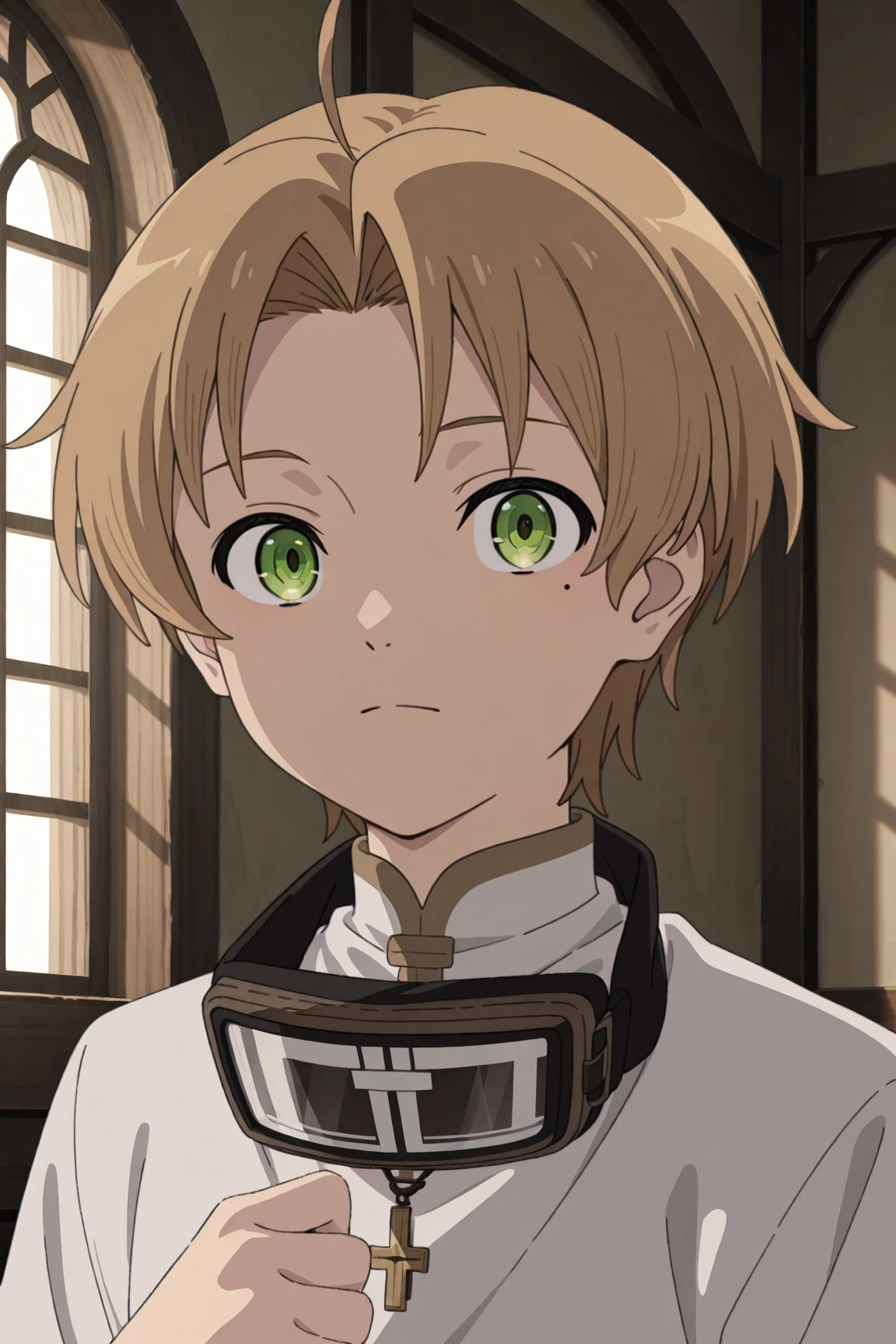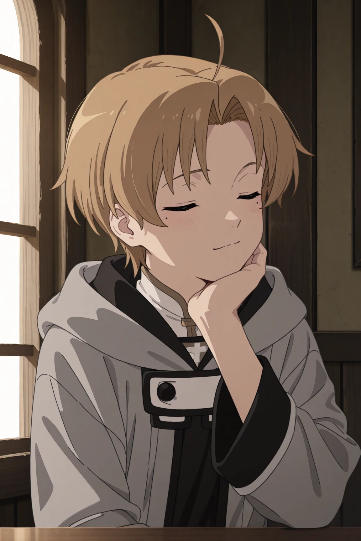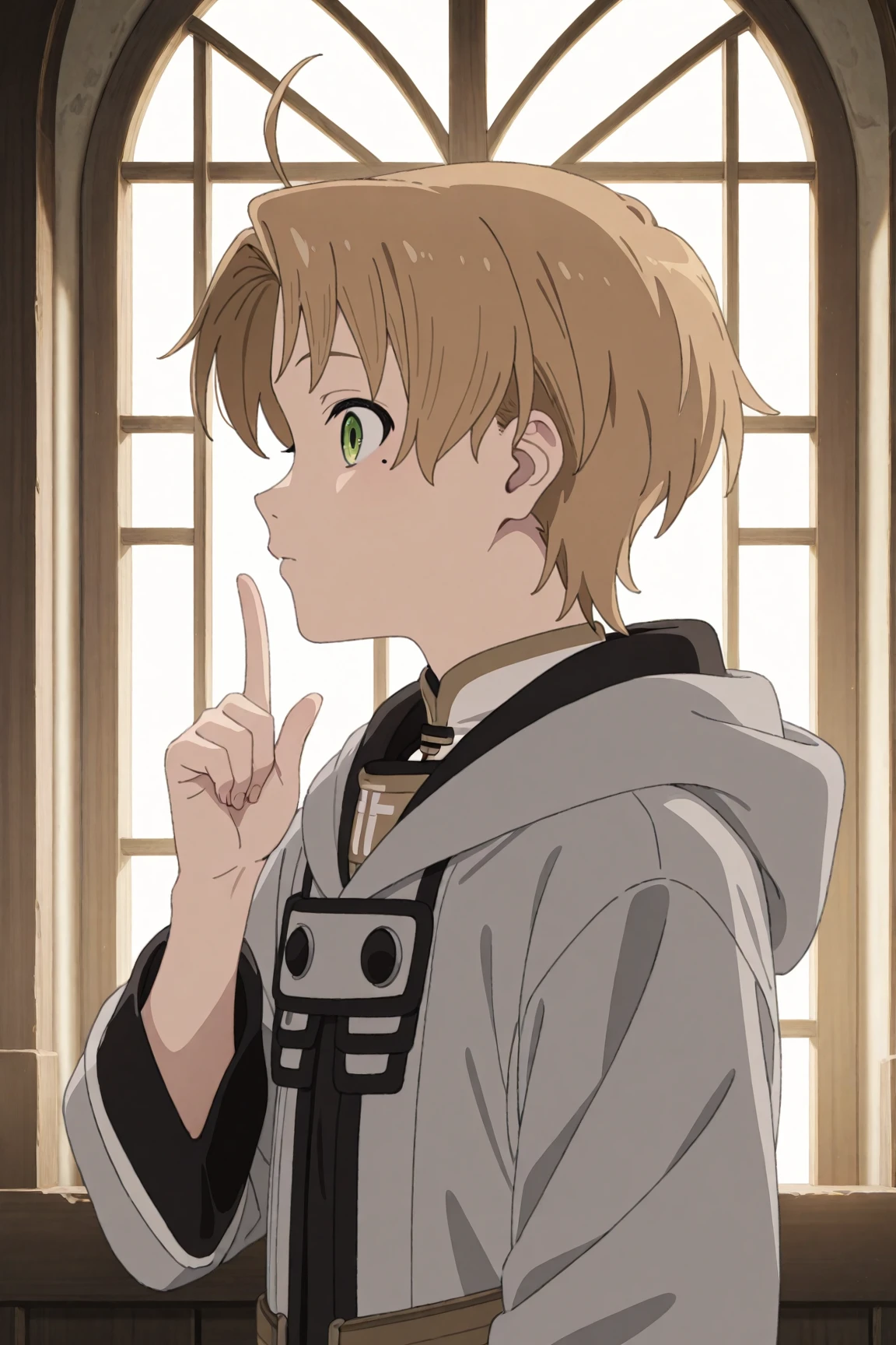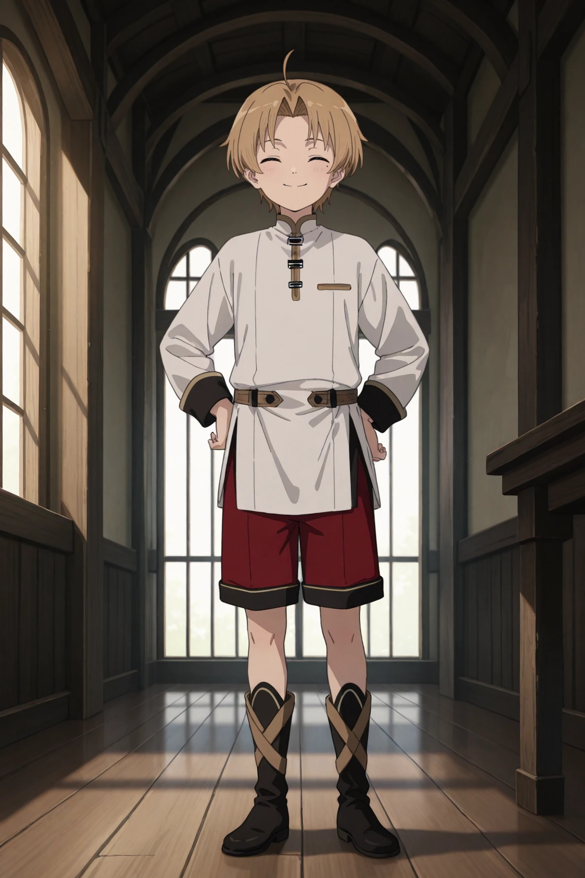 grey hooded robe, white shirt, red shorts, belt pouch, black boots