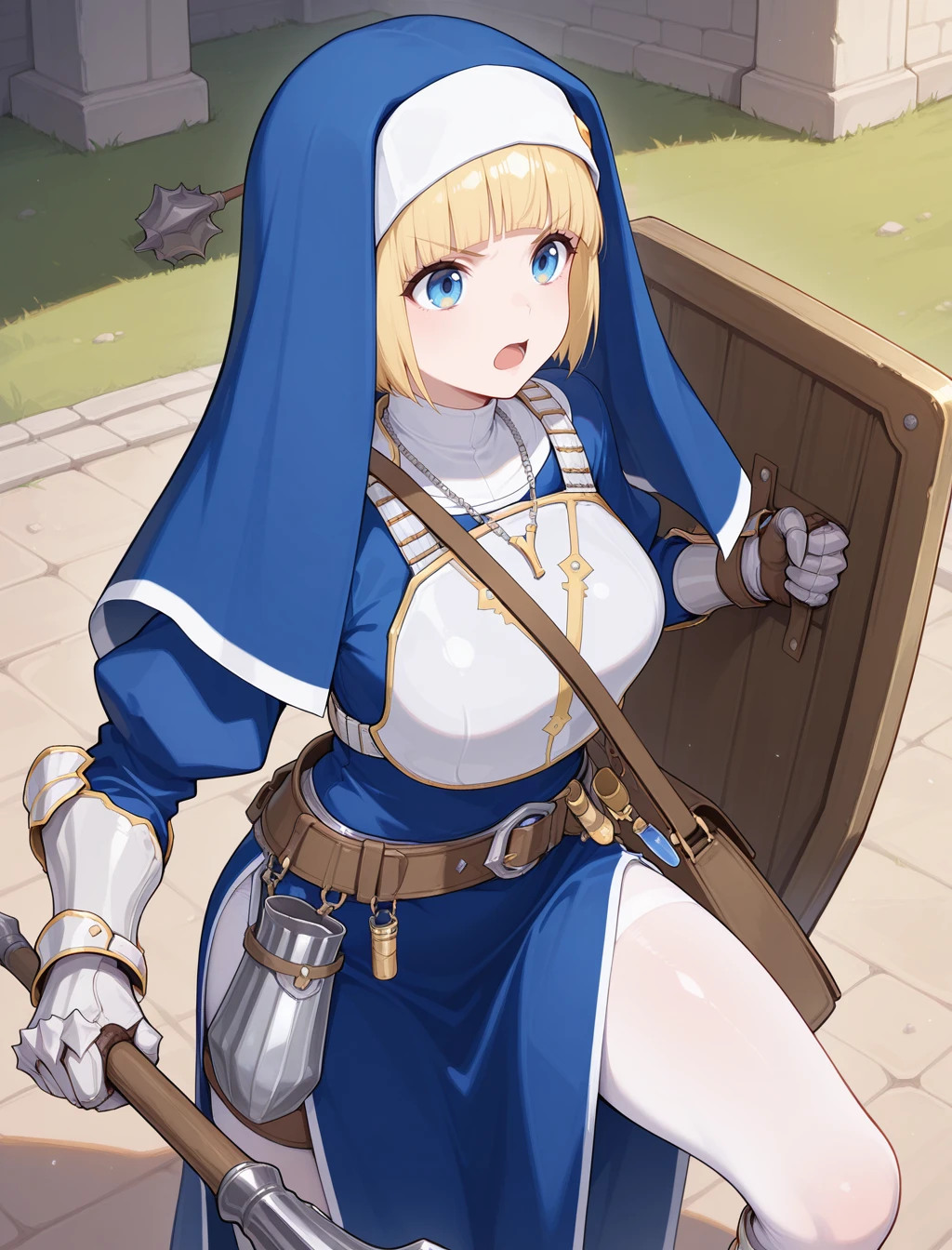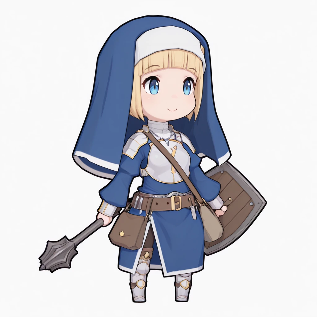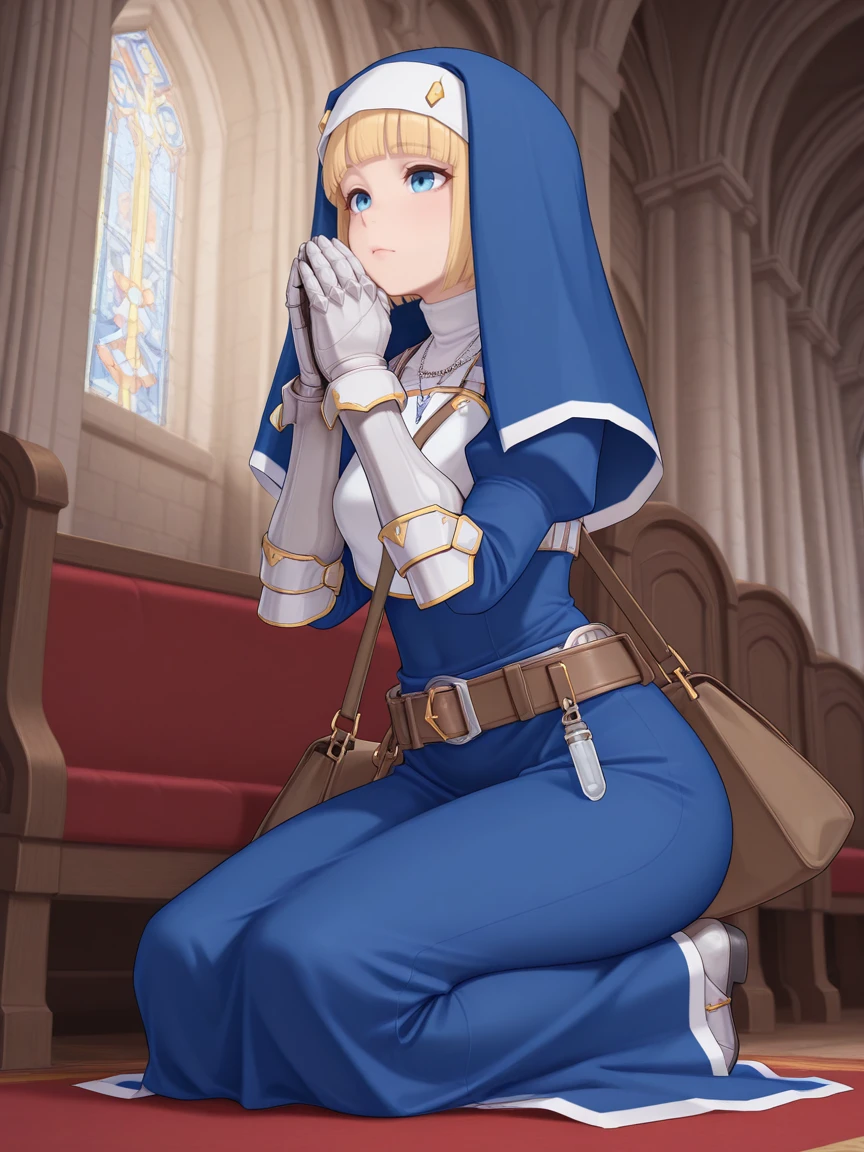 ClaraTinala, Blonde Hair, Blue eyes, short hair, blunt bangs, necklece, armor, habit, nun, bag, long sleeves, belt Use adetailer for best results on face!