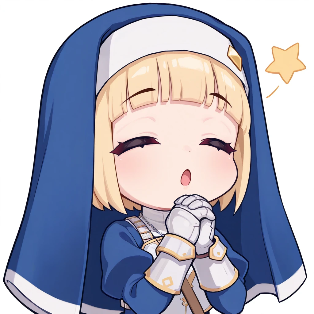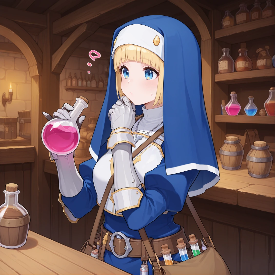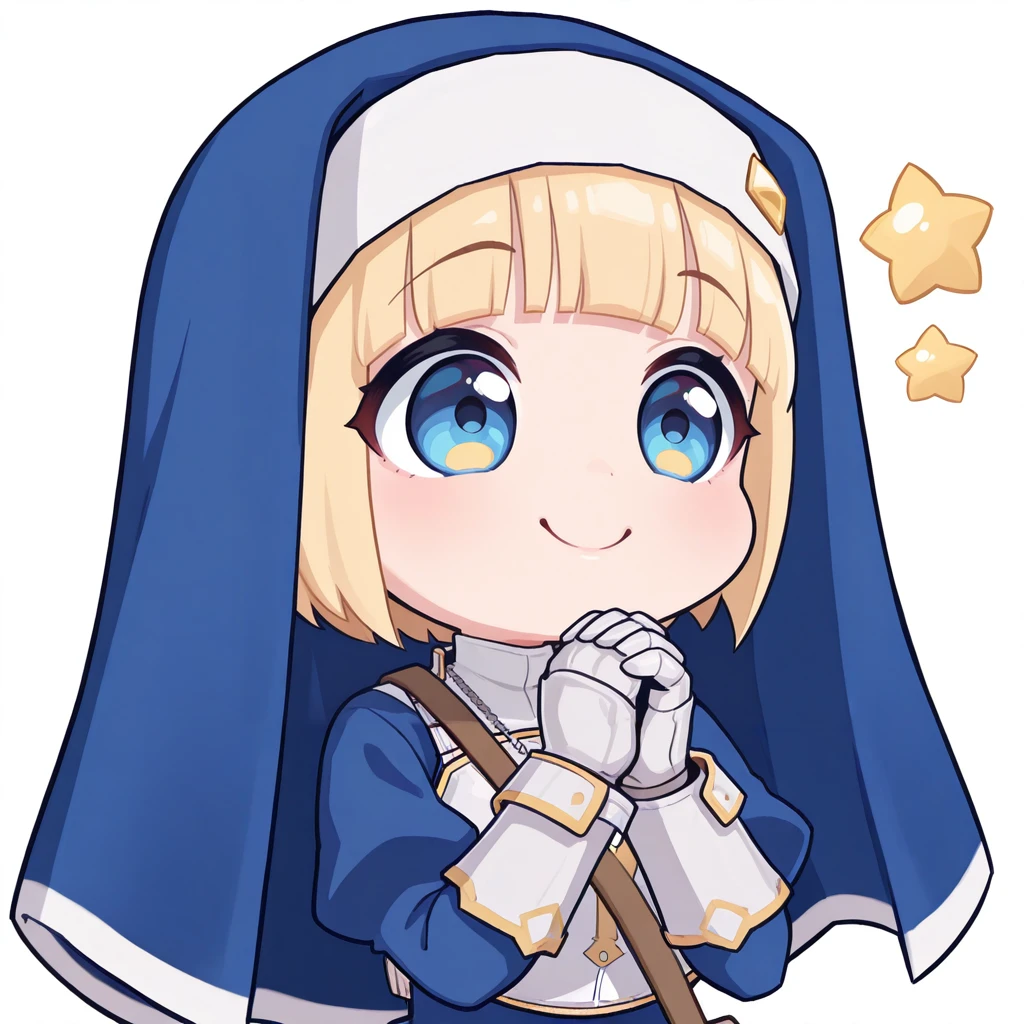 ClaraTinala, Blonde Hair, Blue eyes, short hair, blunt bangs, necklece, armor, habit, nun, bag, long sleeves, belt Use adetailer for best results on face!