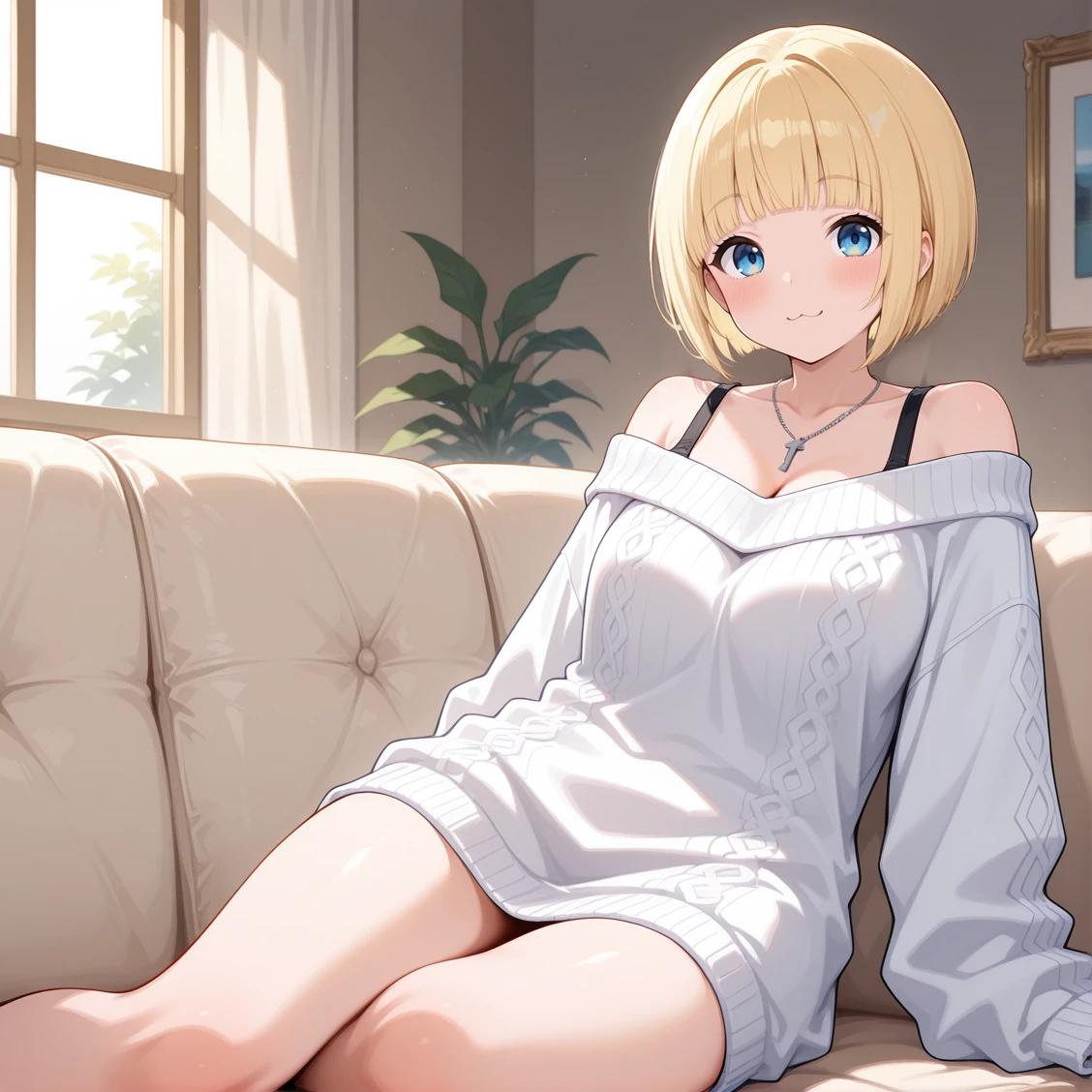 ClaraTinala, Blonde Hair, Blue eyes, short hair, blunt bangs, necklece, armor, habit, nun, bag, long sleeves, belt