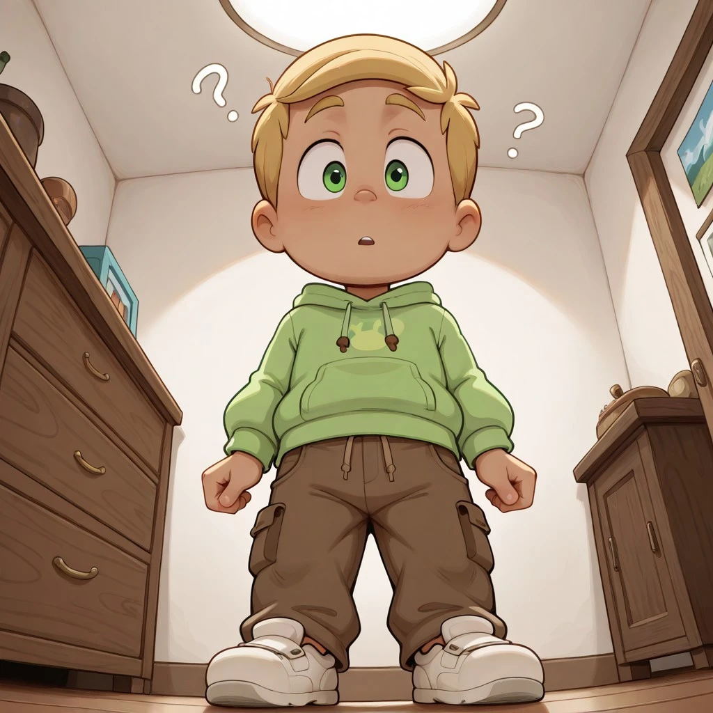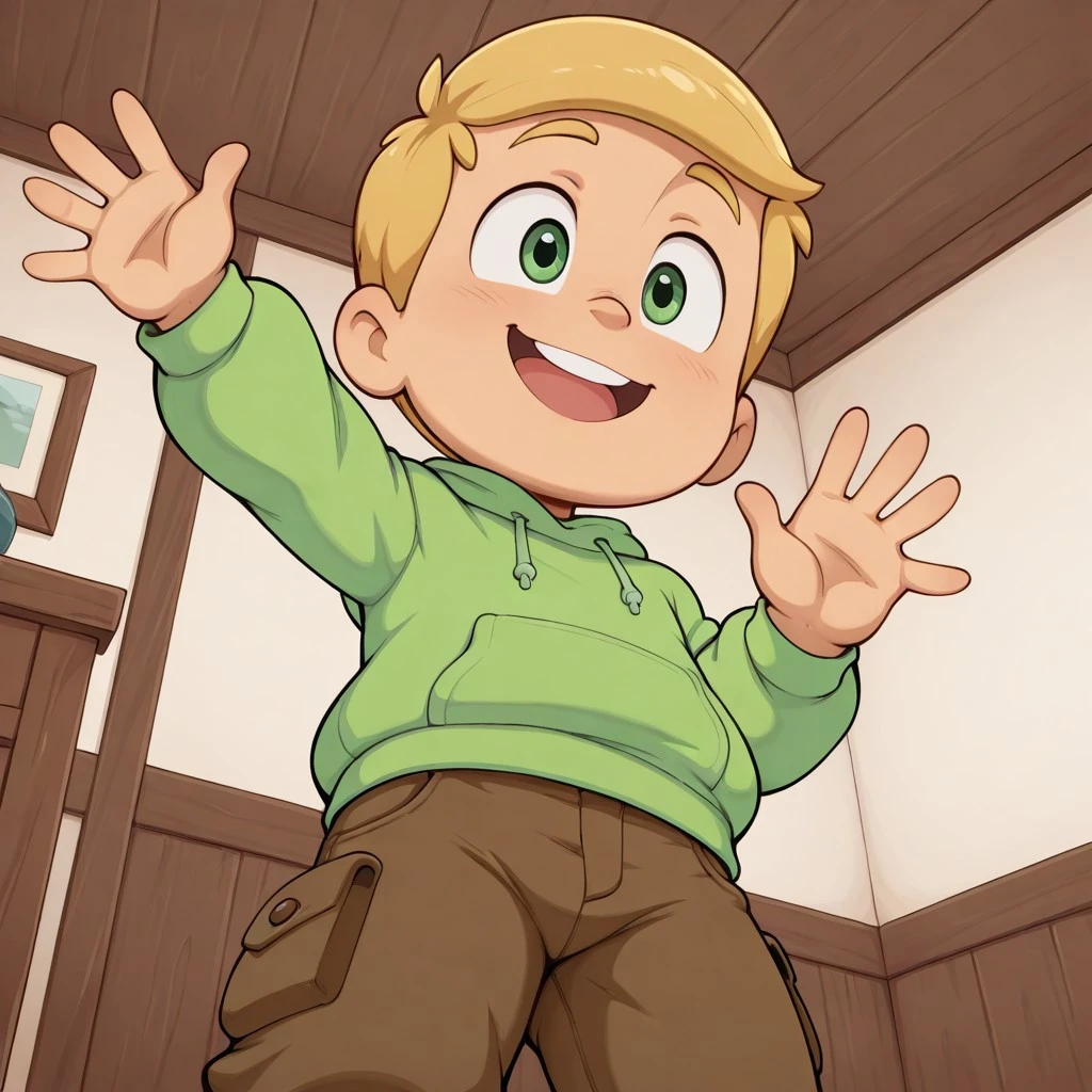1boy, solo, Greg, green hoodie, brown cargo pants, green eyes, blonde hair