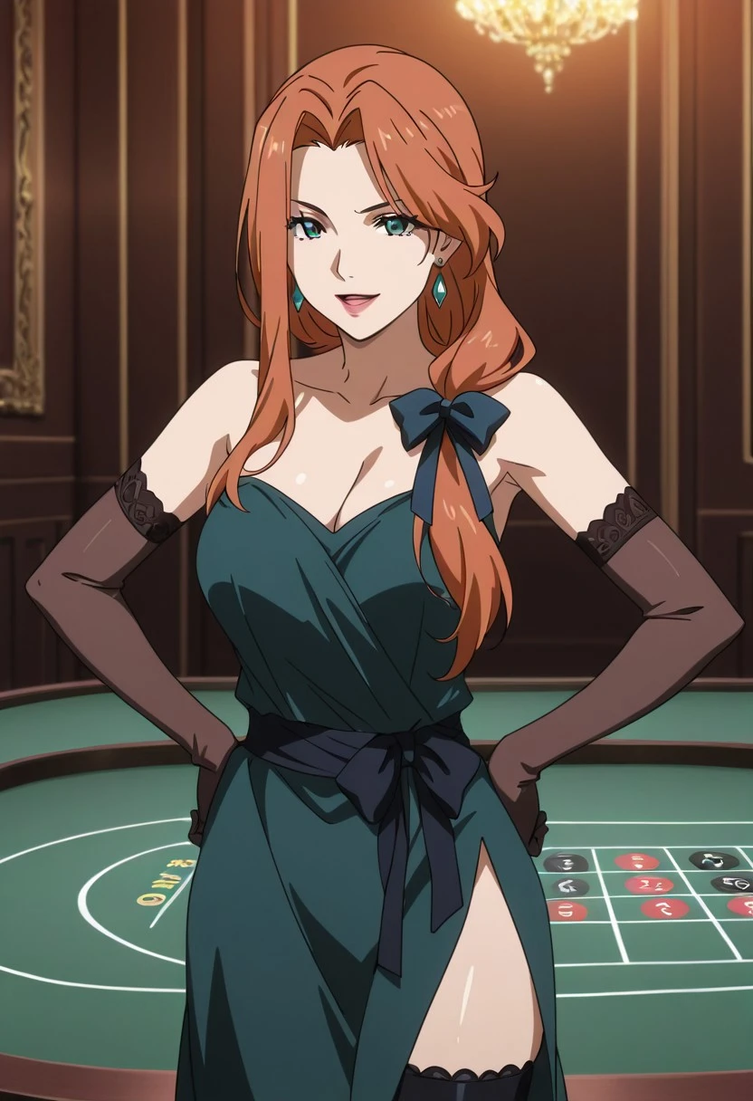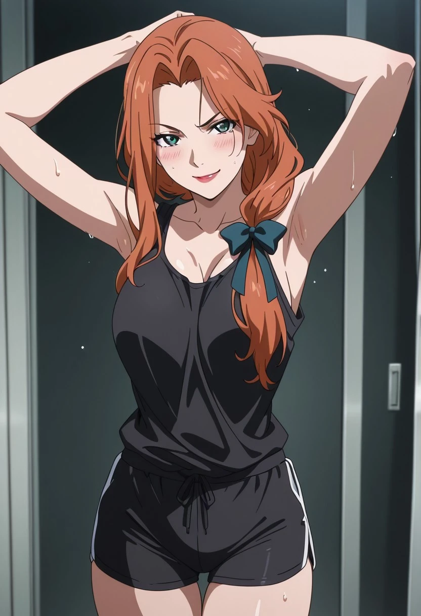 1 girl, solo, OliviaLitlet, orange hair, green eyes, parted bangs, long hair, low ponytail, hair over shoulder, lipstick, blue ribbon in hair