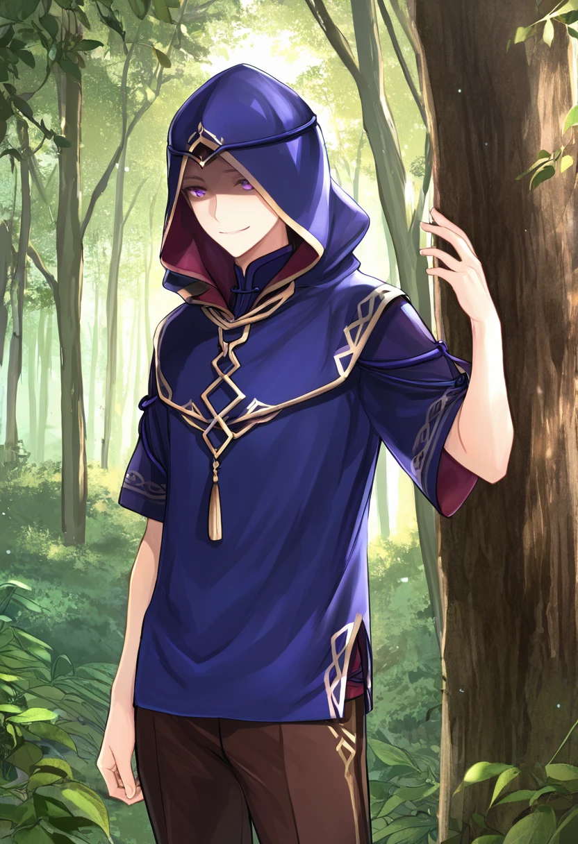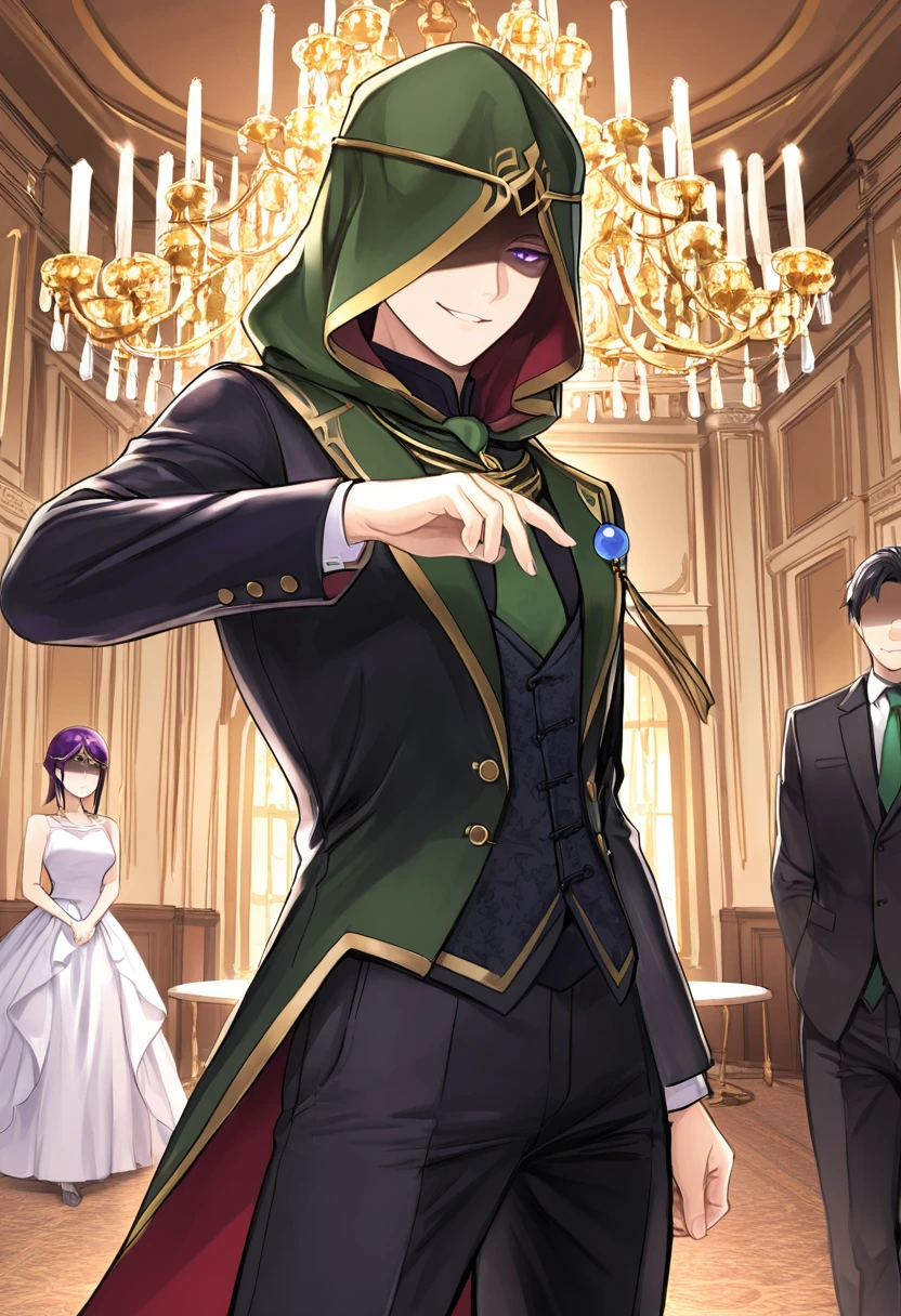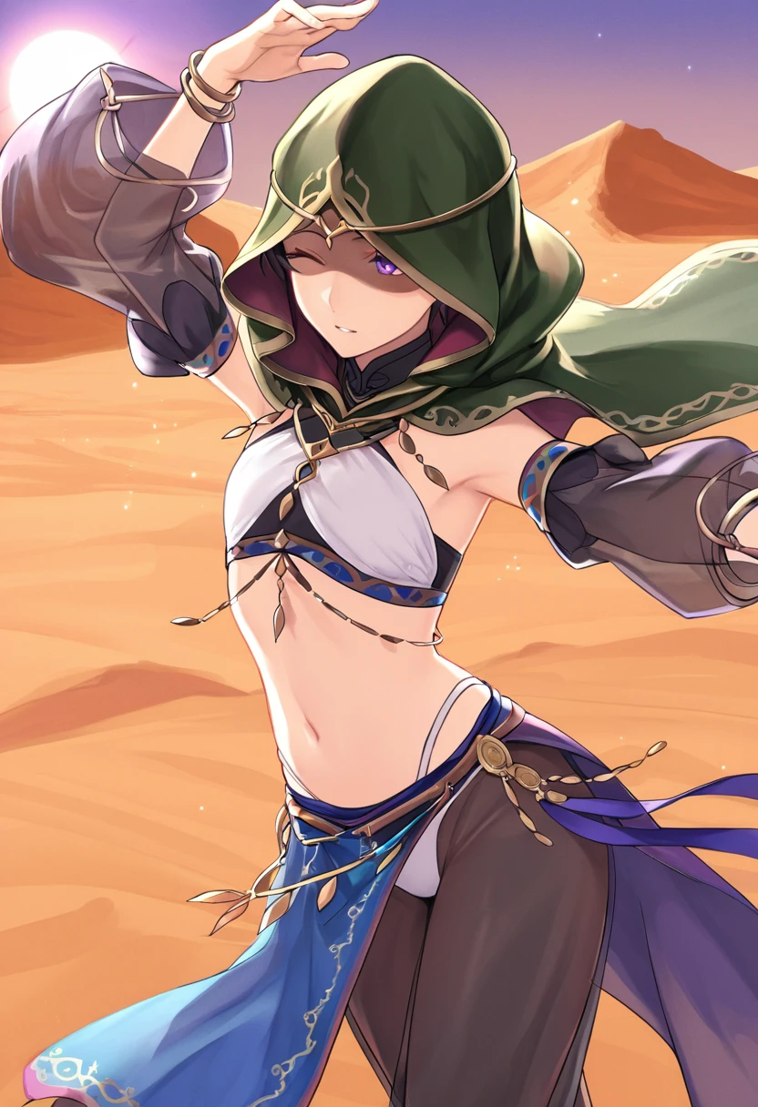 BramimondFE, 1other, green hood, hood up, shaded face, circlet,