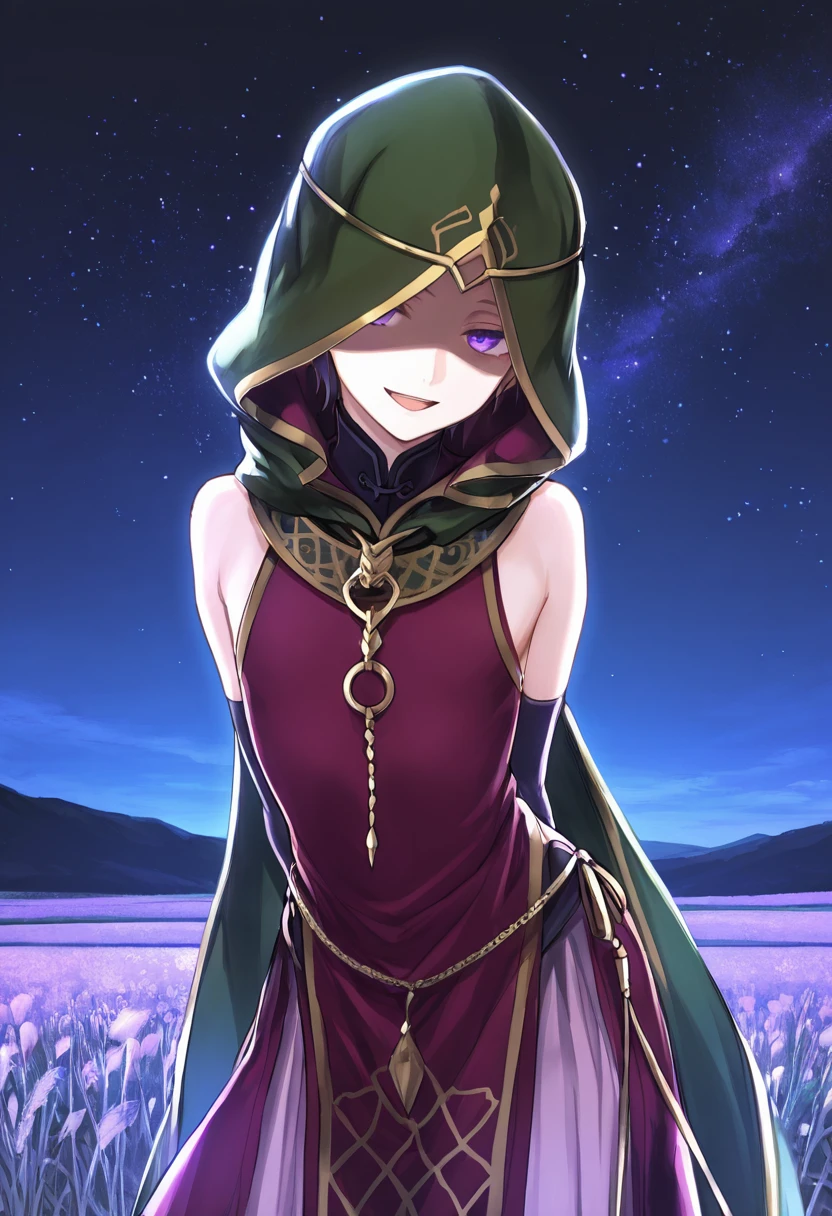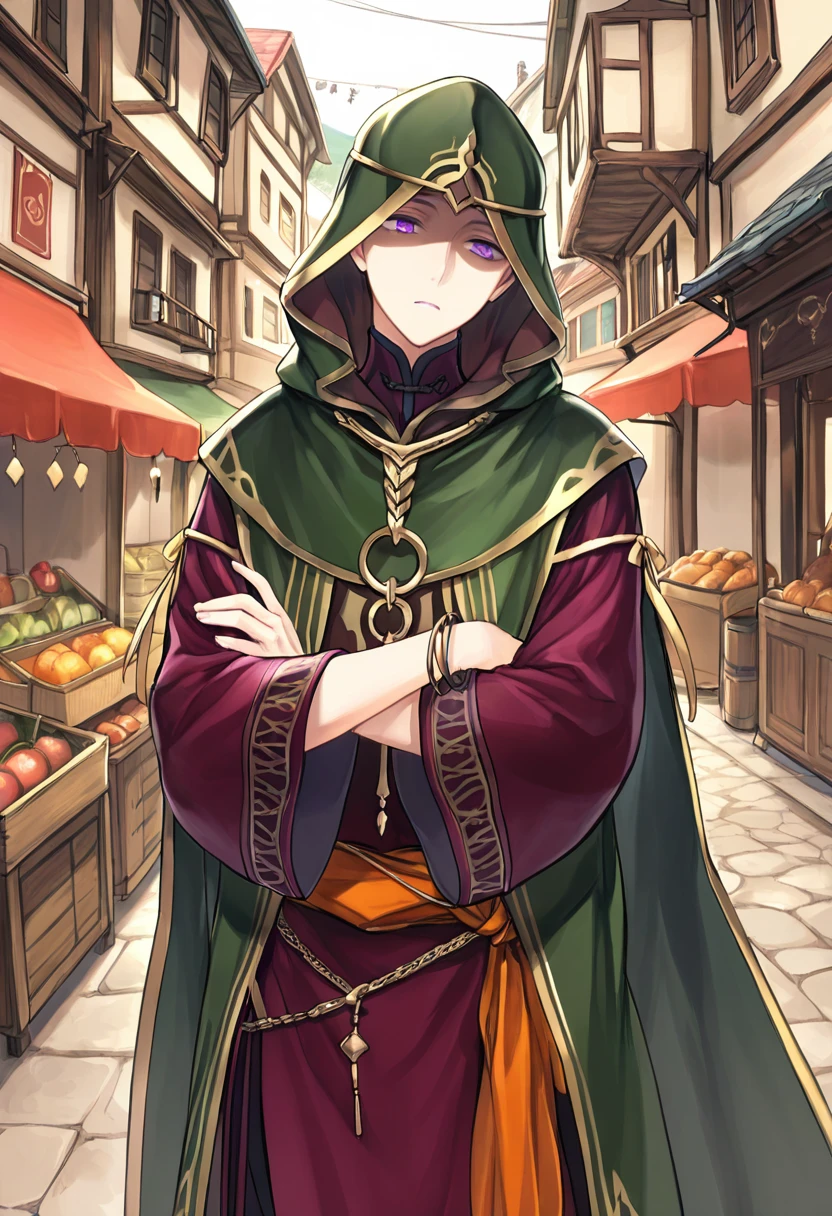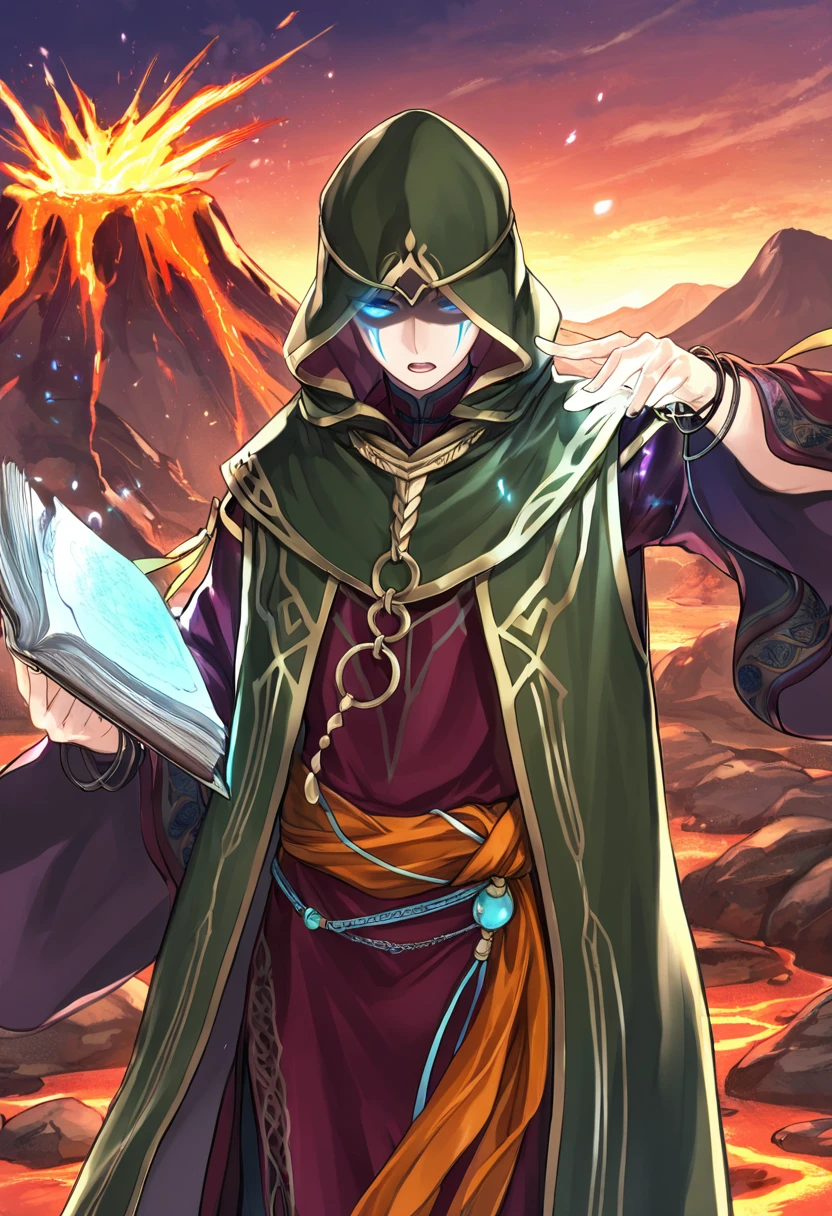 Trigger Words: BramimondFE, 1other, green hood, hood up, shaded face, circlet, green cloak, red robe, wide sleeves, red sleeves, bracelet, jewelry, orange sash, sandals, dark aura,