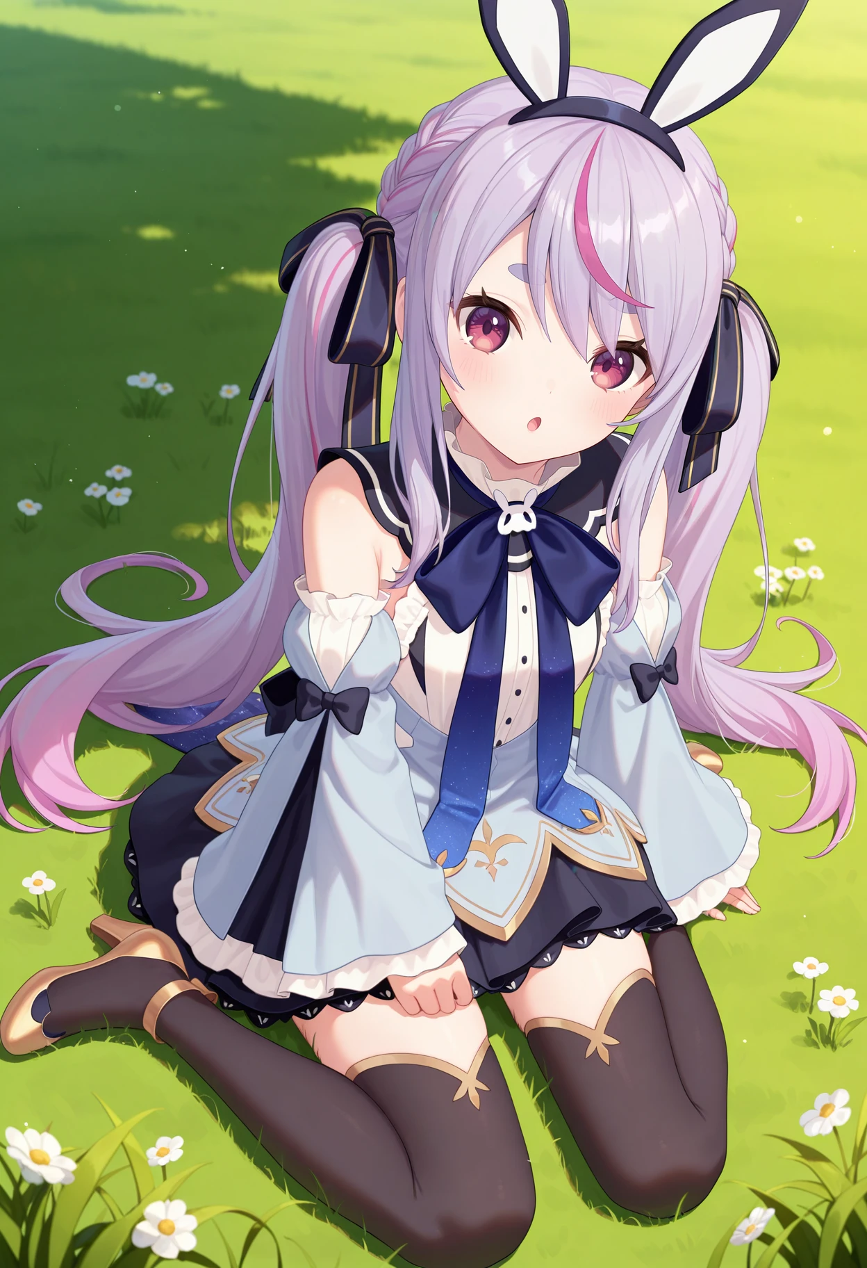 outfit2bbmimi, long hair, streaked hair, braid, twintails, fake animal ears, hair ribbon, black hairband, thick eyebrows, blue bowtie, dress, detached sleeves, wide sleeves, black skirt, black thighhighs