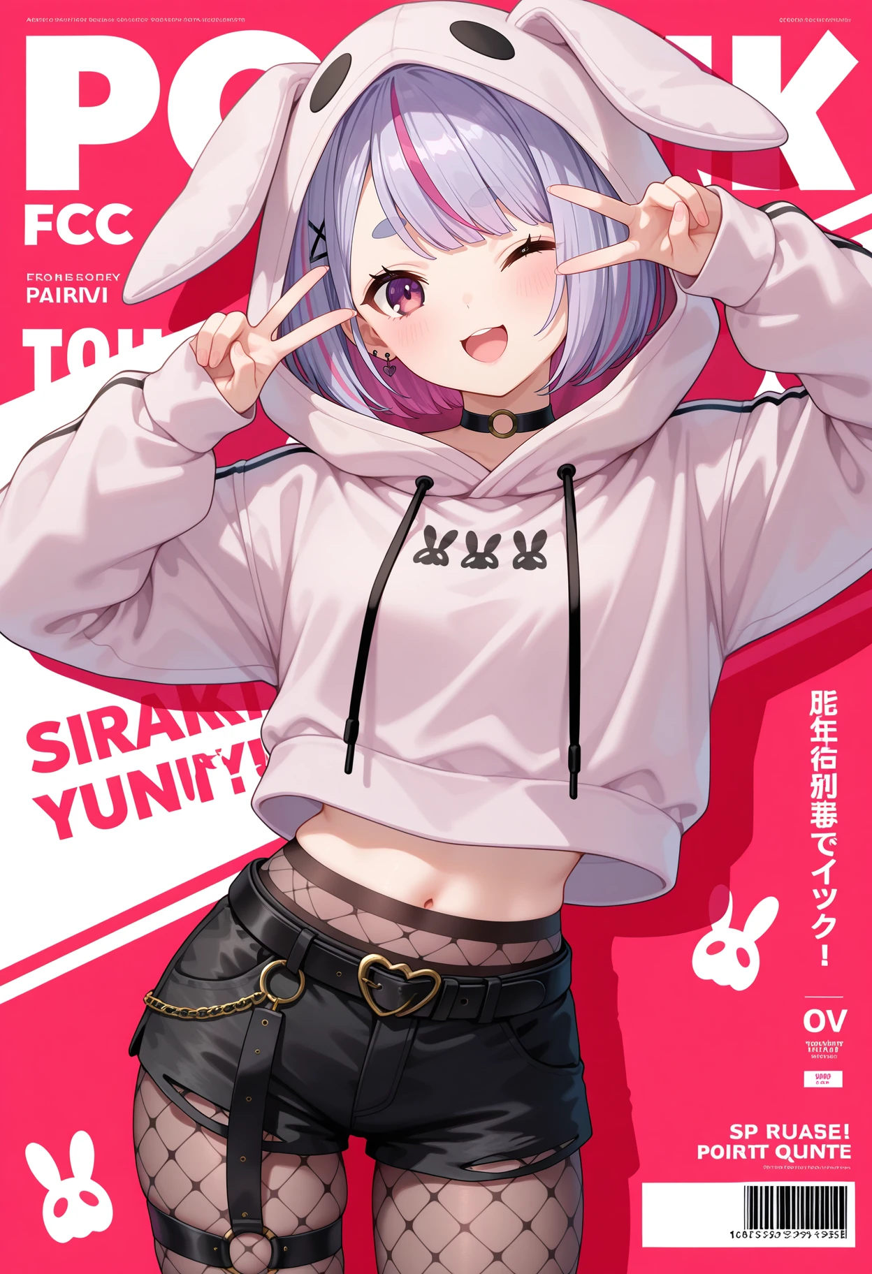 outfit3ccmimi, short hair, streaked hair, cabbie hat, black headwear, hair ornament, thick eyebrows, black choker, white hoodie, black jacket, long sleeves, midriff, black belt, short shorts, black shorts, thigh strap, fishnet pantyhose, brown pantyhose