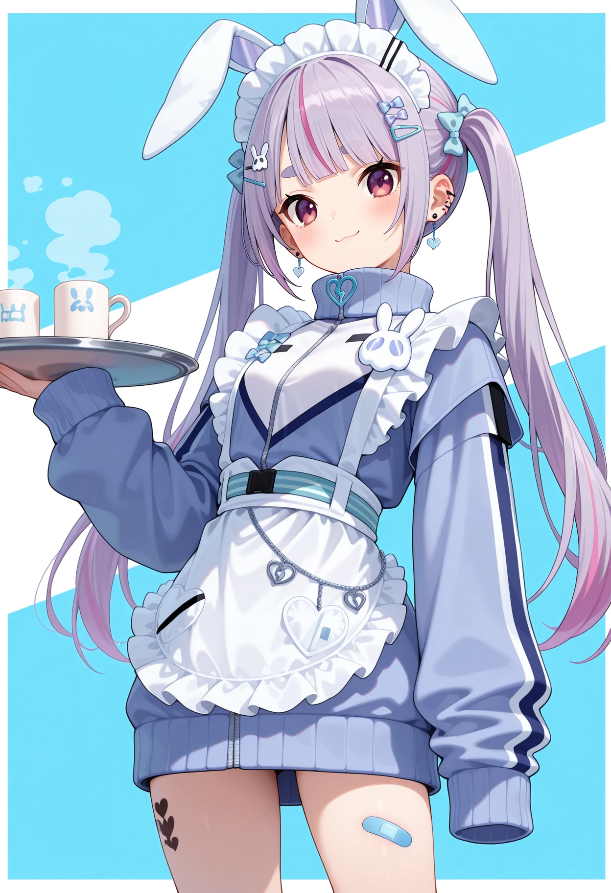 outfit4ddmimi, long hair, streaked hair, twintails, animal ears, maid headdress, hair bow, hair ornament, piercing, earrings, thick eyebrows, track jacket, blue jacket, long sleeves, sleeves past wrists, frills, white apron, bandaid on leg