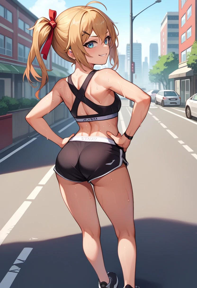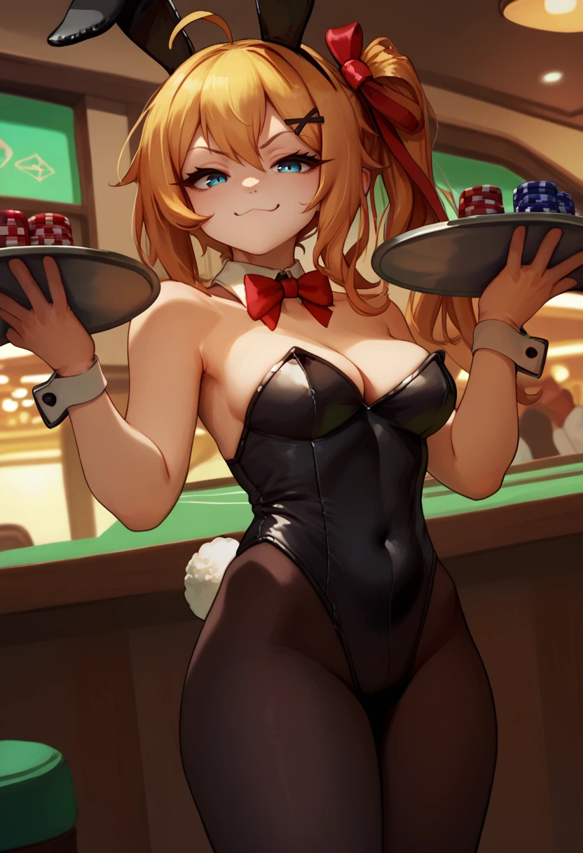Trigger + Appearance: gflkalina, ahoge, side ponytail, x hair ornament, hair ribbon, red ribbon, hairclip