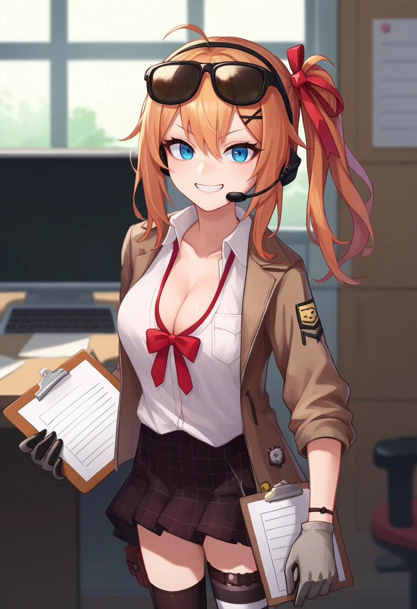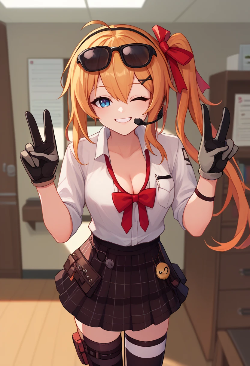 Default Outfit: sunglasses, eyewear on head, headset, open clothes, brown jacket, white shirt, red bow, gloves, black skirt, plaid skirt, asymmetrical legwear, mismatched legwear, black thighhighs, striped thighhighs, cleavage