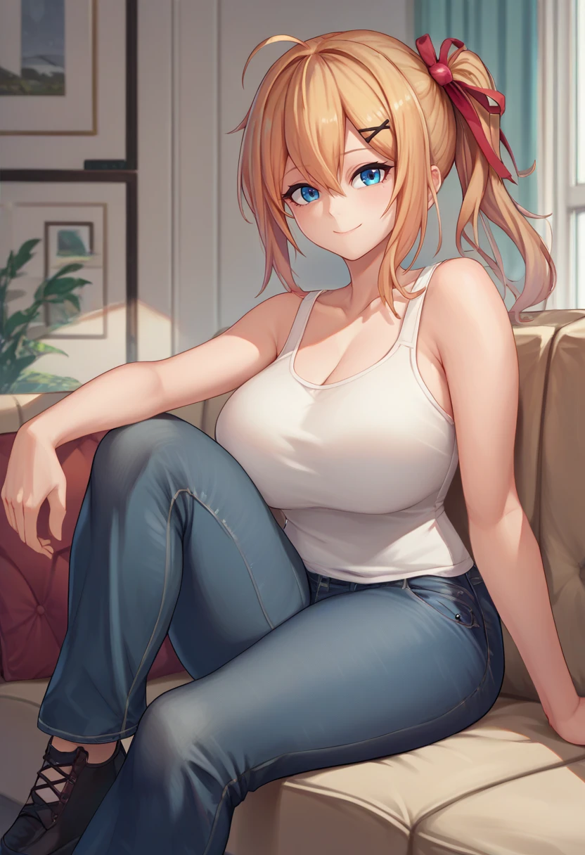 gflkalina, ahoge, side ponytail, x hair ornament, hair ribbon, red ribbon, hairclip