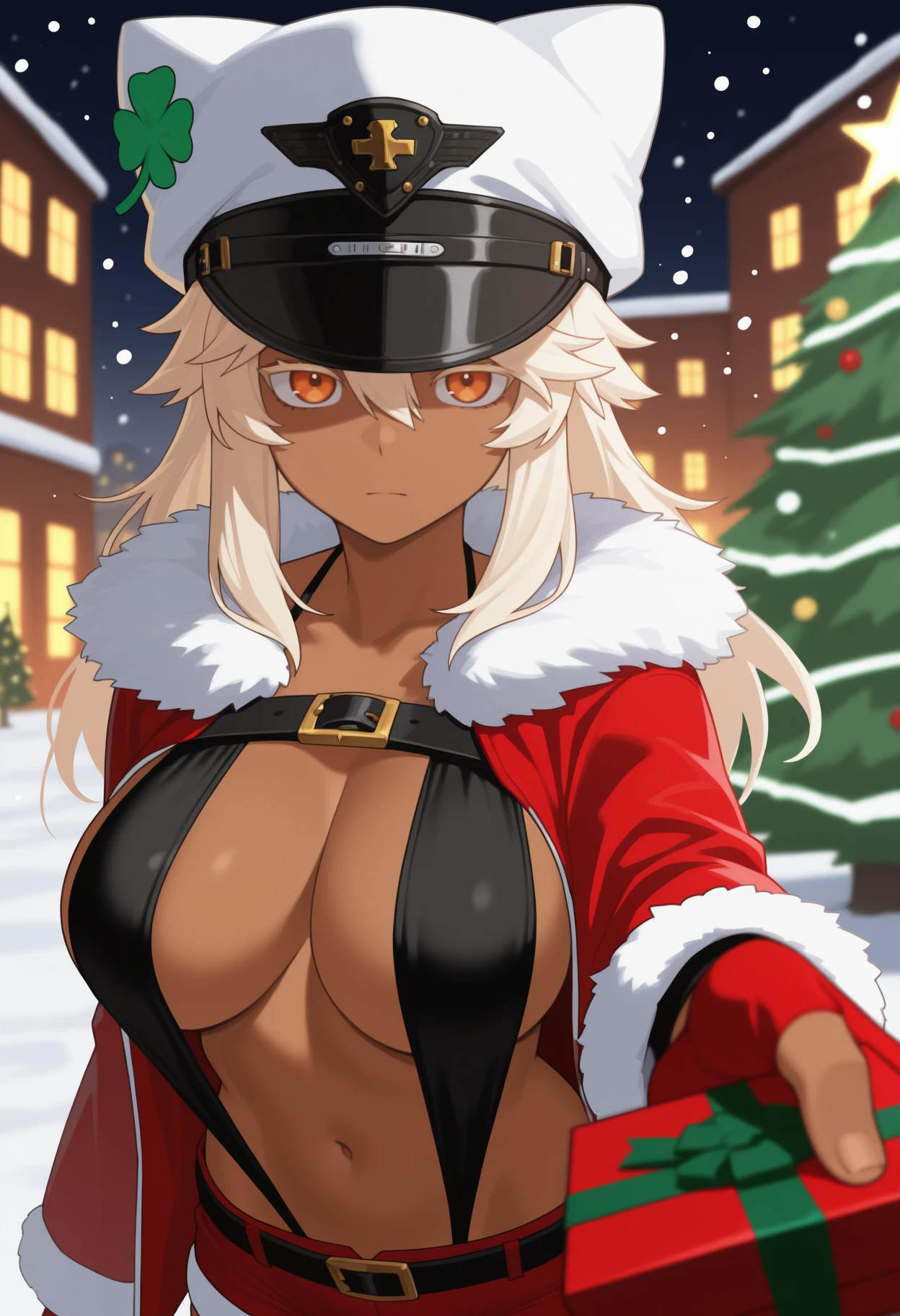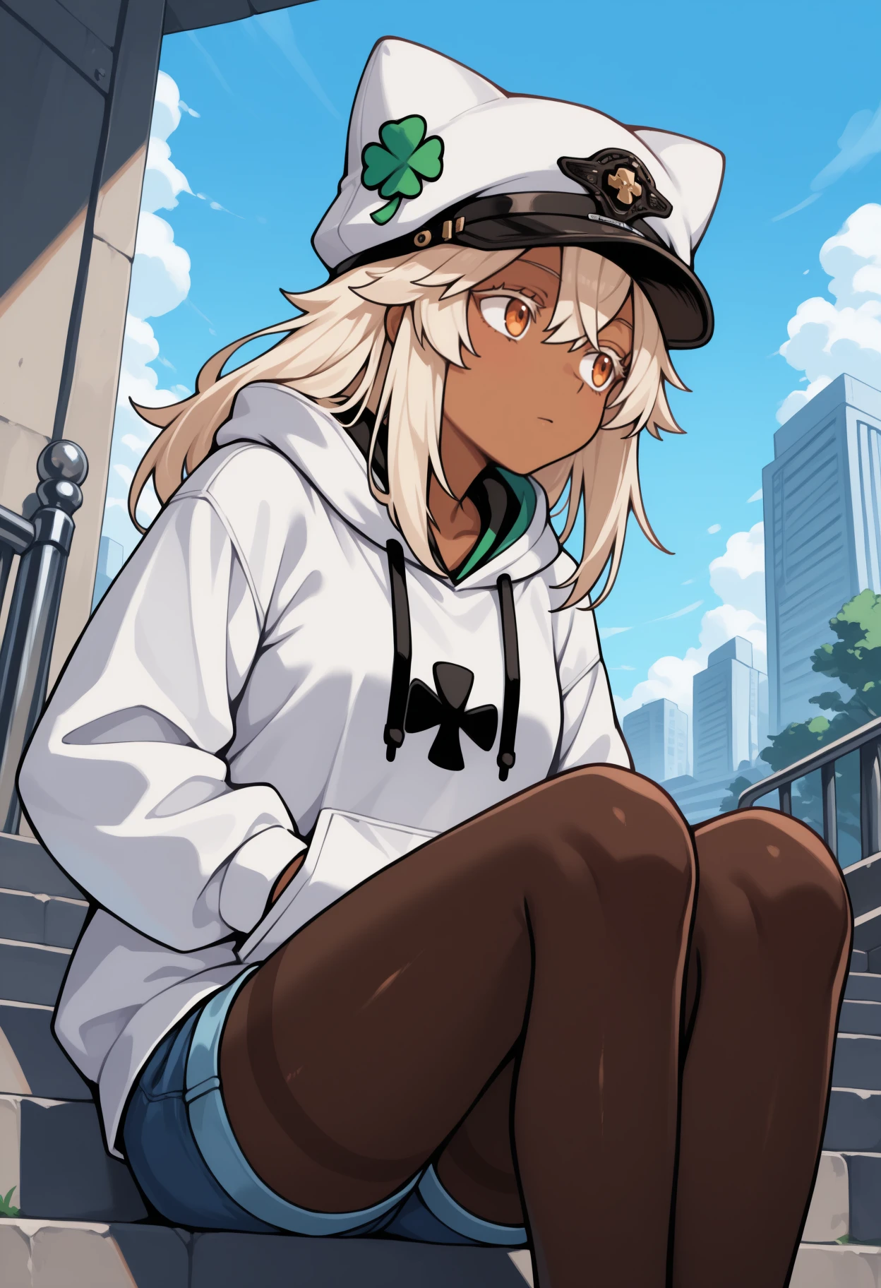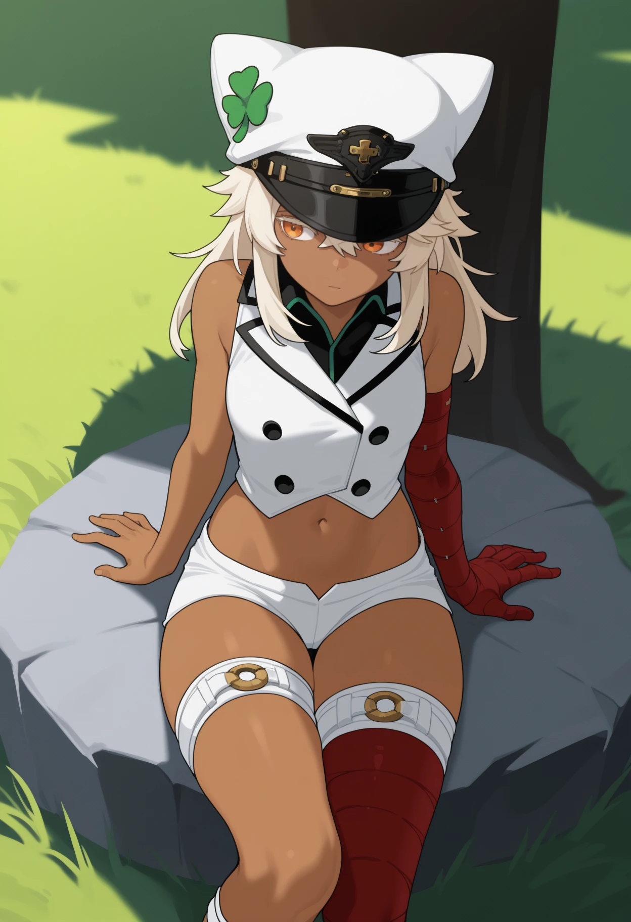 Default Outfit: white headwear, hat, four-leaf clover, white cape, collared cape, black belt, white vest, buttons, double-breasted, white gloves, fingerless gloves, white shorts, short shorts, thigh strap, bandages, bandaged arm, bandaged leg, midriff, navel