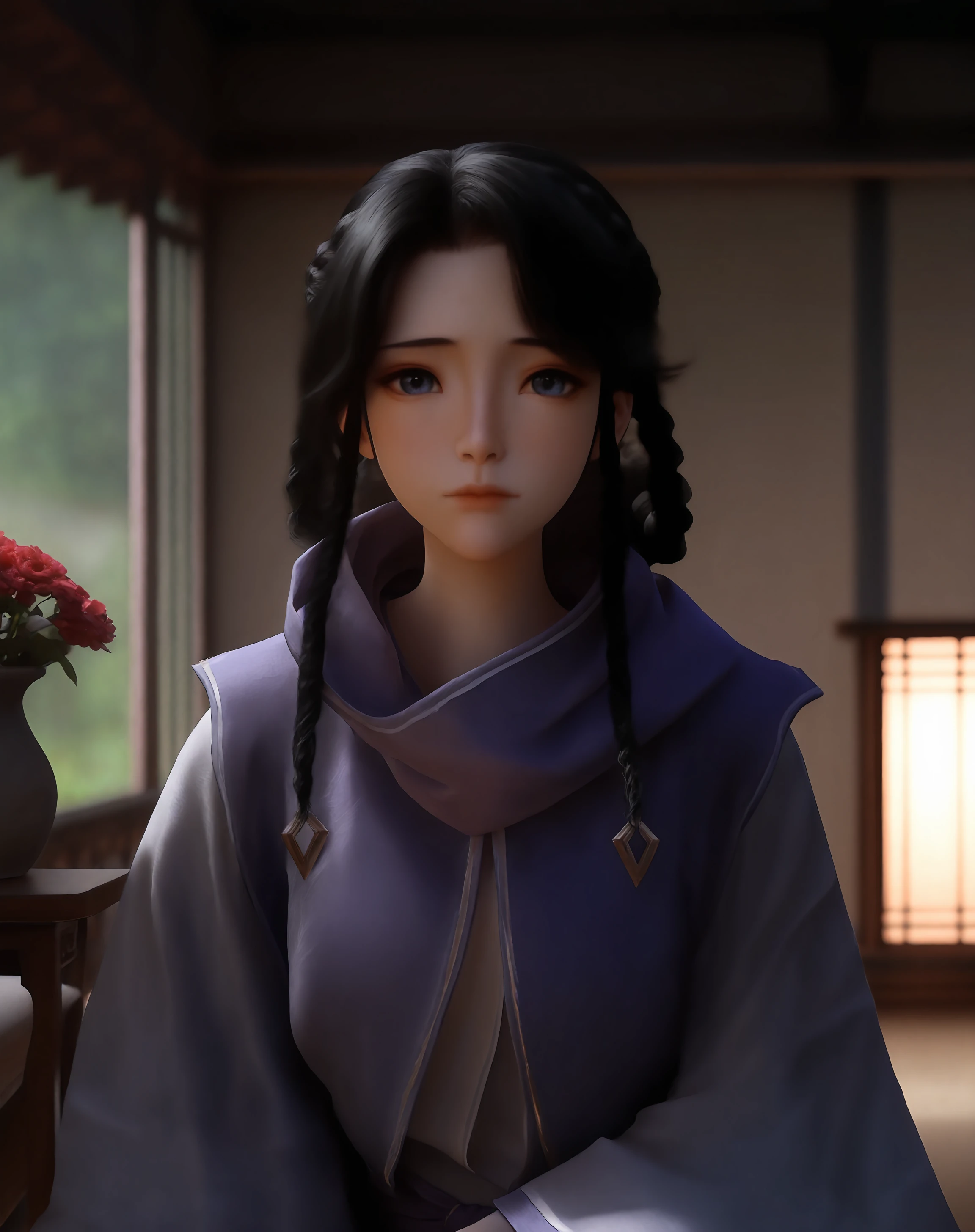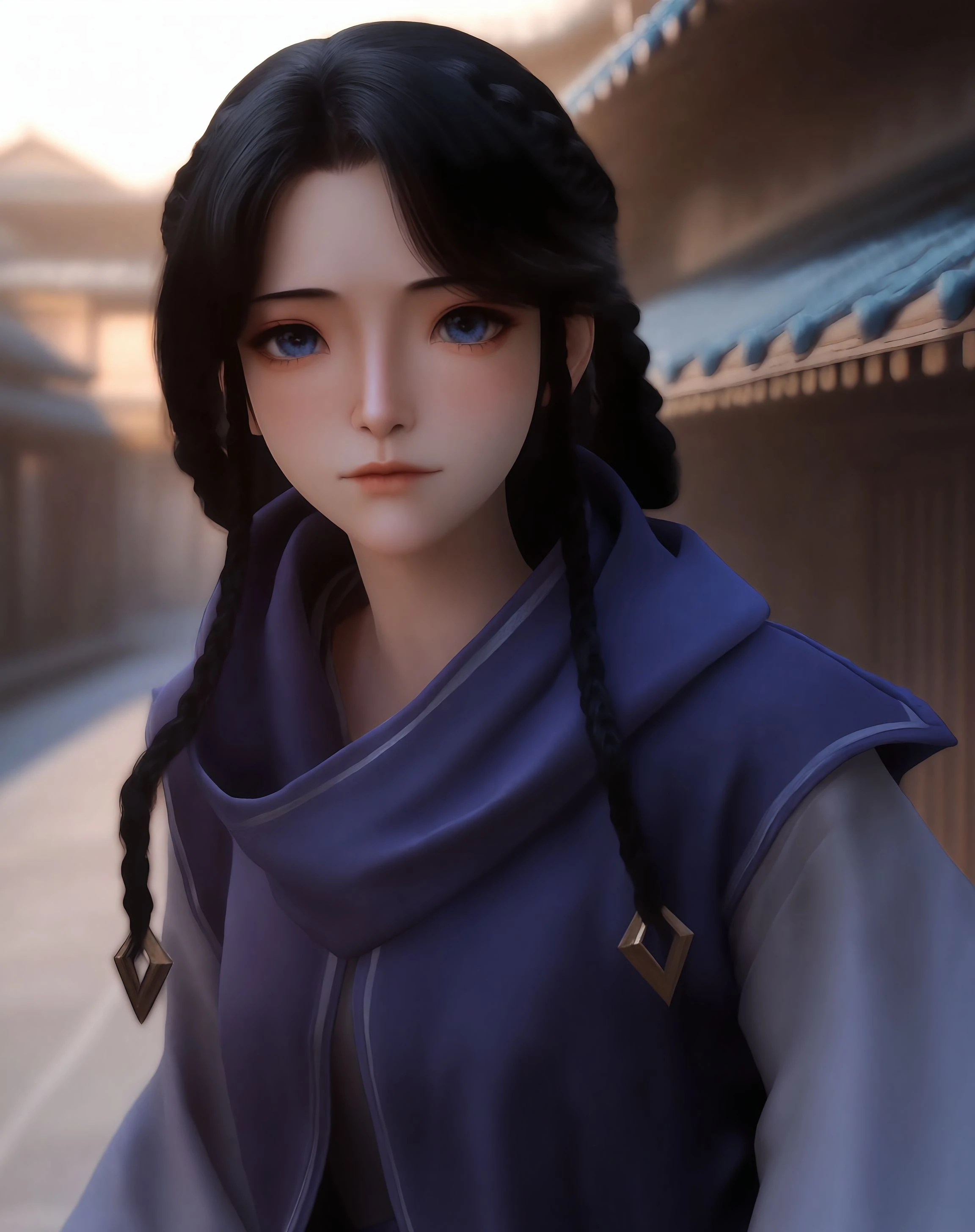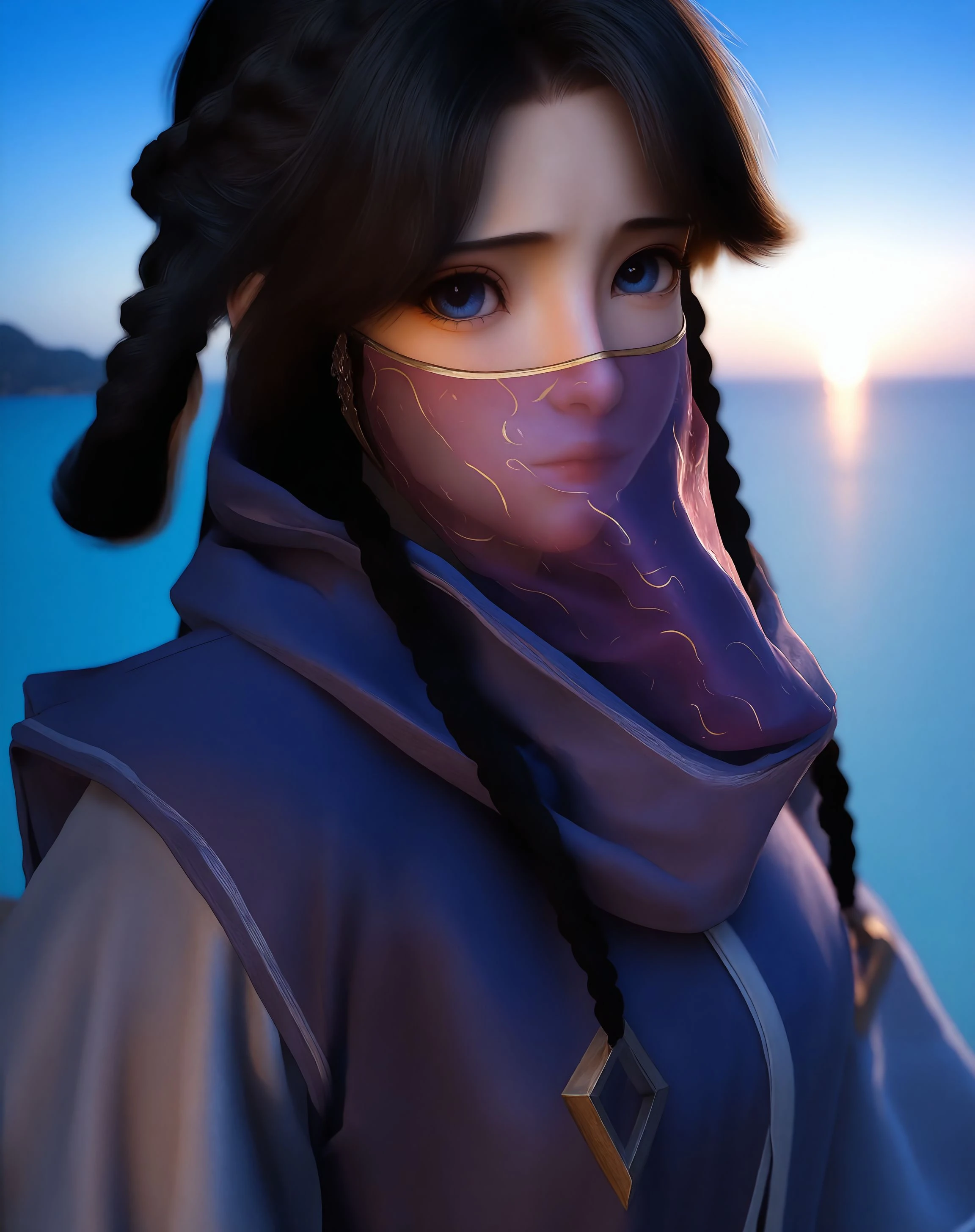 1girl,solo,black hair,veil,mouth veil,blue eyes,looking at viewer,long sleeves,long hair,braid,robe,wide sleeves,closed mouth,