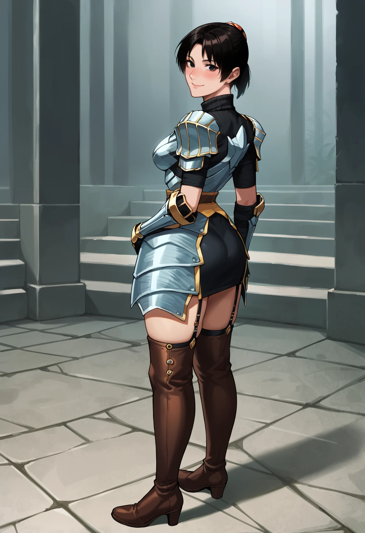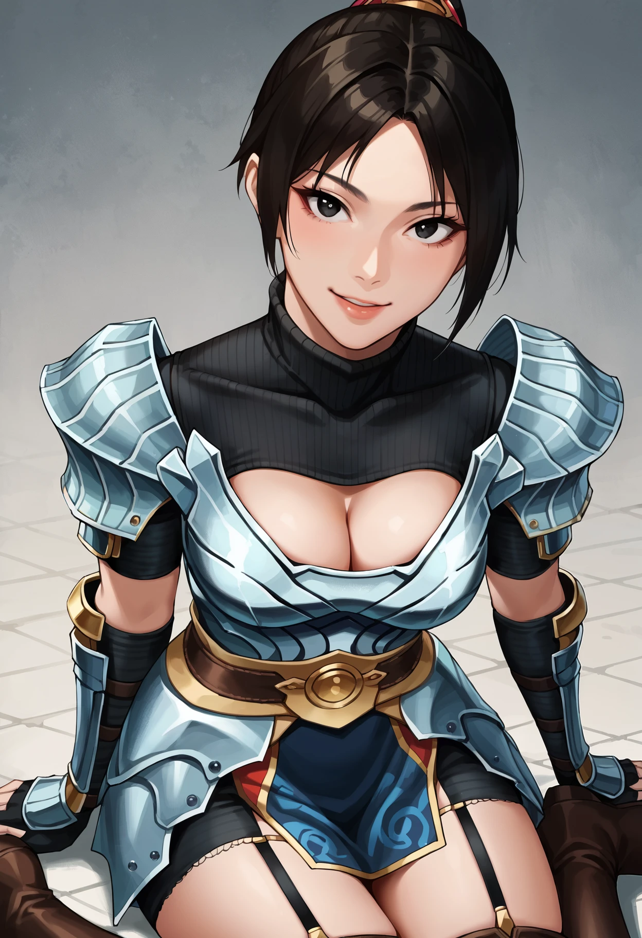 onioyu-plate, brown armor, cleavage cutout, scale mail skirt, breastplate, thighhighs, thigh boots, garter straps, gloves, fingerless golves, pauldrons, Silver armor (upgraded armor):