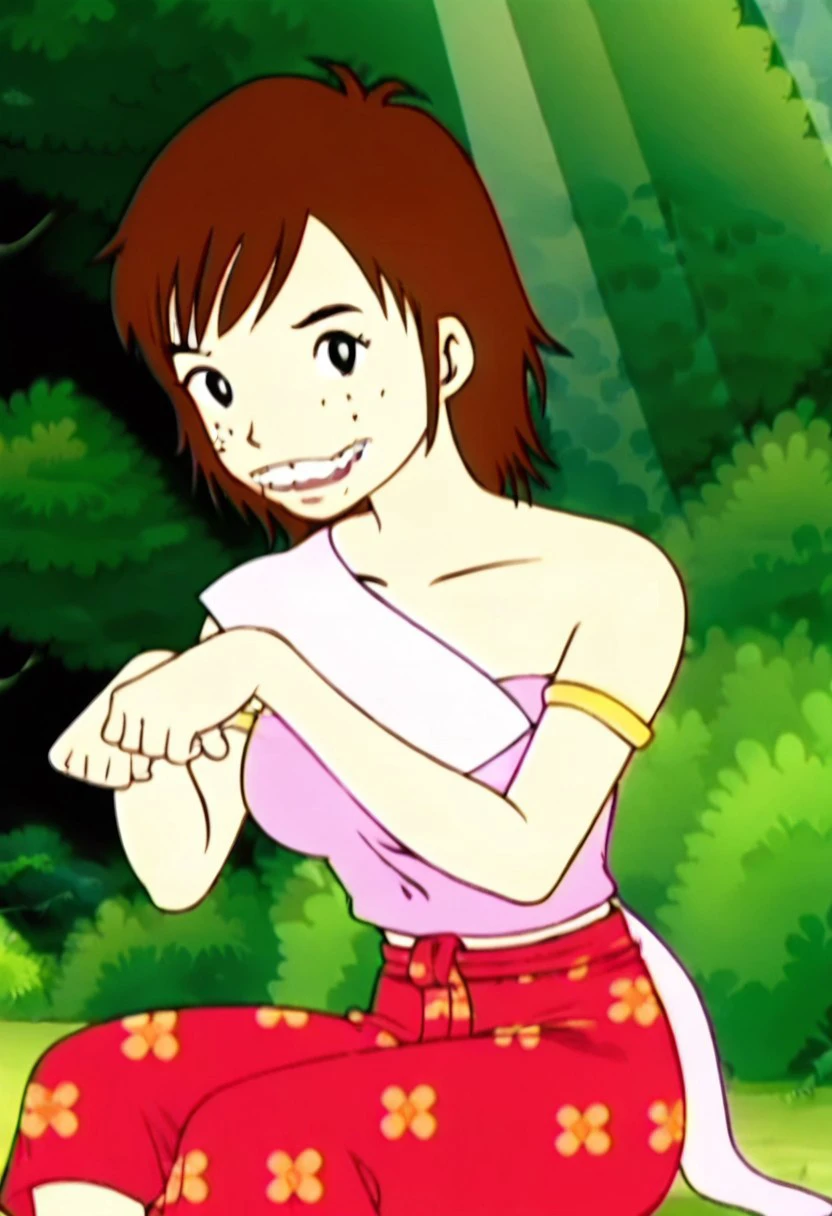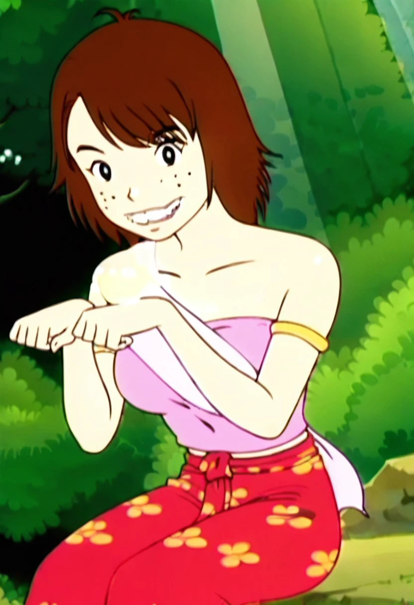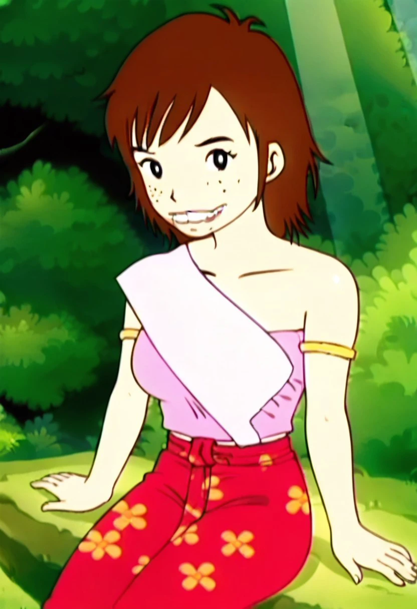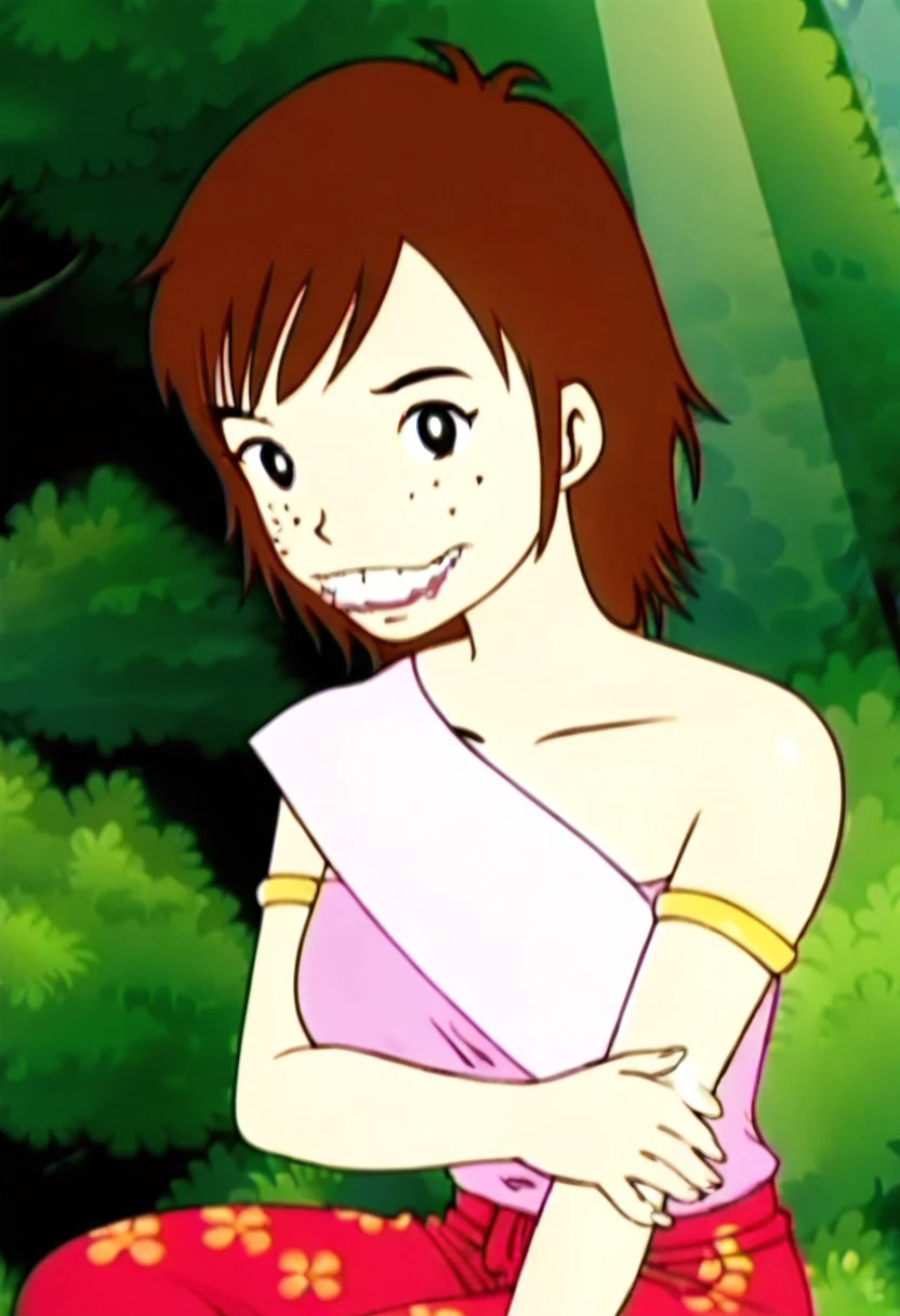 kaeo,1girl,brown hair, short hair, black eyes,overbite,teeth,freckles,bare shoulders,large breasts,