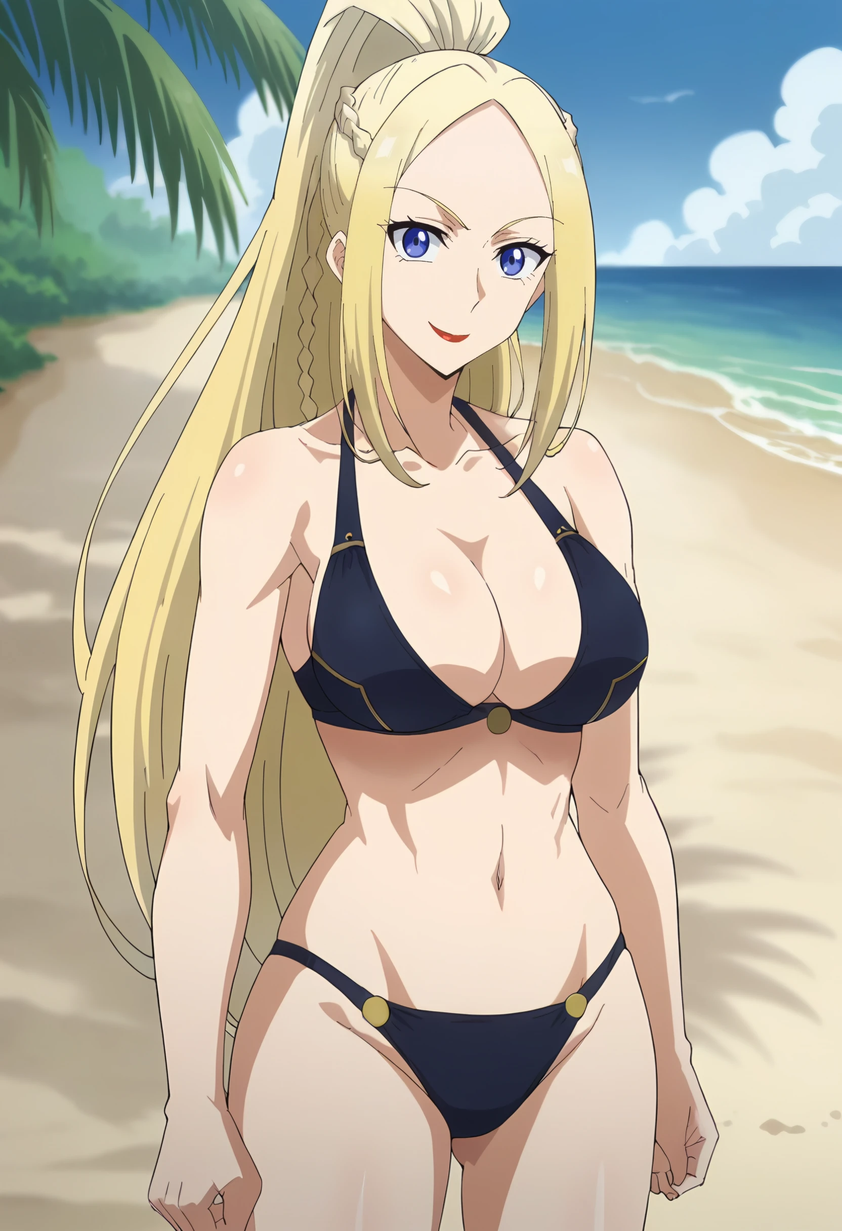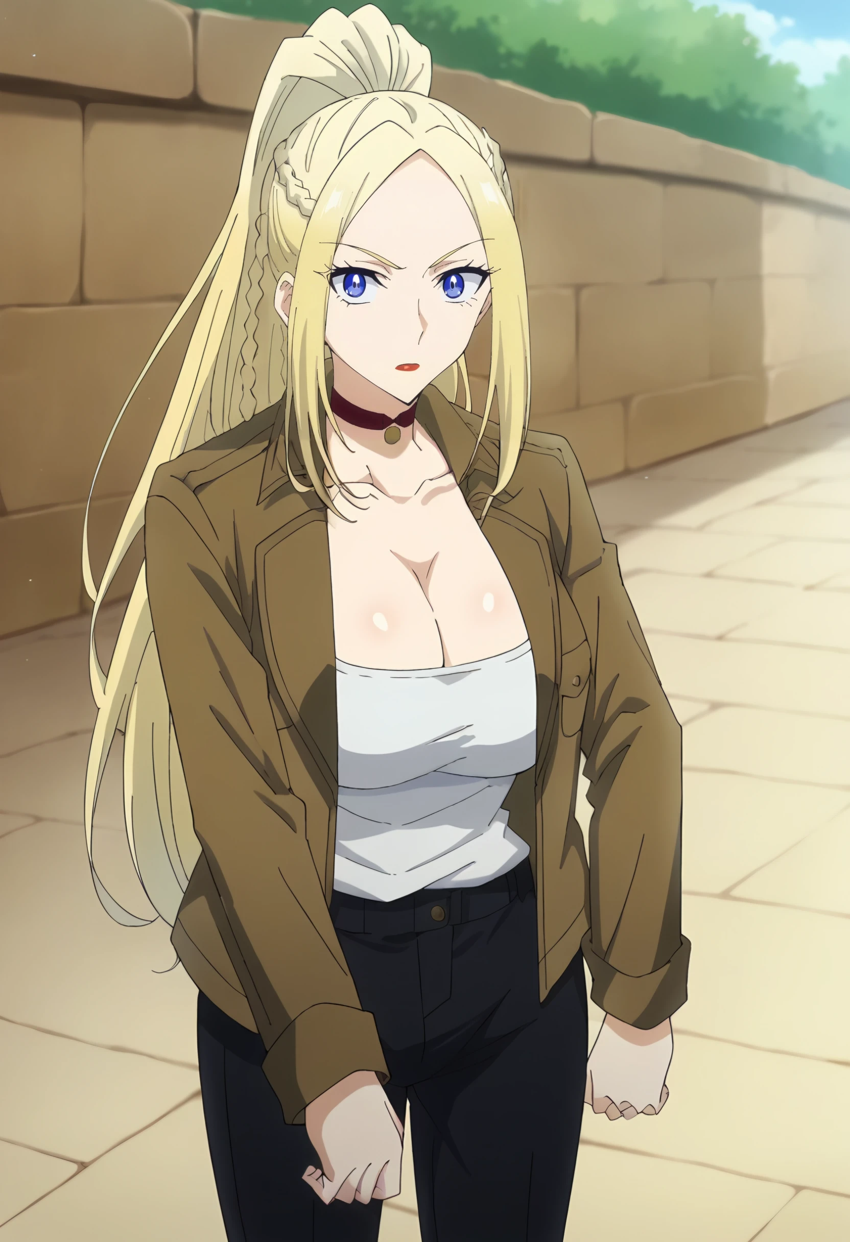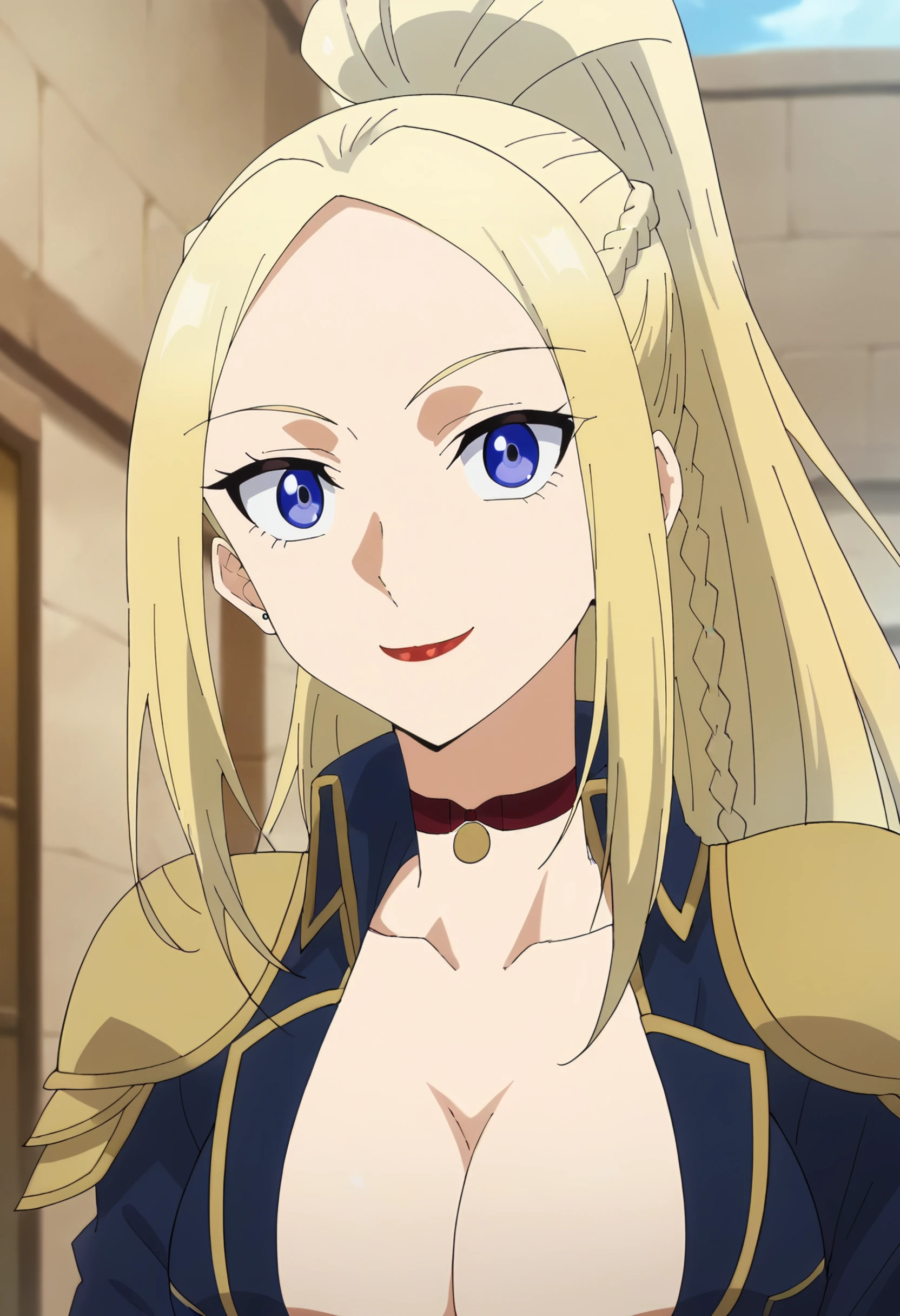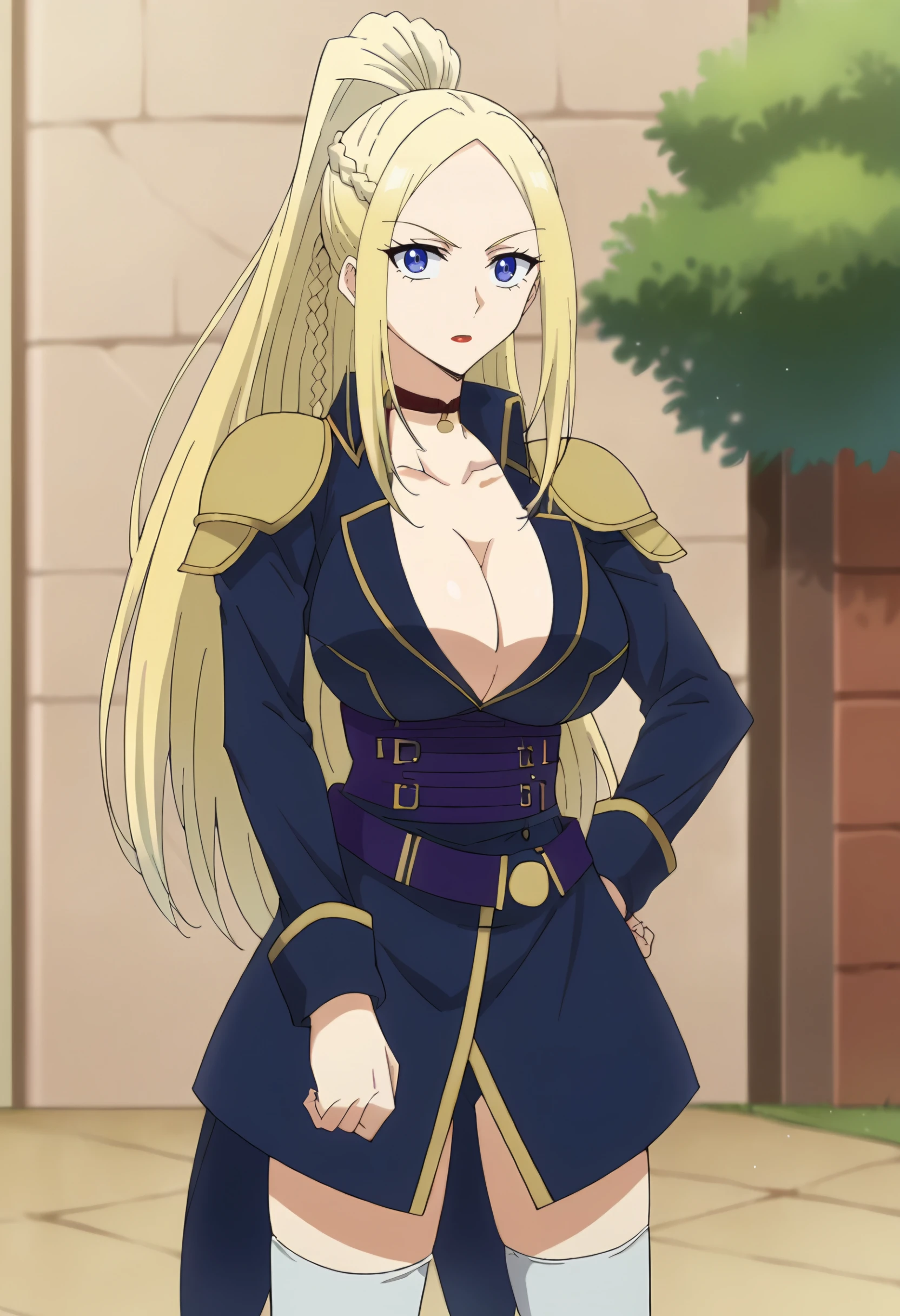 rionne bayreuth, blonde hair, 1girl, long hair, solo, braid, ponytail, blue eyes, makeup, lipstick, , large breasts,