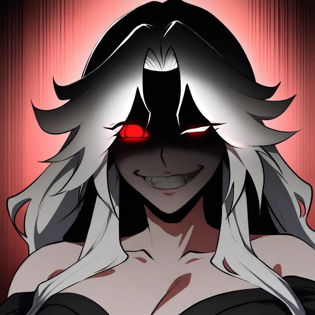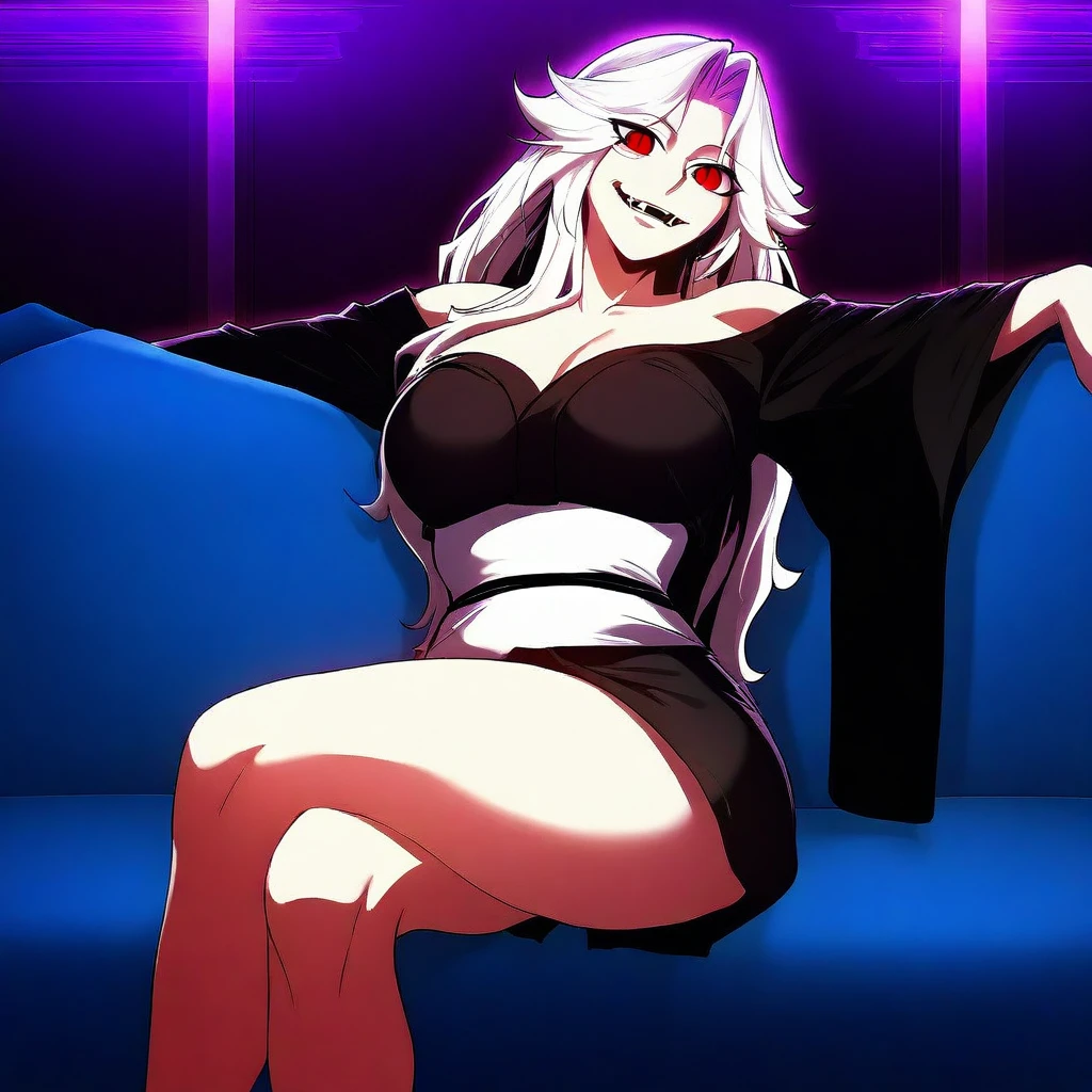 1girl, beautiful woman, oval face, bright crimson irises, slit pupils, light pink lips, vampire fangs, pure white hair, middle part bangs, hip-length hair, side hair strands, fluffy hair, wavy hair, hourglass figure, large breasts, narrow waist, wide hips, slim thighs,