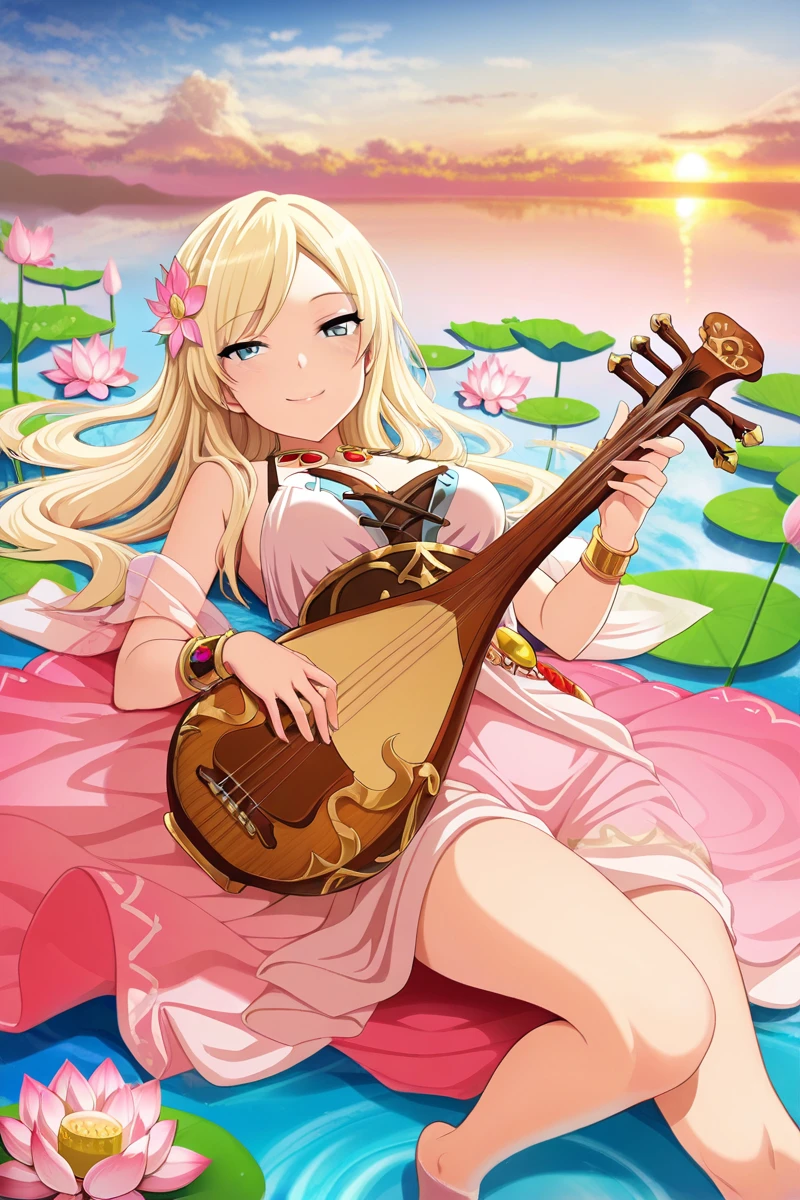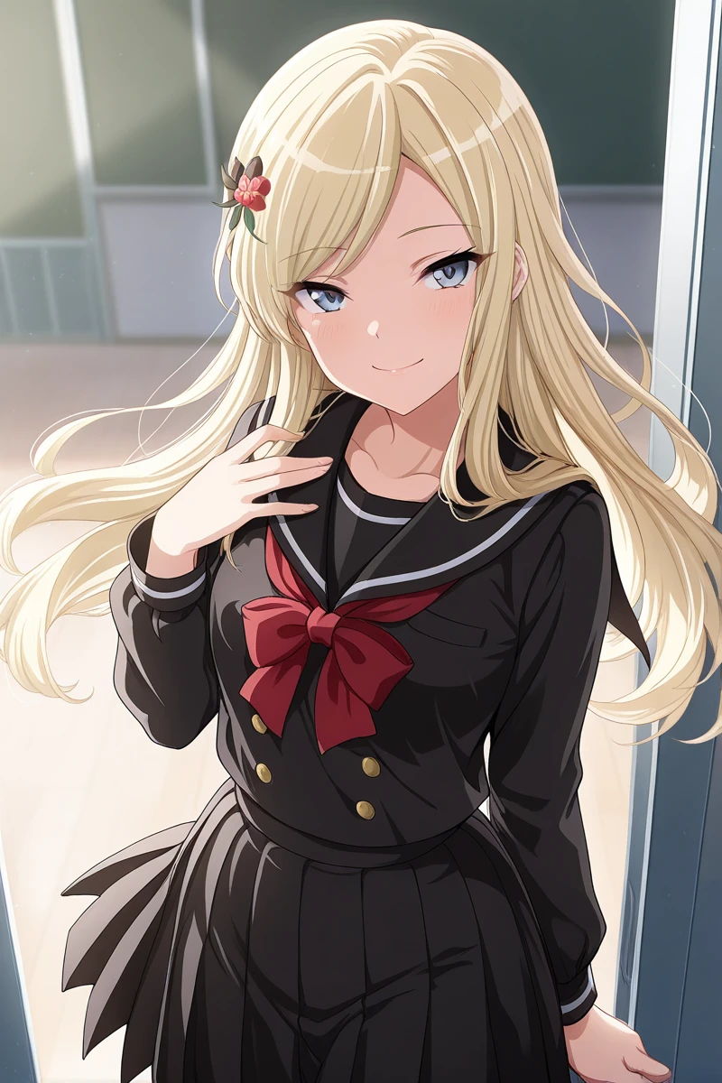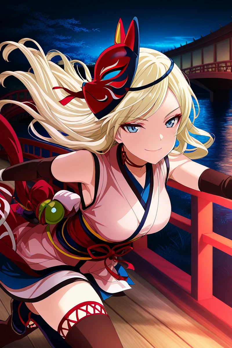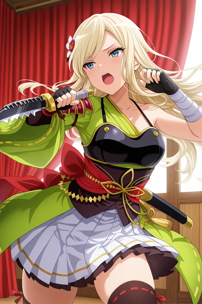 fumi, 1girl, solo, blonde hair, long hair, gloves, hair ornament, fingerless gloves, thighhighs, smile, black gloves, blue eyes, armor, looking at viewer, skirt, japanese clothes, flower, hair flower, shoulder armor, asymmetrical sleeves, japanese armor, sode, stage outfitDescription