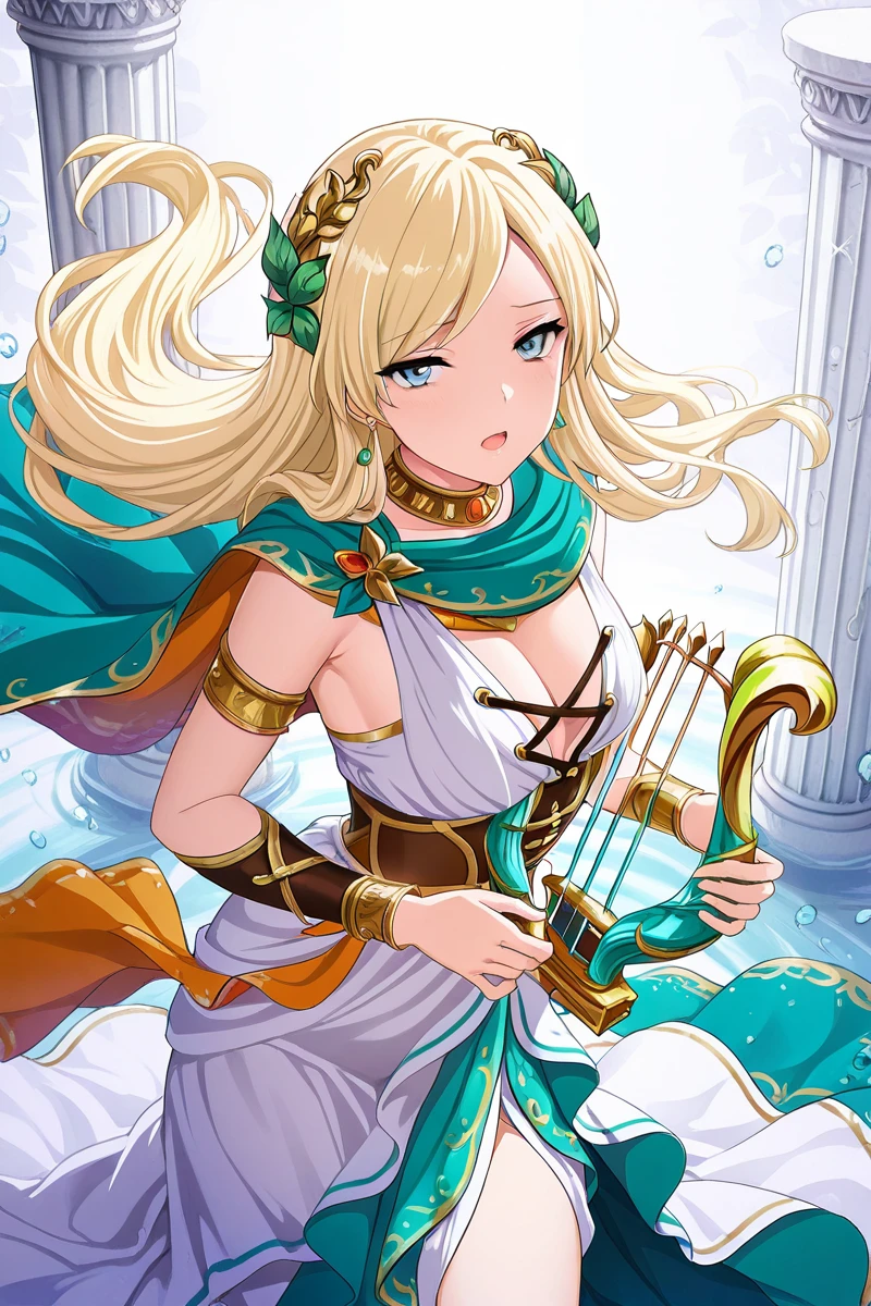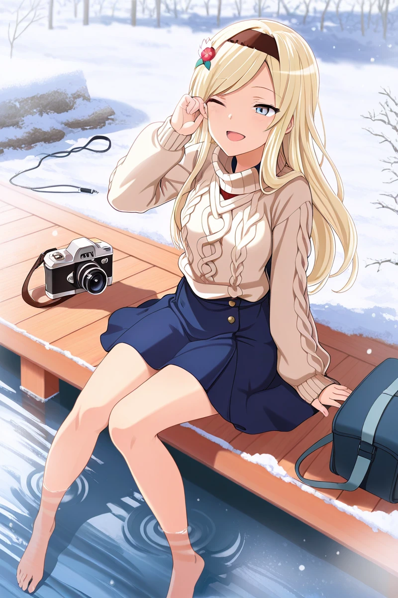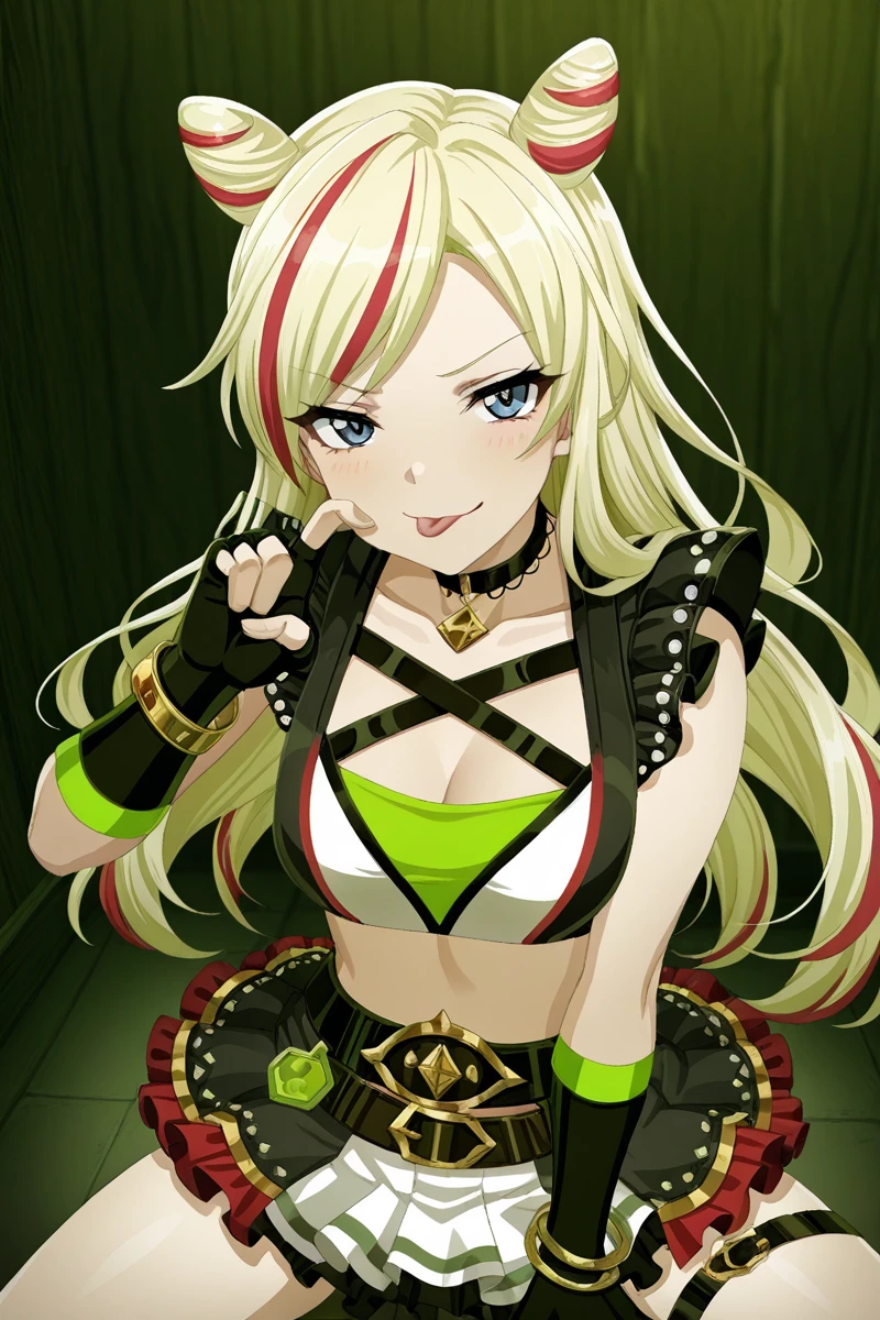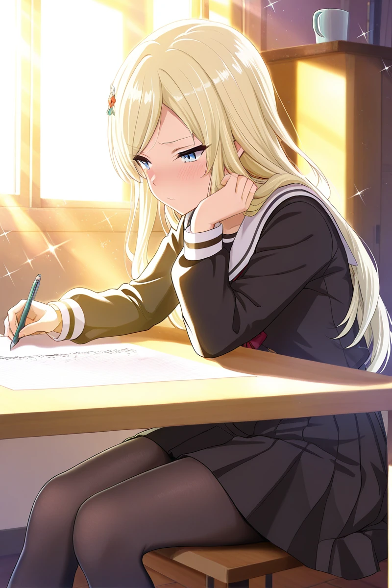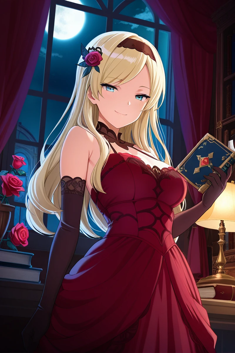 fumi, 1girl, solo, blonde hair, long hair, gloves, hair ornament, fingerless gloves, thighhighs, smile, black gloves, blue eyes, armor, looking at viewer, skirt, japanese clothes, flower, hair flower, shoulder armor, asymmetrical sleeves, japanese armor, sode, stage outfitDescription