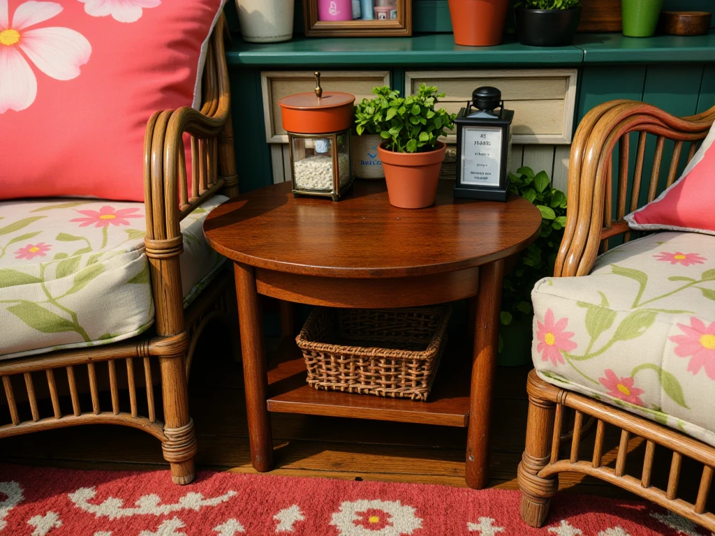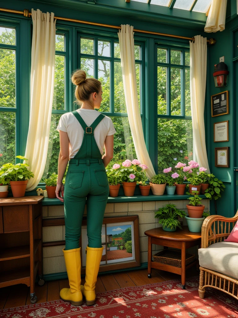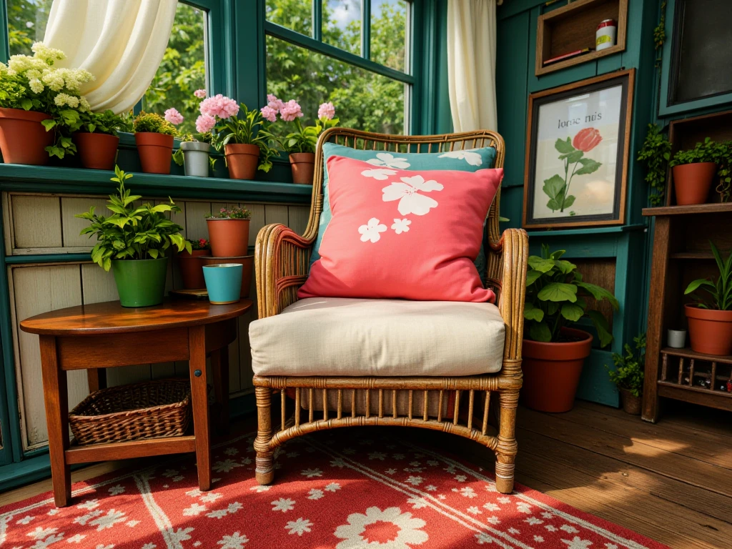 cozy and vibrant conservatory, deep teal walls surrounding a sunlit interior filled with lush greenery and potted plants arranged along a sturdy wooden shelf beneath large windows. Warm natural light streams through glass panels and reflects across light wooden plank flooring, casting soft plant shadows. A rattan armchair with a patterned cushion rests in the foreground beside a small round wooden side table. Pink and white blooms appear among varied foliage in terracotta pots placed on shelves and floor. A partially open teal door with glass panels reveals additional greenery outside, while curtains hang lightly near the windows, completing the serene garden-connected space.
