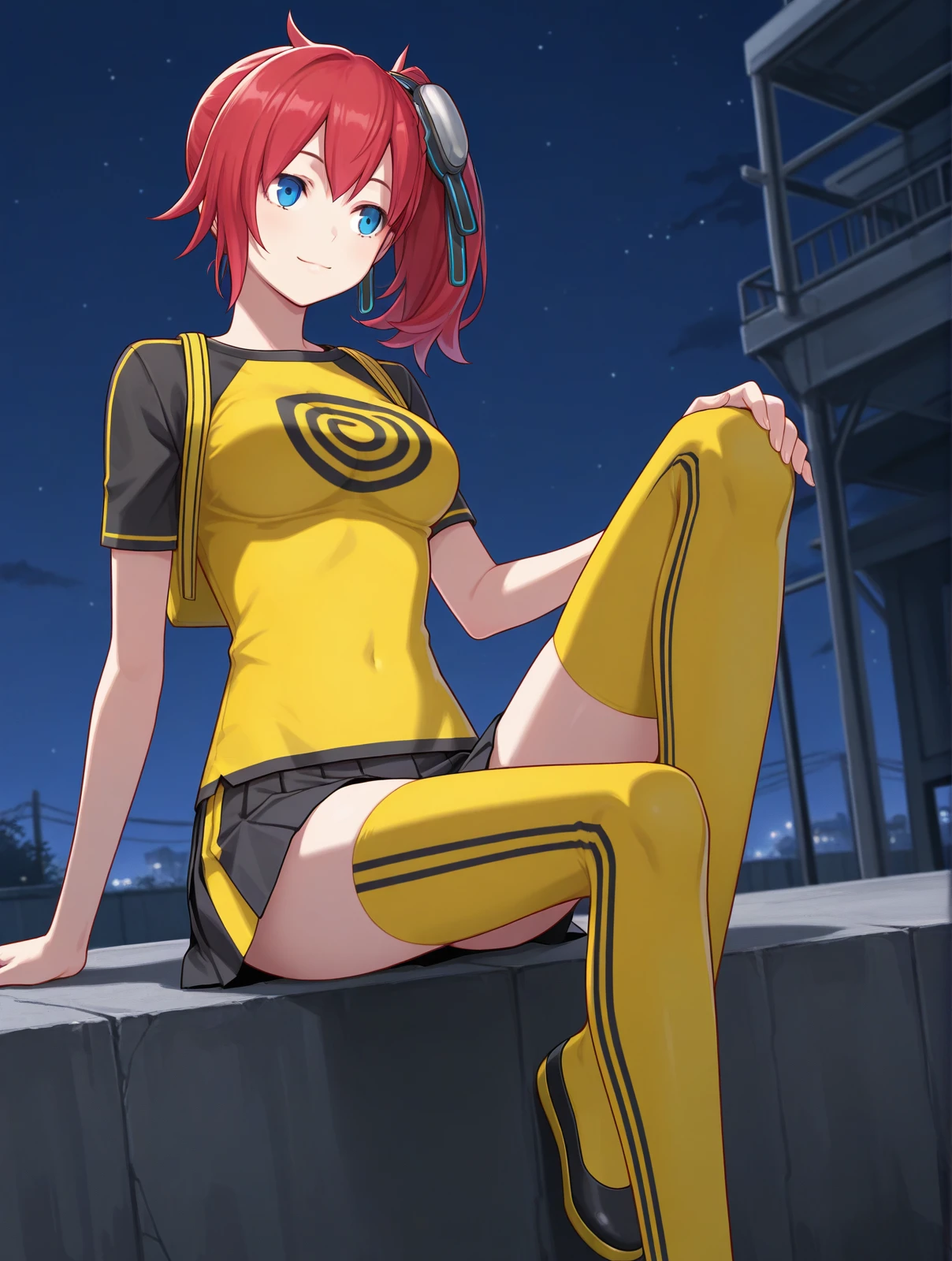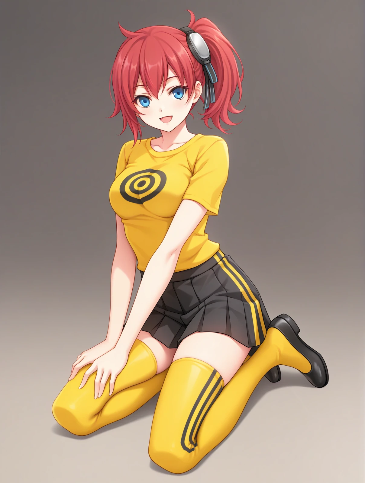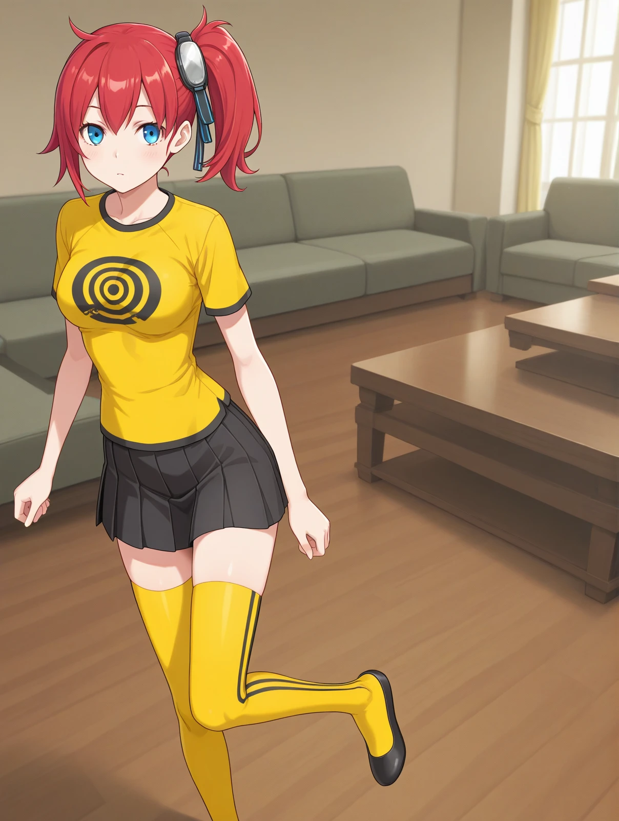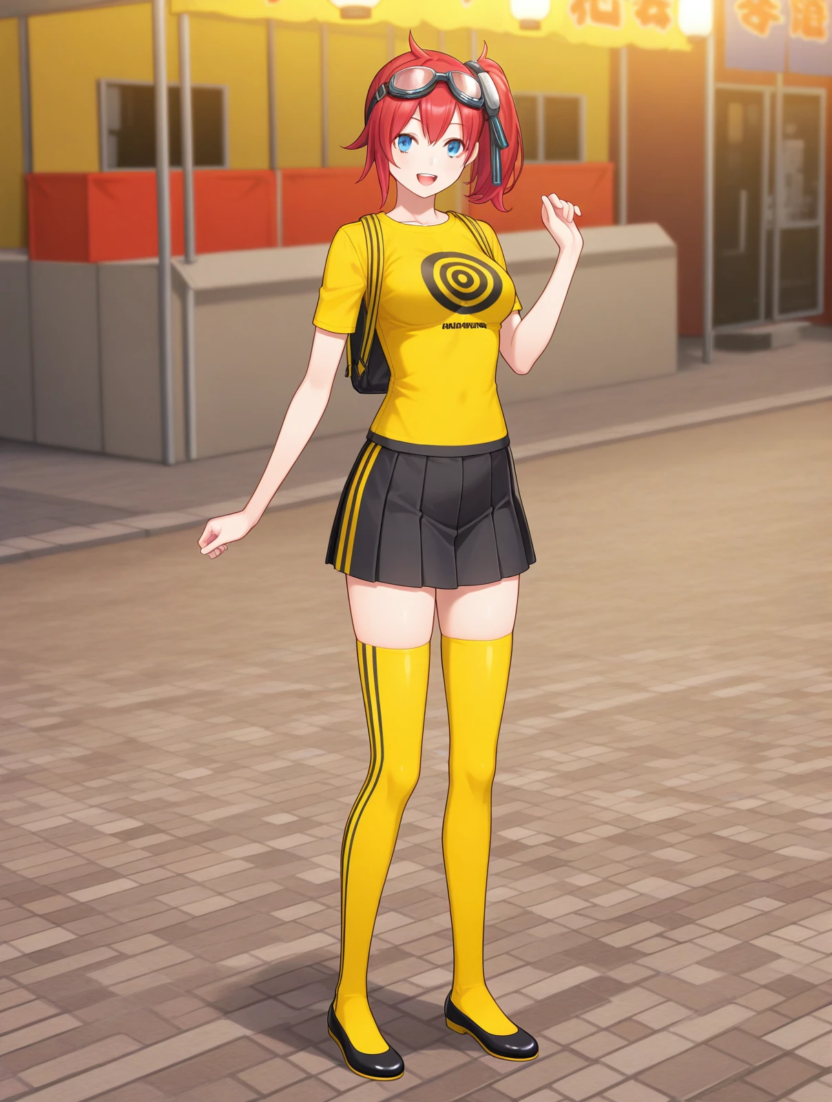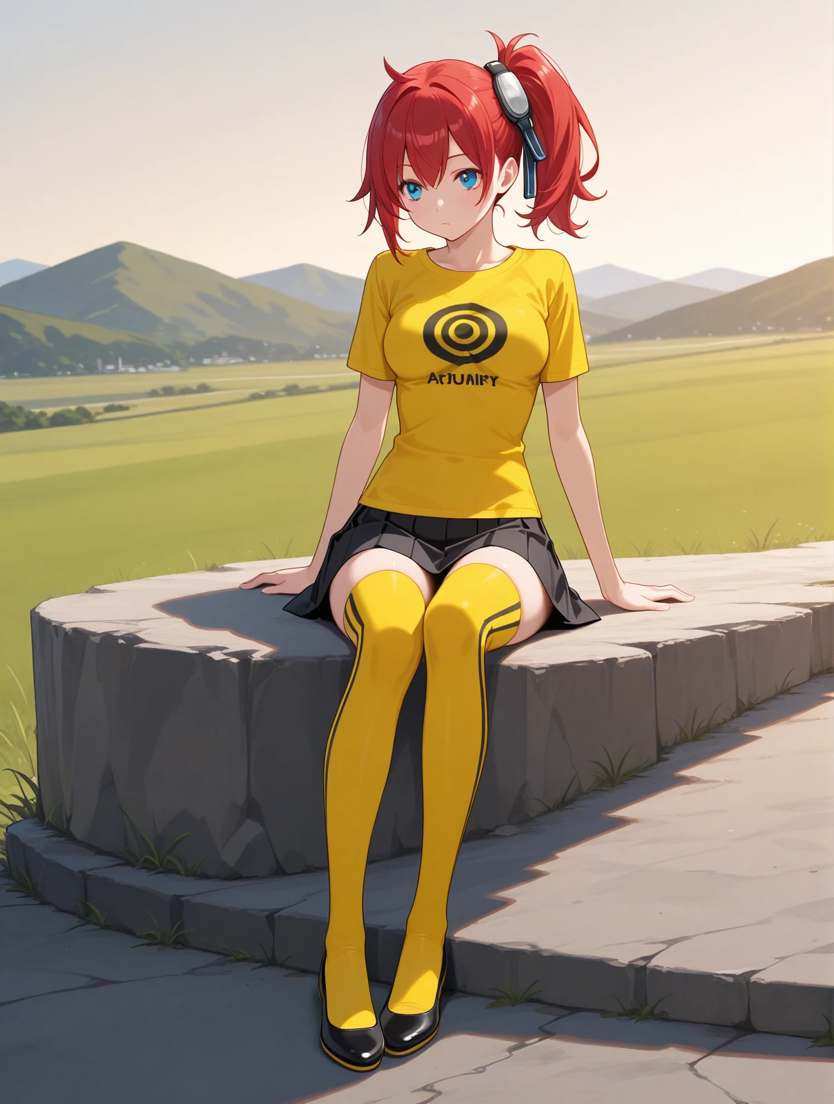yellow shirt print shirt black skirt yellow thighhighs black flats