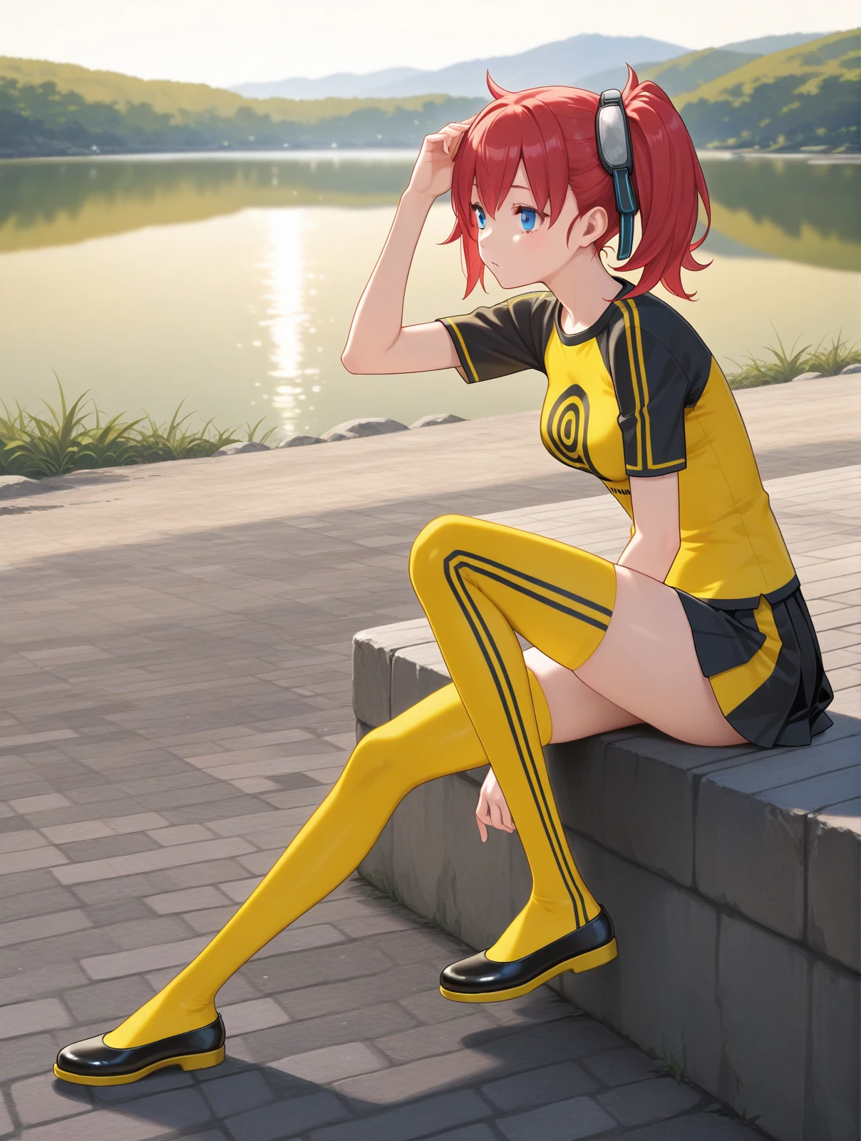 dsc-ami, blue eyes, red hair, side ponytail, goggles on head,