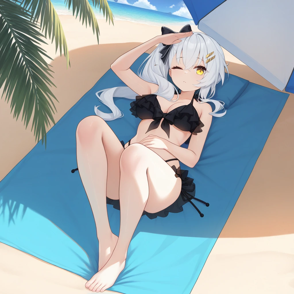 SuzakuinTsubaki, Szt_Swm, white hair, side ponytail, ponytail, hair over shoulder, yellow eyes, frilled ??????, black ??????, string ??????, frills, microskirt, multi-strapped ?????? bottom, halterneck, black ribbon, ?????? skirt, see-through skirt, front-tie ?????? top, black bow, gold hairclip, hair bow, black ????? straps,Wedding Outfit: