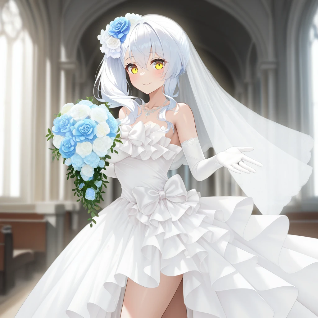 SuzakuinTsubaki, Szt_Wed, white hair, side ponytail, ponytail, hair over shoulder, yellow eyes, wedding dress, frilled dress, long dress, white bow, large bow, light blue rose, hair flower, see-through veil, bridal veil, strapless dress, necklace, elbow gloves, white gloves, collarbone, ???? shoulders,The results of your generations are dependent on the additional LoRAs, weights, and models you use, so it may not work or come out as consistent as my sample images.