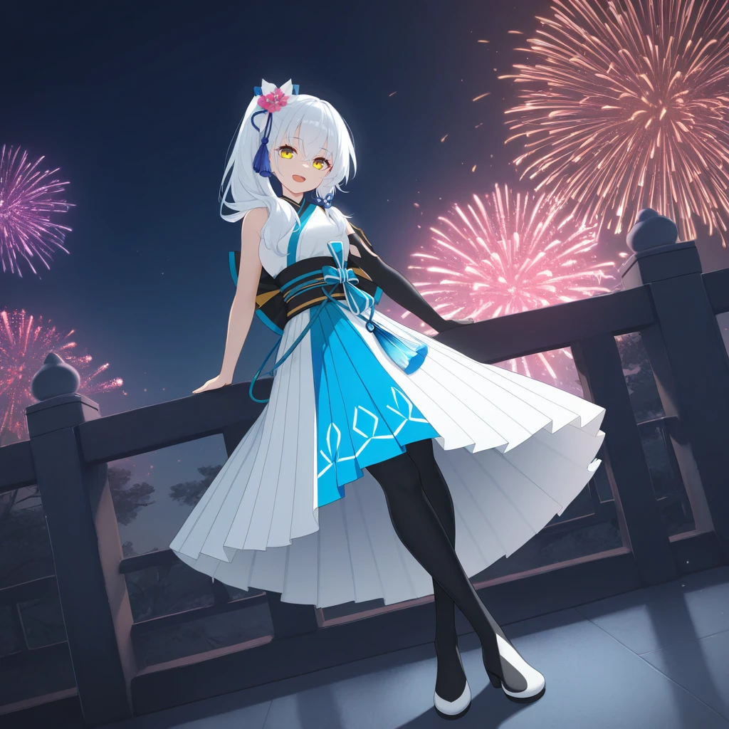 SuzakuinTsubaki, Szt_Def, white hair, side ponytail, ponytail, hair over shoulder, yellow eyes, collared shirt, white shirt, school uniform, buttons, underbust, white cape, two-sided cape, high collar, striped necktie, red necktie, red ribbon, long ribbon, black belt, hair ornament, white sleeves, short sleeves, blue skirt, frilled skirt, black pantyhose, black bow, hair bow, hair flower, pink flower, hair ribbon, blue tassel, white footwear, ankle boots, Japanese Outfit: