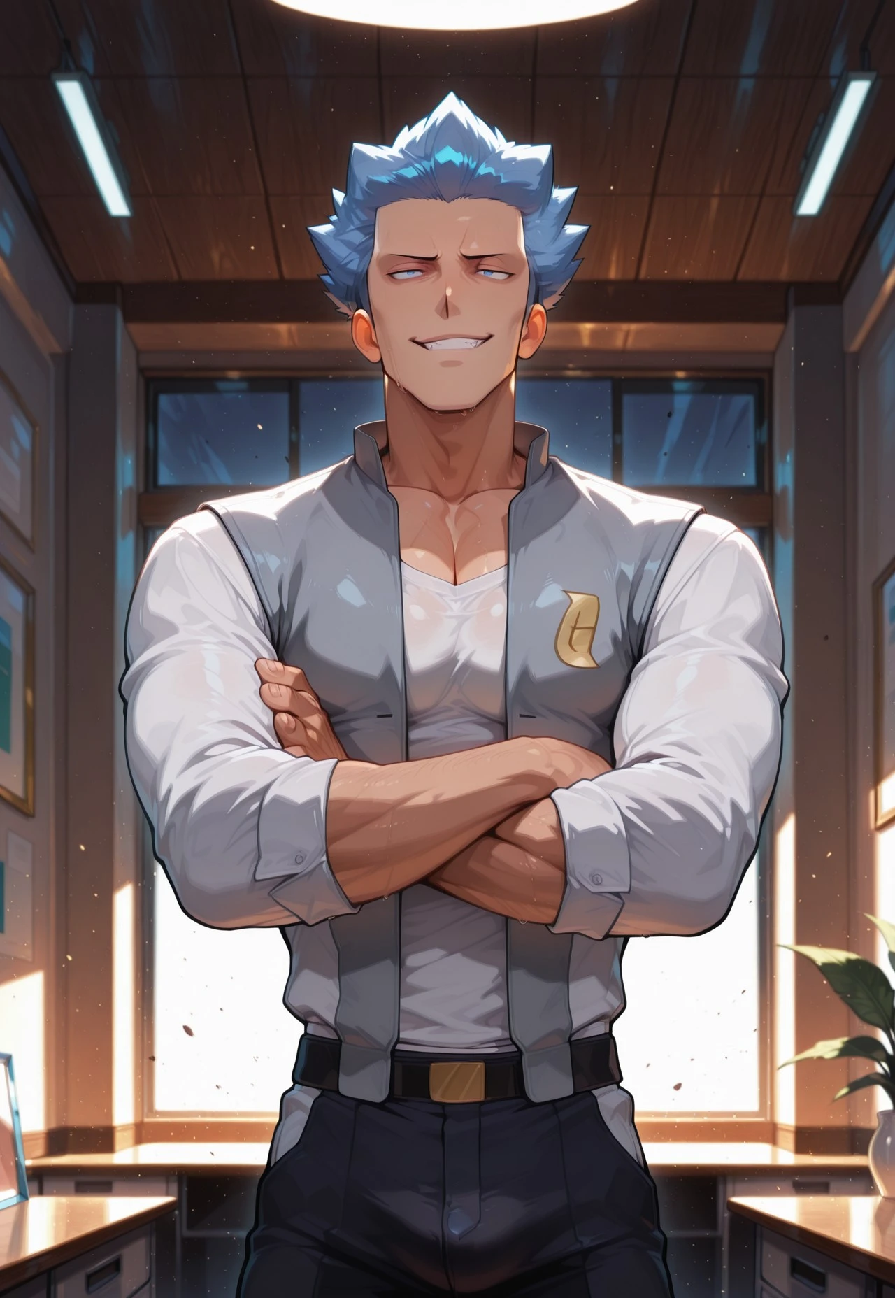Cyrus, blue hair, spiky hair, blue eyes, grey vest, black pants, white shirt, long sleeves,