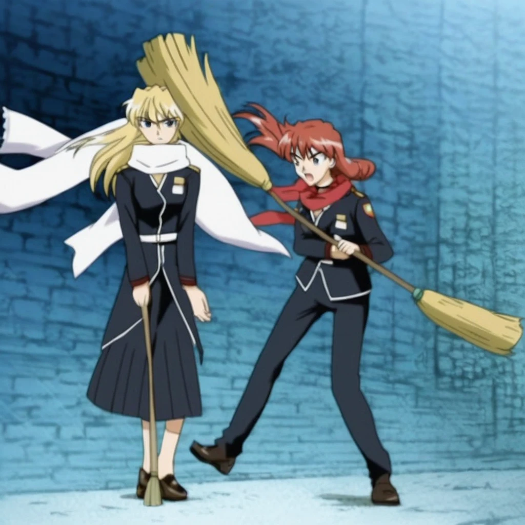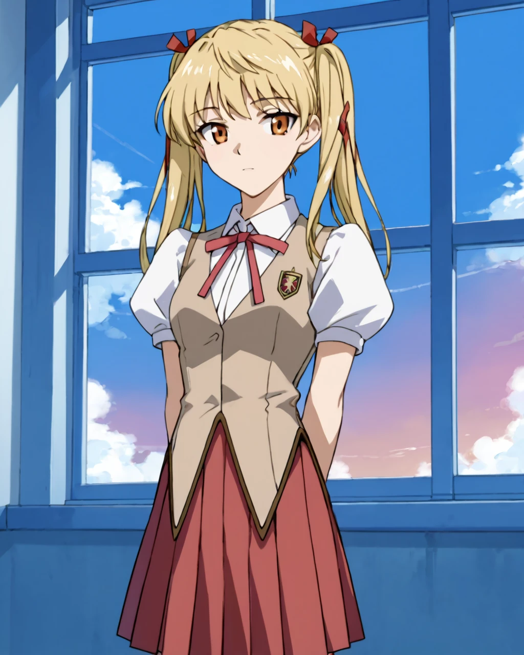 • Eri Sawachika, Eri, Blonde hair, Amber eyes, 1girl, solo, school uniform, skirt, twintails, puffy sleeves, vest, ribbon, pleated skirt, red skirt, shirt, short sleeves, red ribbon, white shirt, long hair, puffy short sleeves, hair ribbon, brown vest,collared shirt