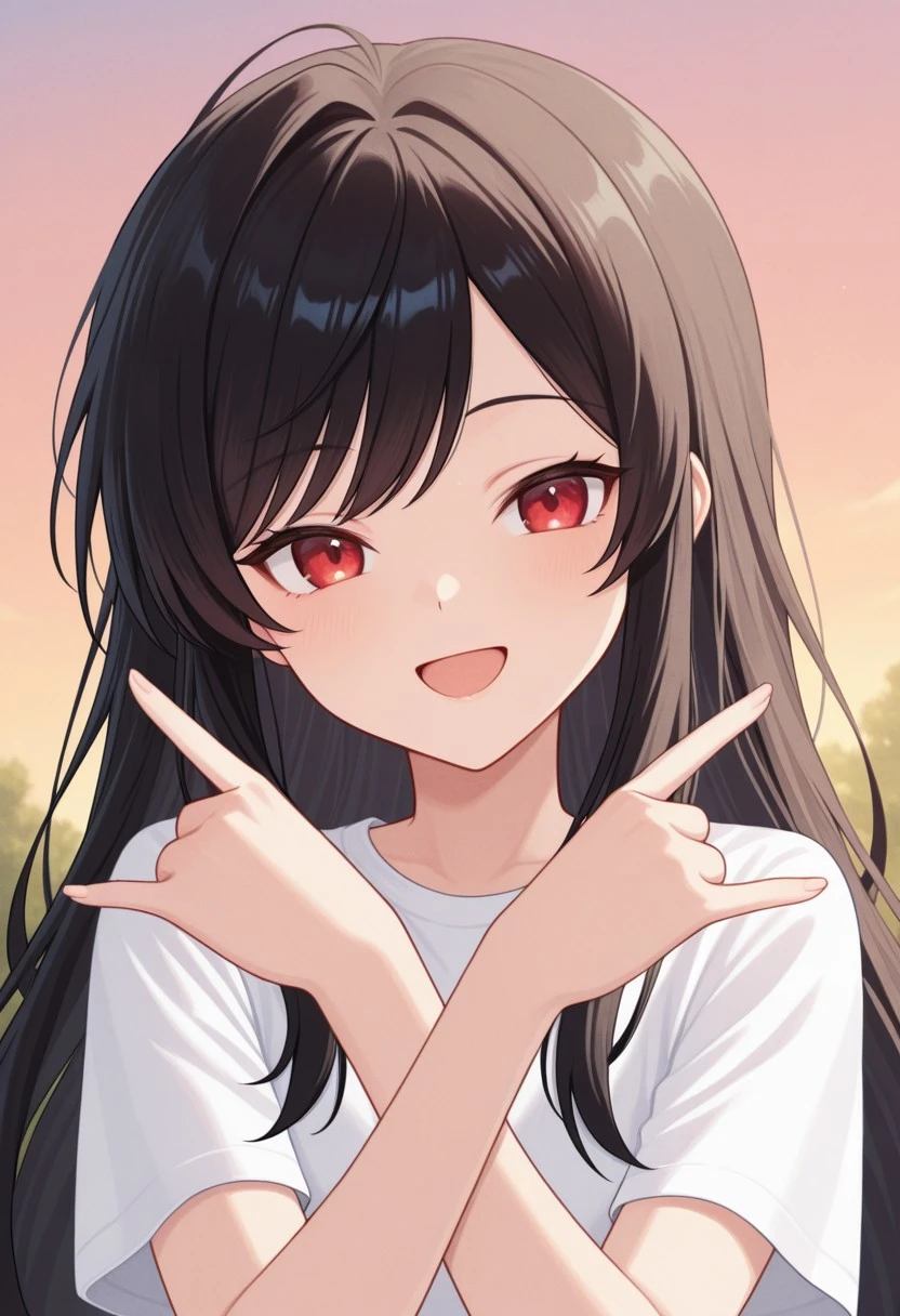 solo, 1girl, black hair, red eyes, long hair, swept bangs, white t-shirt, rnr_crd_pose, facing viewer, portrait, looking at the viewer, smile, open mouth, outdoor, skyLook to "About this Version" section for more info.