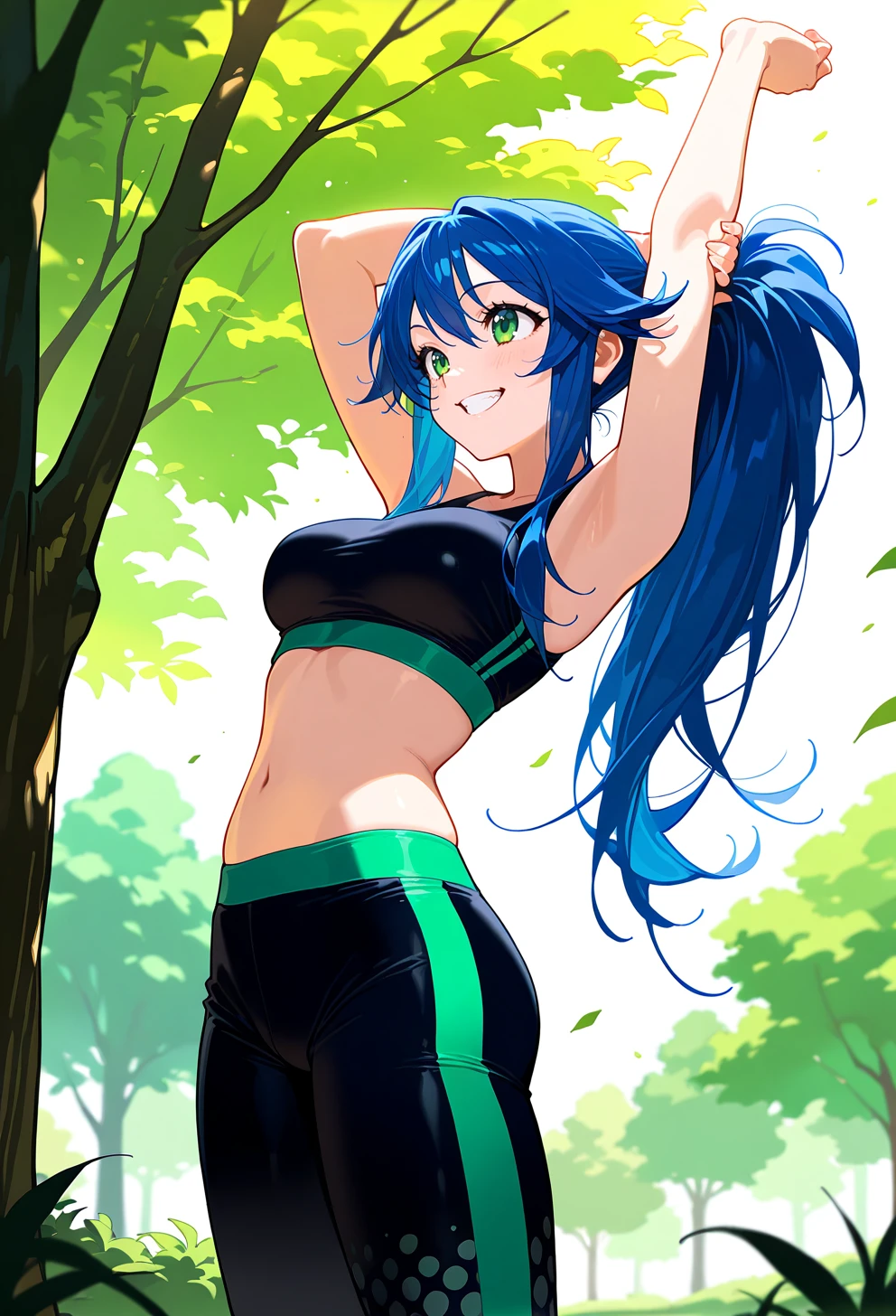 blue hair, green eyes, long hair,Outfit: