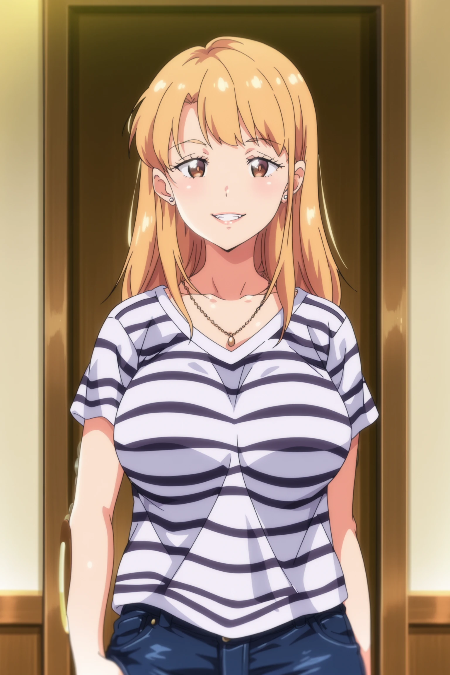 Aika Sano, 1girl, solo, blonde hair, long hair, brown eyes, stud earrings, ????????????? | ponytail, jewelry, necklace