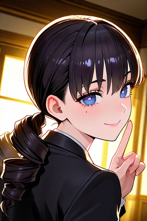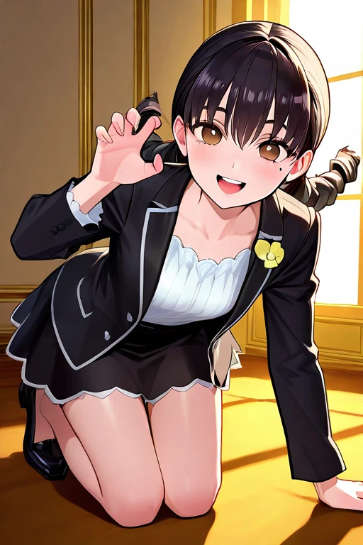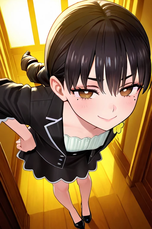 mole under eye, brown eyes,black hair,TWINBRAID,twin tales,twin drill hair,black suit,white shirt,black skirt,green stripe panty,