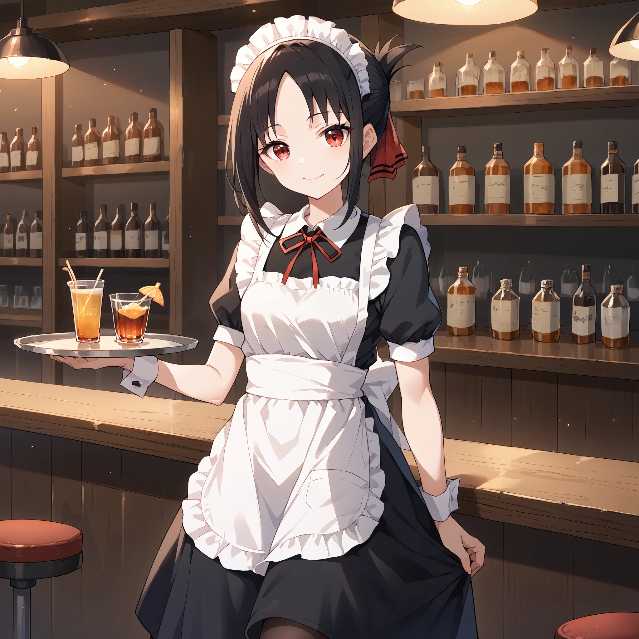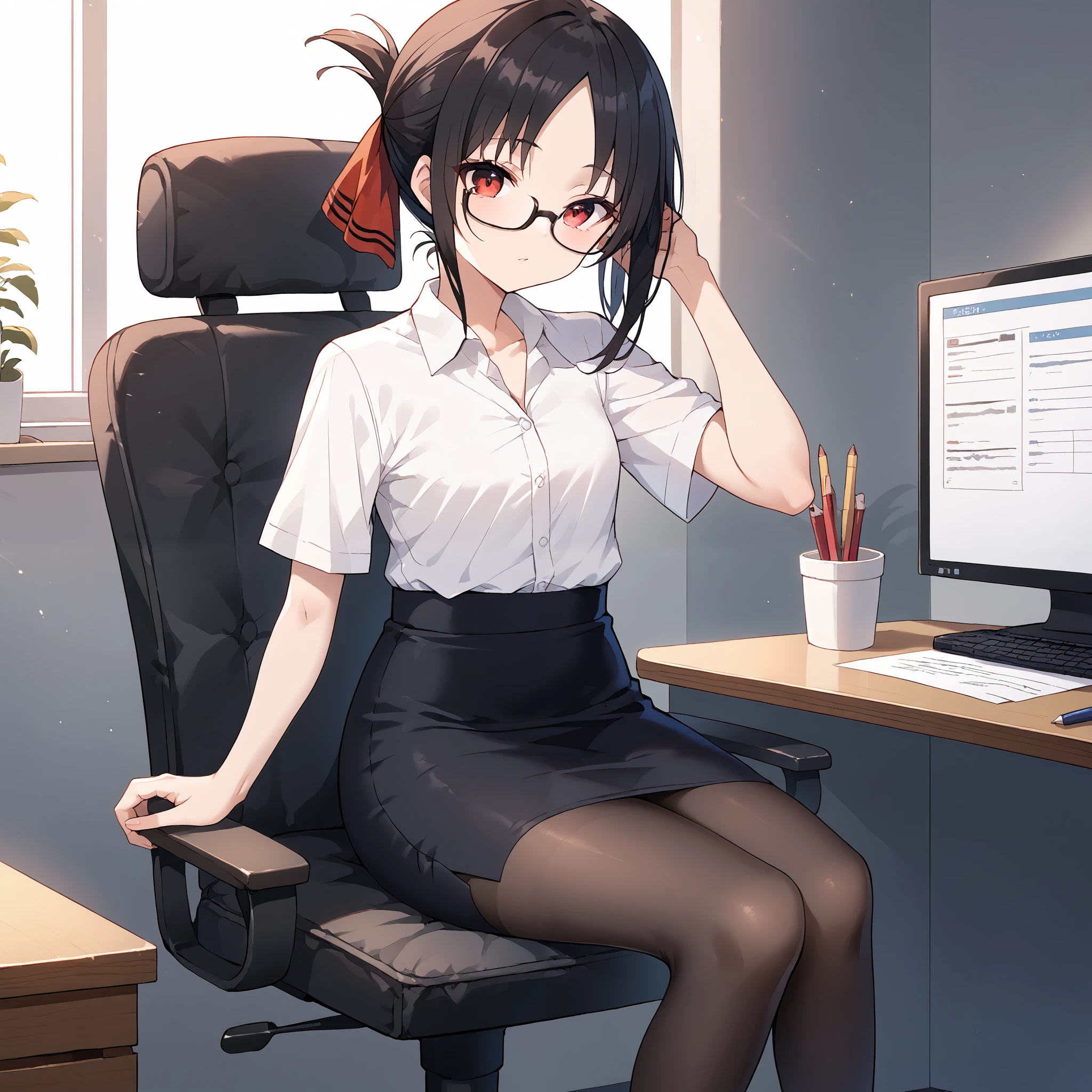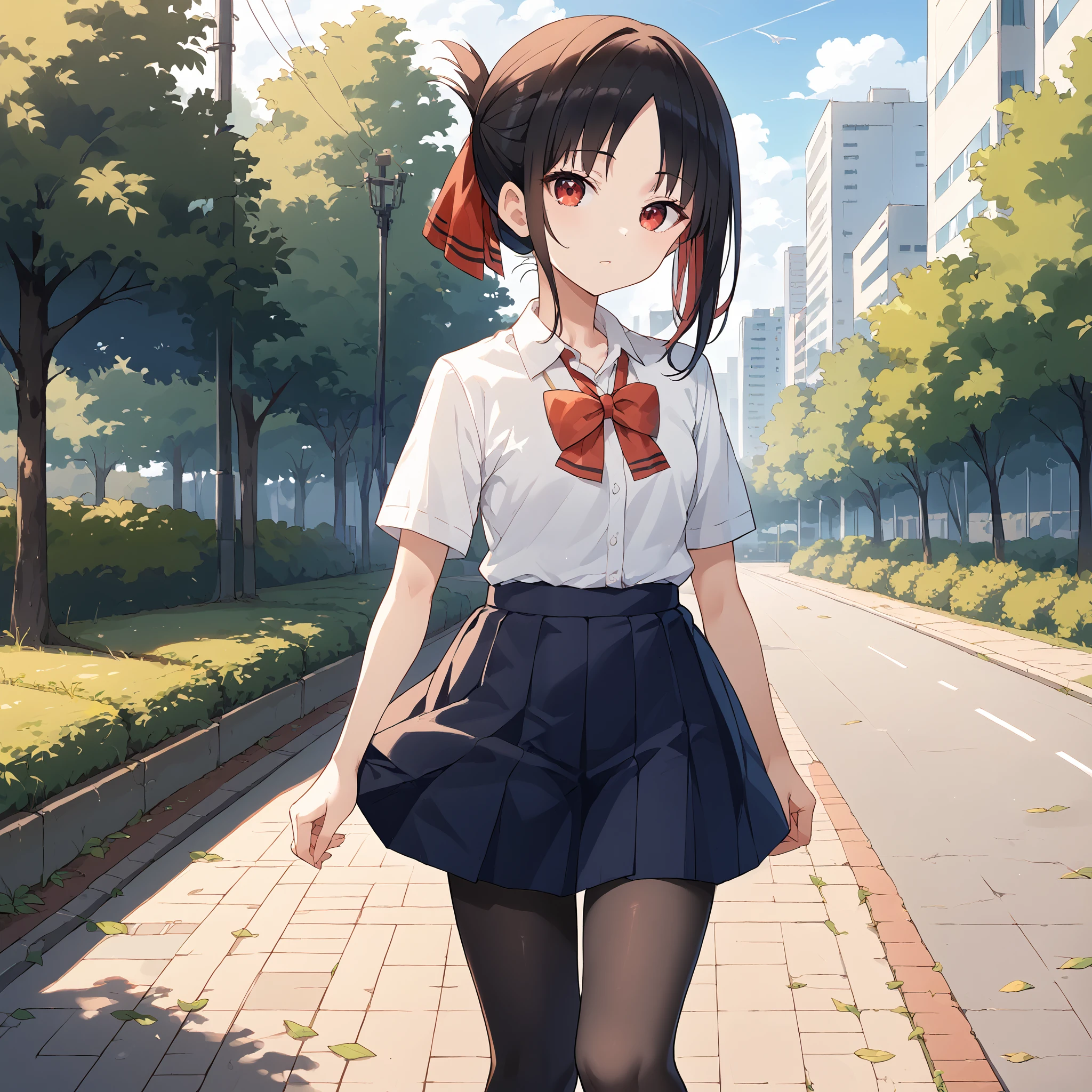 School Uniform : shinomiya kaguya, red eyes, black hair, short hair, folded ponytail, shuuchiin academy school uniform, black dress, hair ribbon, long sleeves, black sleeves, neck ribbon, red ribbon, collared dress, white sailor collar, black socks,Description