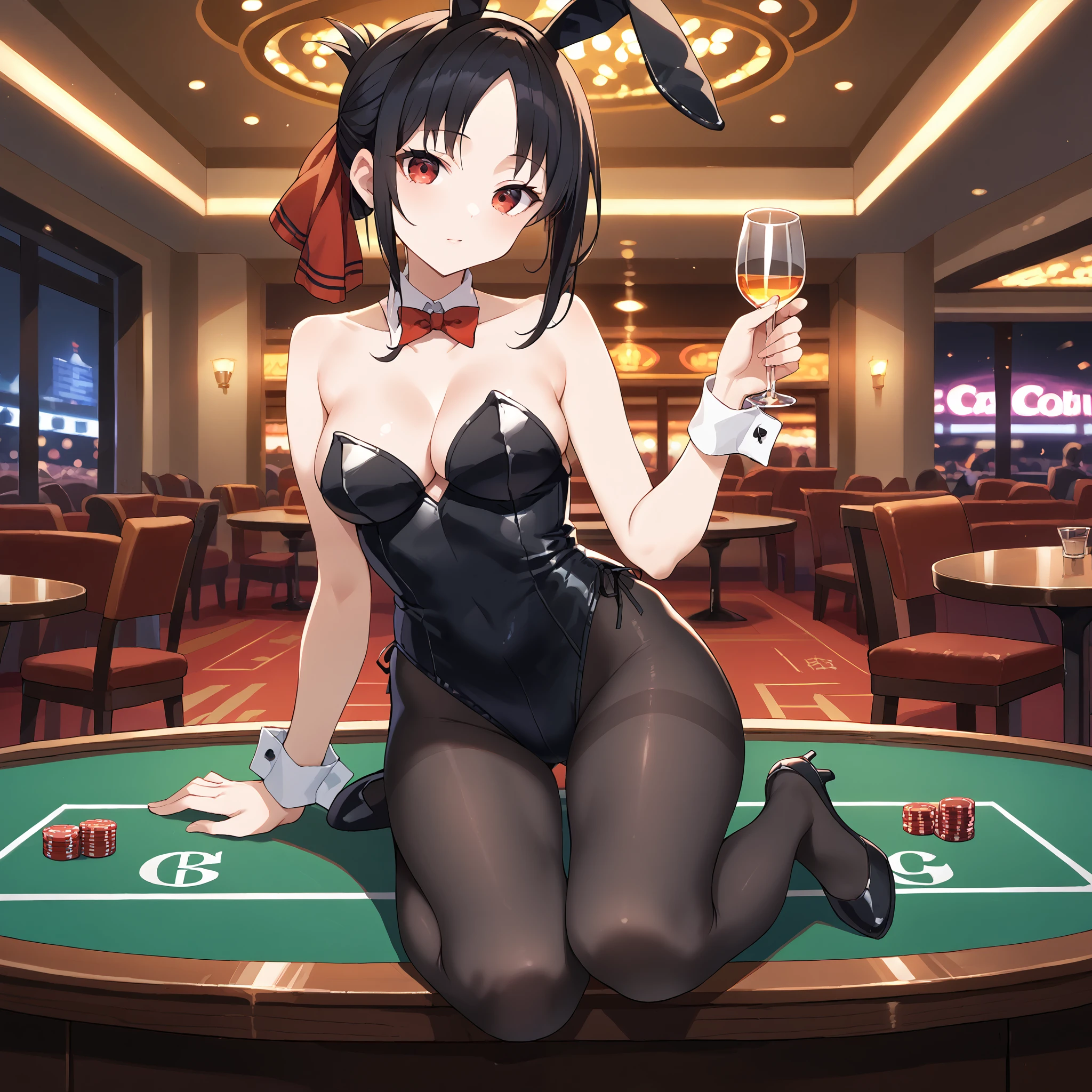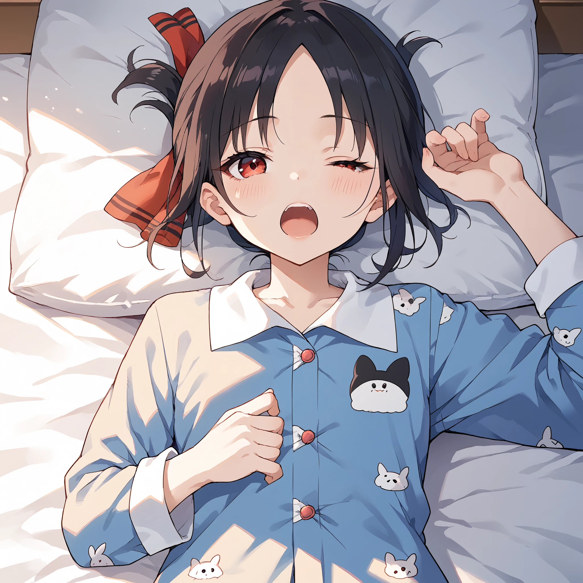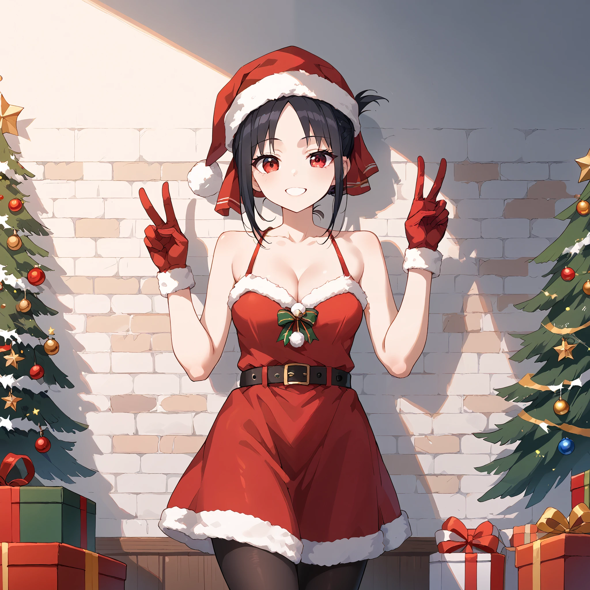 School Uniform : shinomiya kaguya, red eyes, black hair, short hair, folded ponytail, shuuchiin academy school uniform, black dress, hair ribbon, long sleeves, black sleeves, neck ribbon, red ribbon, collared dress, white sailor collar, black socks,Description