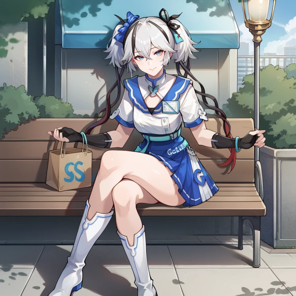 CamellyaWuwa, Fol002, Cml_Shp, white hair, grey eyes, twintails, streaked hair, black streaks, twisted hair, blue bow, hair bow, hairclip, hairpin, shirt tucked in, blue sailor collar, cropped shirt, blue undershirt, shirt under shirt, pleated skirt, blue skirt, short sleeves, white sleeves, white ankle boots, blue belt, blue trim, aqua belt, elbow gloves, black gloves, bead bracelet, fingerless gloves, aqua butterfly, clothing cutout, black ribbon, hair ribbon,Pajamas Outfit: