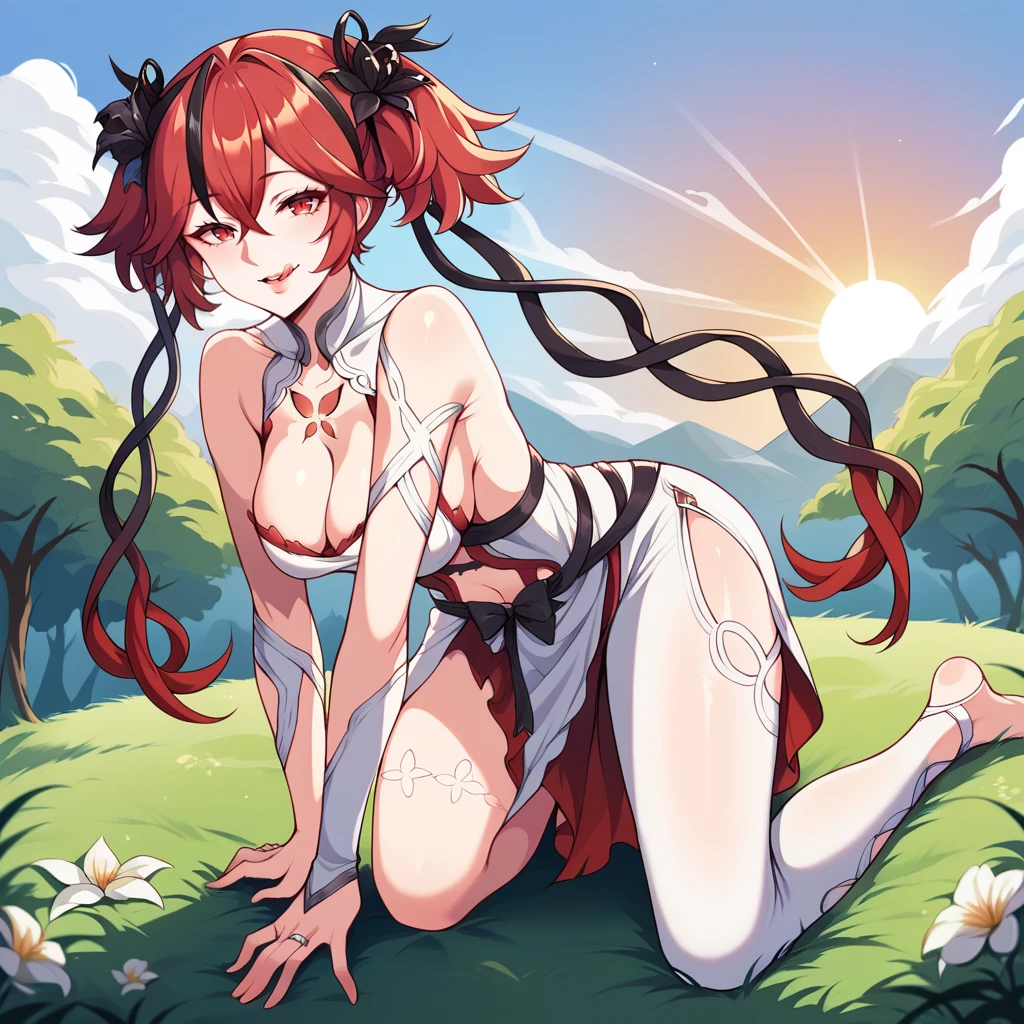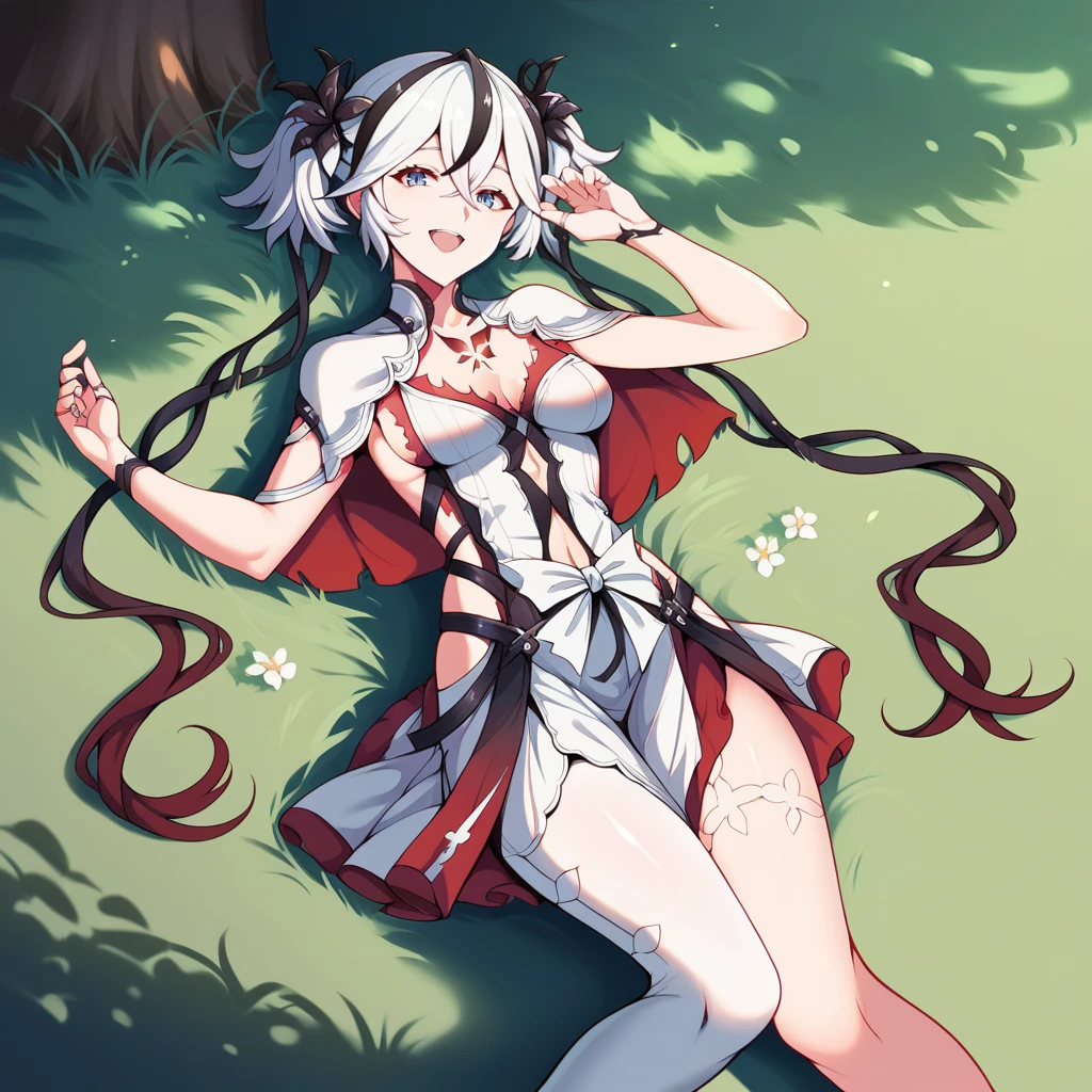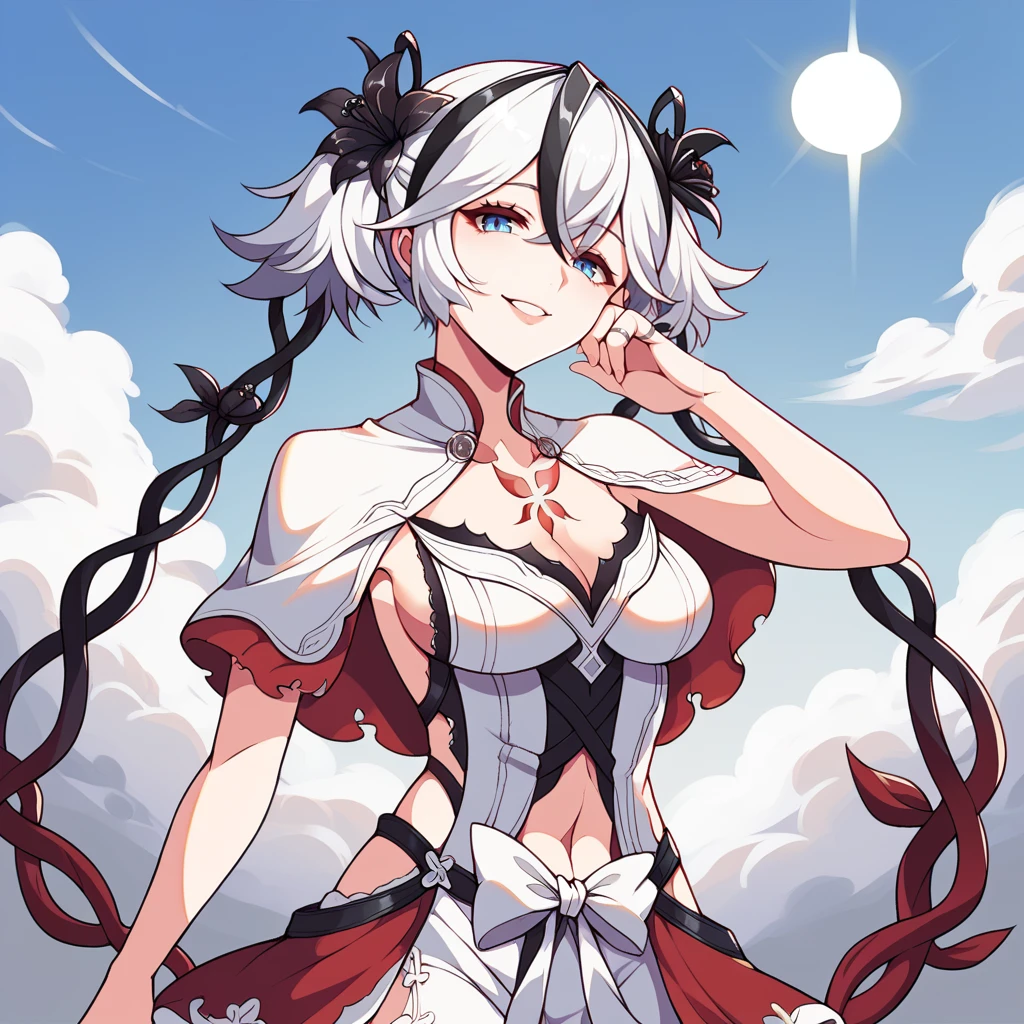 CamellyaWuwa, Fol001, Cml_Def, white hair, grey eyes, twintails, streaked hair, black streaks, twisted hair, collarbone, navel cutout, sleeveless dress, sideless outfit, burnt clothes, gold hanafuda earrings, red ribbon, hair ribbon, silver bracelet, black flower, hair flower, asymmetrical legwear, white pantyhose, single leg pantyhose, black strap, gold trim, thorns, white capelet, waist bow, white bow, camellya (wuthering waves), chest mark, leg tattoo, flower tattoo, open skirt, double-sided skirt, white skirt,Disclaimer: Love how Ai even with the ???? character tag can't train this outfit properly. Leg flowers ? Nuh uh. I'm starting to hate WuWa's default outfits (Except Jinhsi)... So in case you were wondering why the LoRA Banner is not Default outfit, that's your answer.
