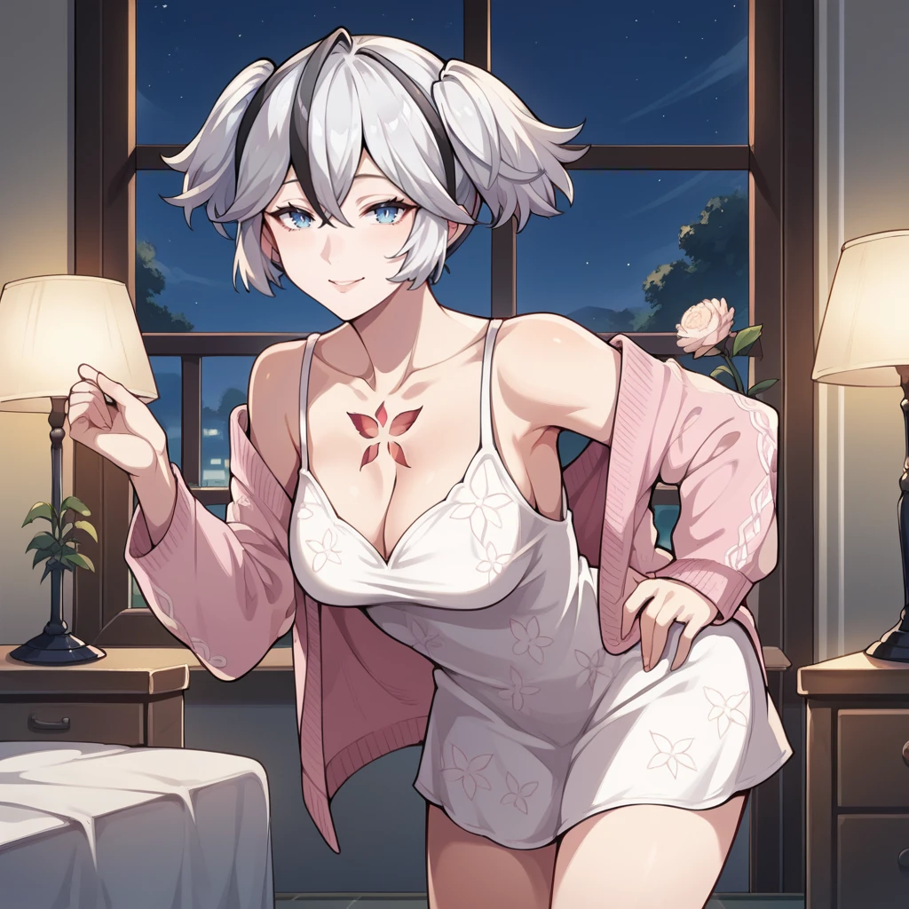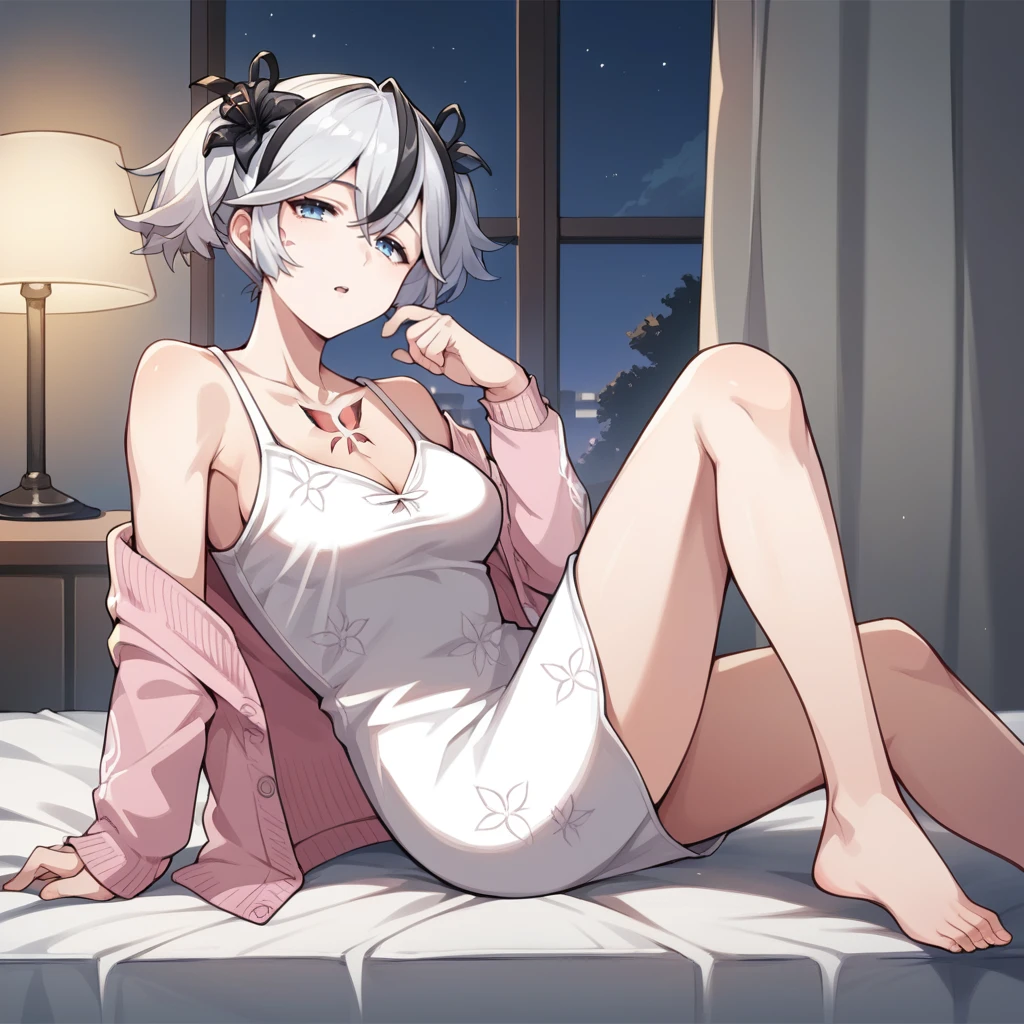CamellyaWuwa, Fol002, Cml_Paj, white hair, grey eyes, twintails, streaked hair, black streaks, open cardigan, single off shoulder, camisole, white nightgown, spaghetti straps, flower print, frills, pink pajamas, cardigan, pink cardigan, chest mark, short hair,Idol Outfit: