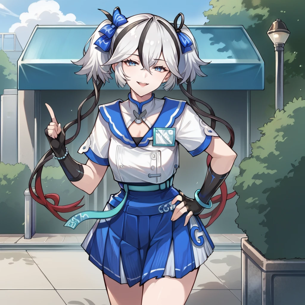 Cml_Shp, high-waist skirt, blue skirt, pleated skirt, aqua belt, crop top, white shirt, blue sailor collar, collared shirt, clothing cutout, short sleeves, bracelet, white sleeves, blue bow, black ribbon, fingerless gloves, elbow gloves, black gloves, The results of your generations are dependent on the additional LoRAs, weights, and models you use, so it may not work or come out as consistent as my sample images.